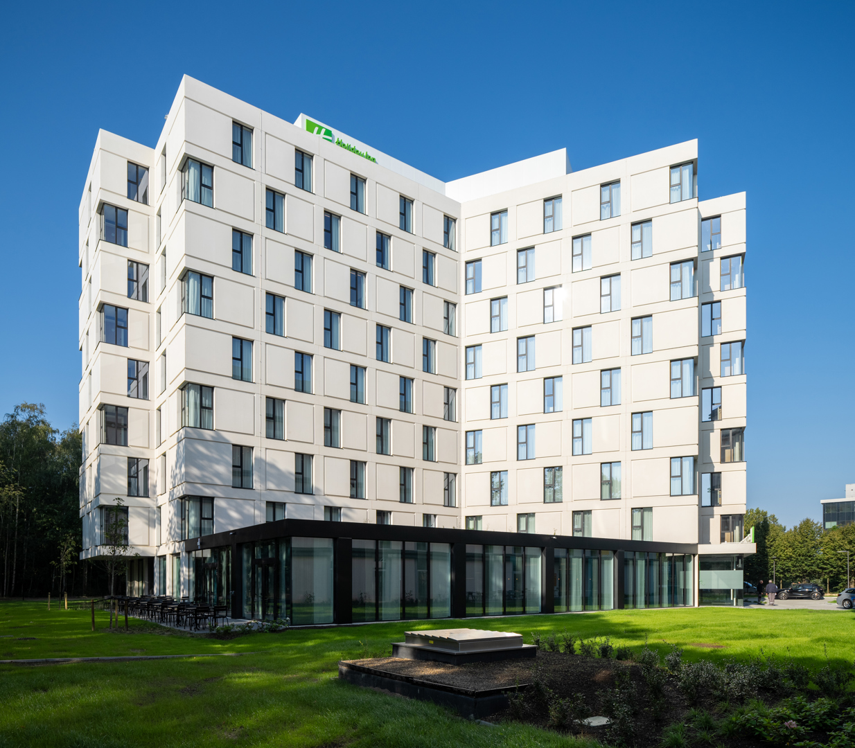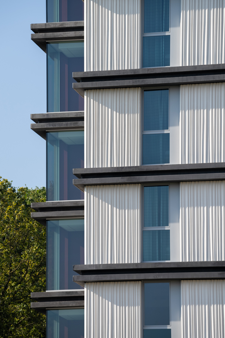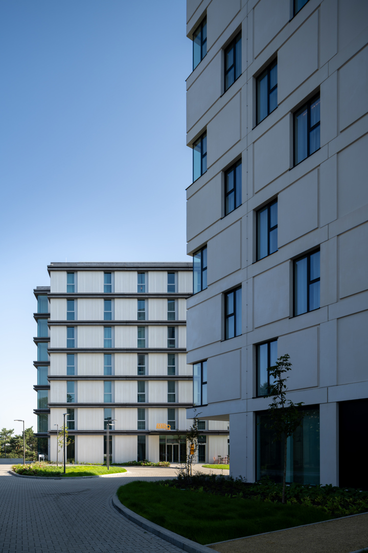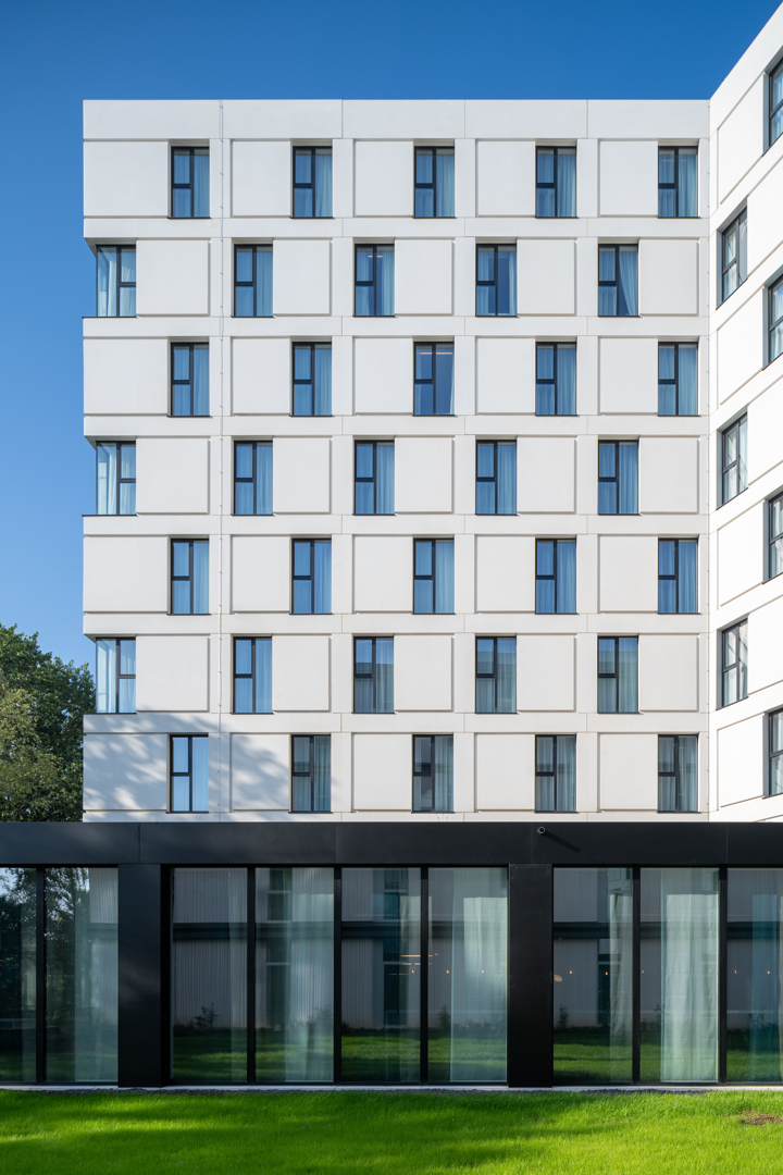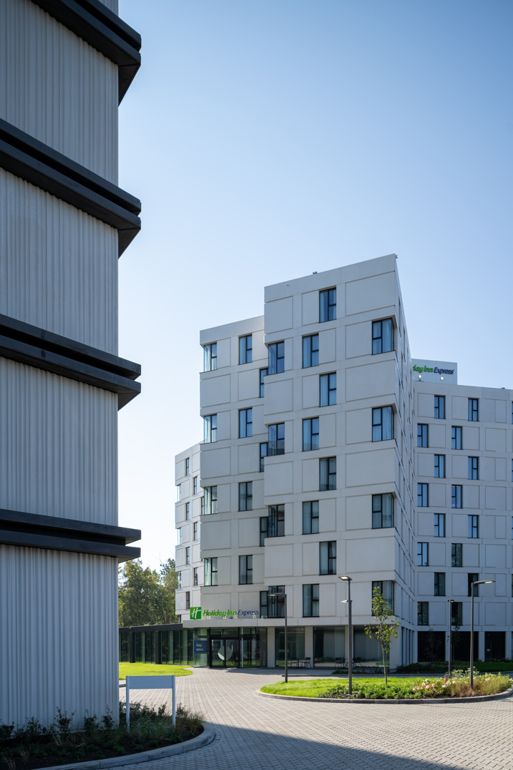 De twee hotels vormen afzonderlijke entiteiten met een duidelijke verwantschap. Het westelijk gelegen Trinity is een markant drietandig volume van 9 bouwlagen met 208 kamers, een alzijdige rastergevel en een levendige raamverdeling. Het gelijkvloers omvat ondersteunende functies zoals een restaurant. Het oostelijk gelegen U-flats is een 7-laags aparthotel met 160 kamers voor korte en middellange verblijven, inclusief kitchenette, fitnessruimte en guest laundry. De horizontale gevelbelijning met donkere boorden en afwisselende beglazing en betonnen panelen creëert een sierlijk reliëf dat warmte en elegantie toevoegt. Beide volumes combineren functionaliteit, contextbewust ontwerp en hoogwaardige materialisering tot een harmonieus geheel.
