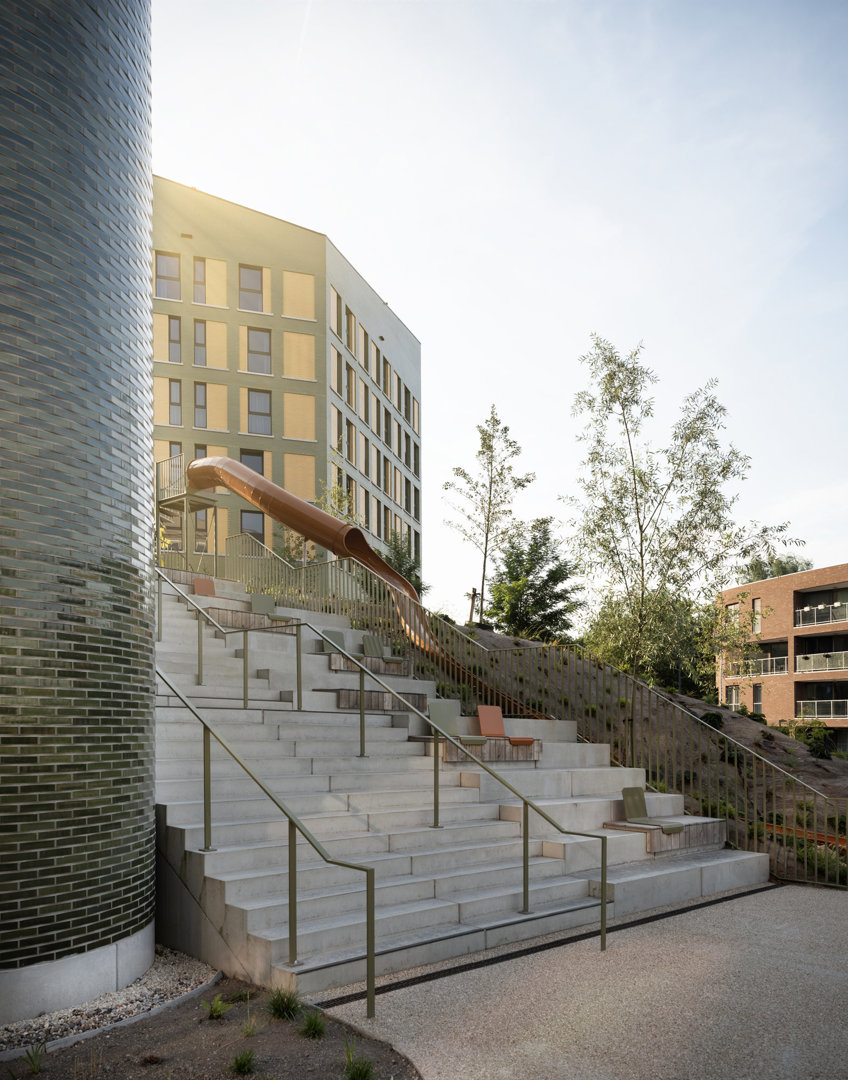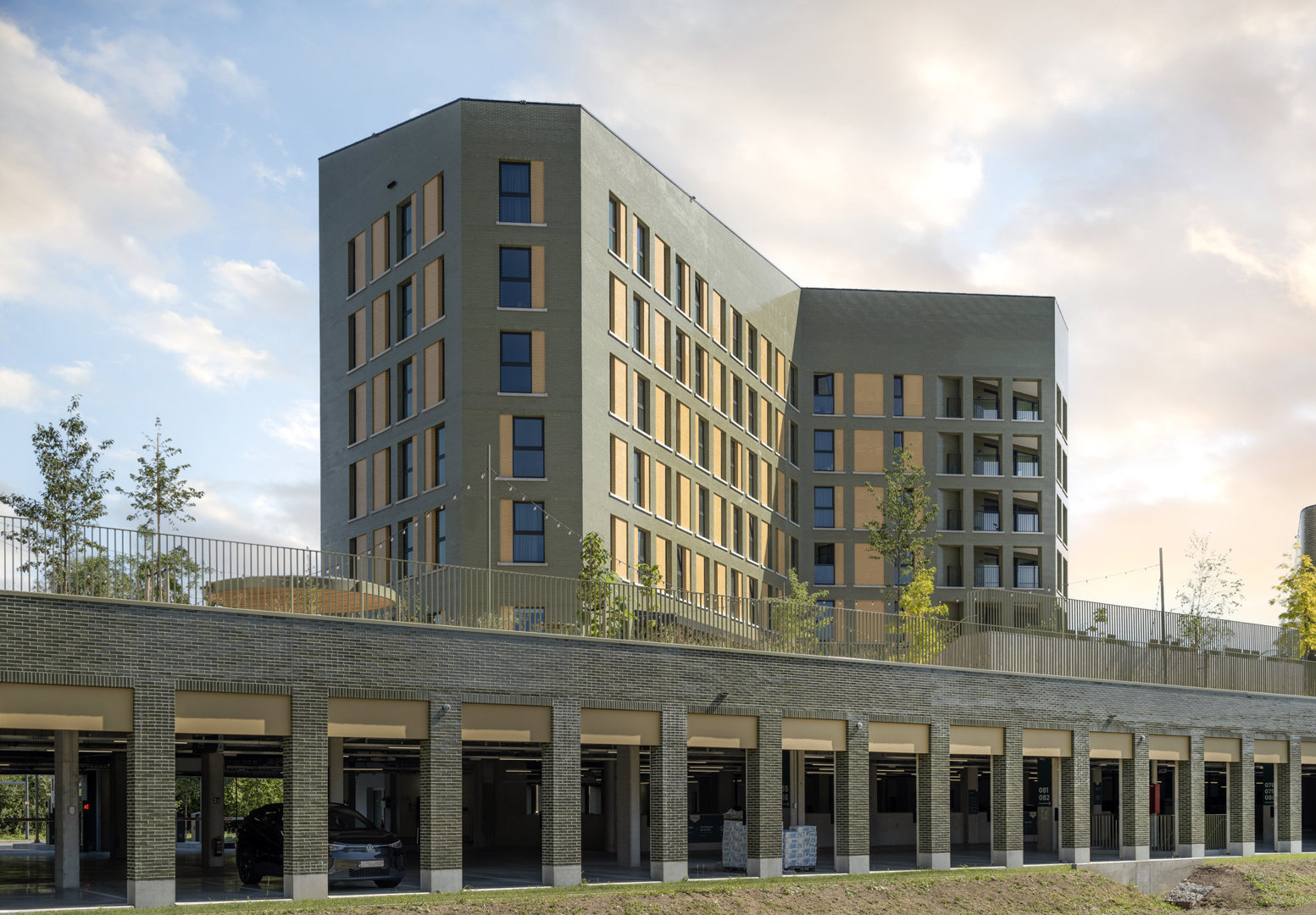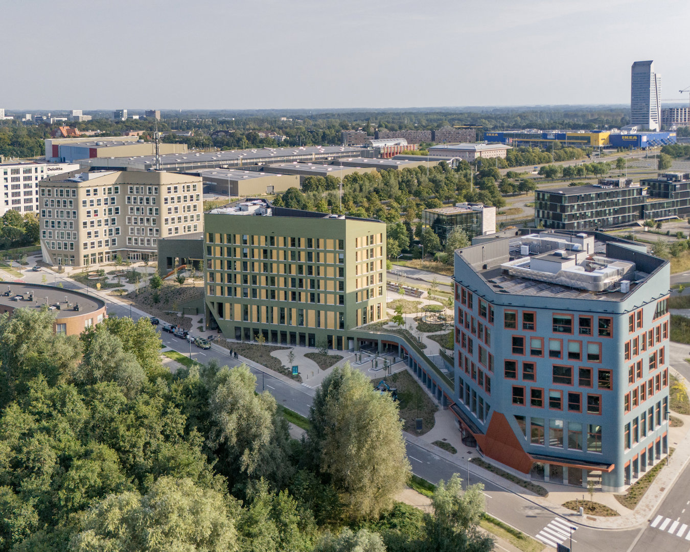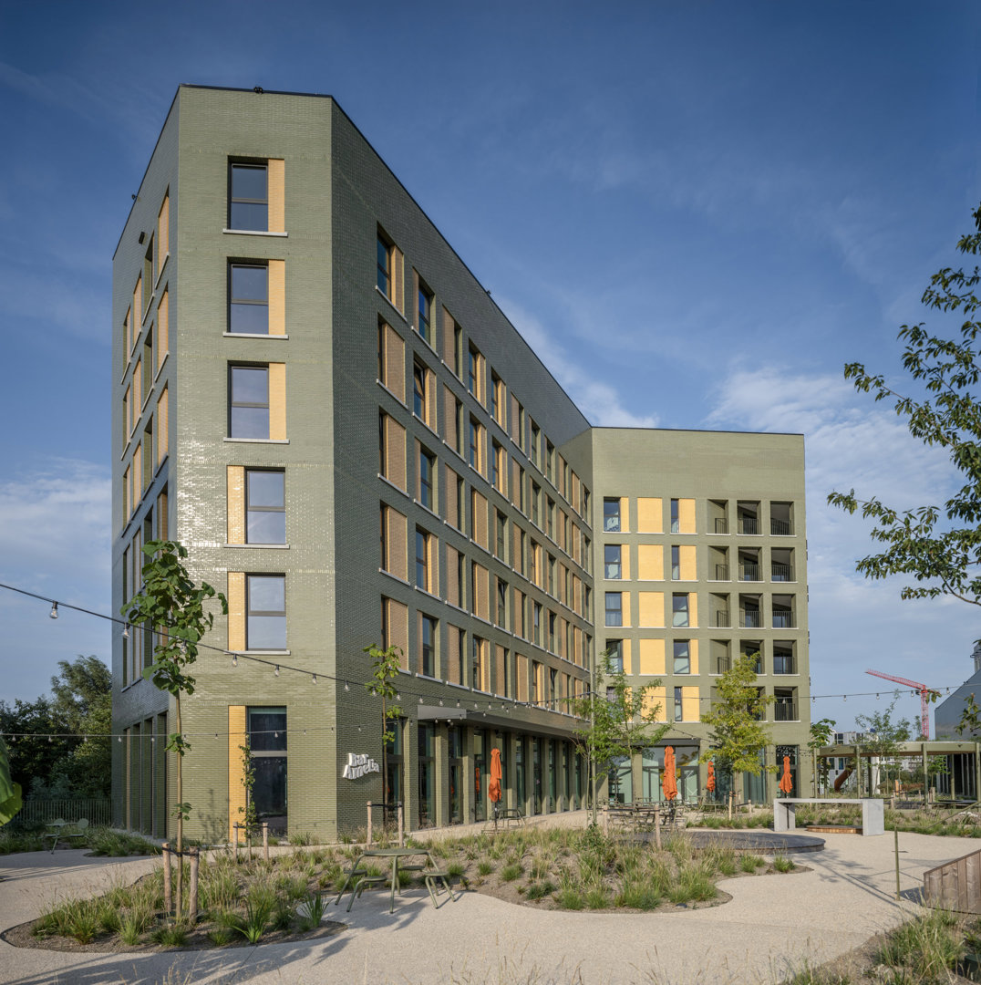 – Toekomstbestendige architectuur: vorm, schaal en open structuur laten in de toekomstig eenvoudig herbestemmen toe zonder ingrijpende verbouwingen. – Robuuste, veilige en ecologische materialen: onderhoudsarme geglazuurde keramische gevelstenen, maximale isolatie met recycleerbare en onbrandbare steenwol; inerte gebouwschillen met doordachte openingen, lichte invullingen en houtconstructies; geavanceerde technieken zoals geothermie, zonnepanelen, betonkernactivering en regenwaterrecuperatie. – Duurzame mobiliteit: een sterke mobiliteitshub en strategische ligging maken de site vlot bereikbaar voor alle modi: fietsers via ruime stallingen en sanitair, gemotoriseerd verkeer via een flexibel logistiek niveau en voetgangers via een doorwaadbare groene campus.