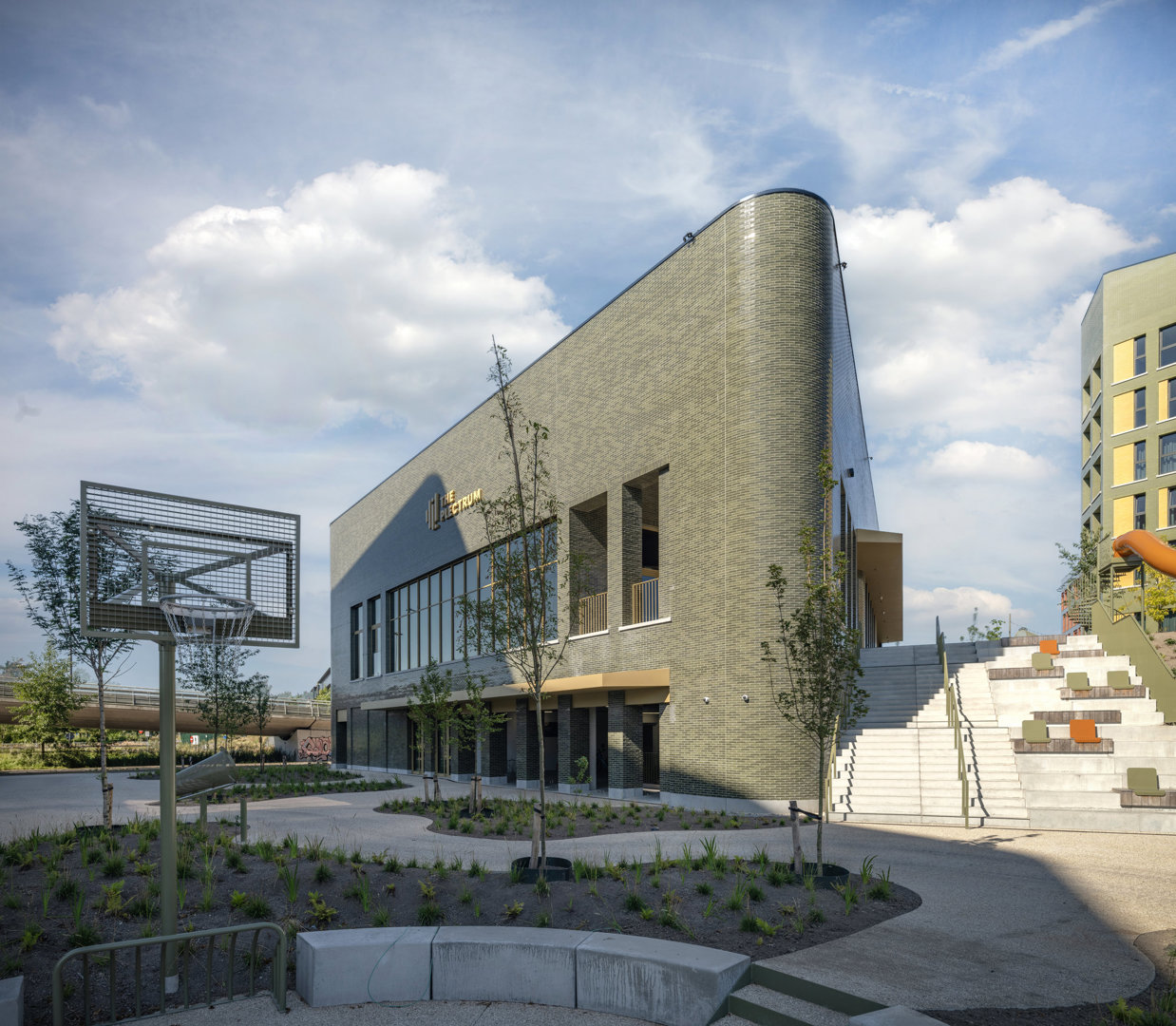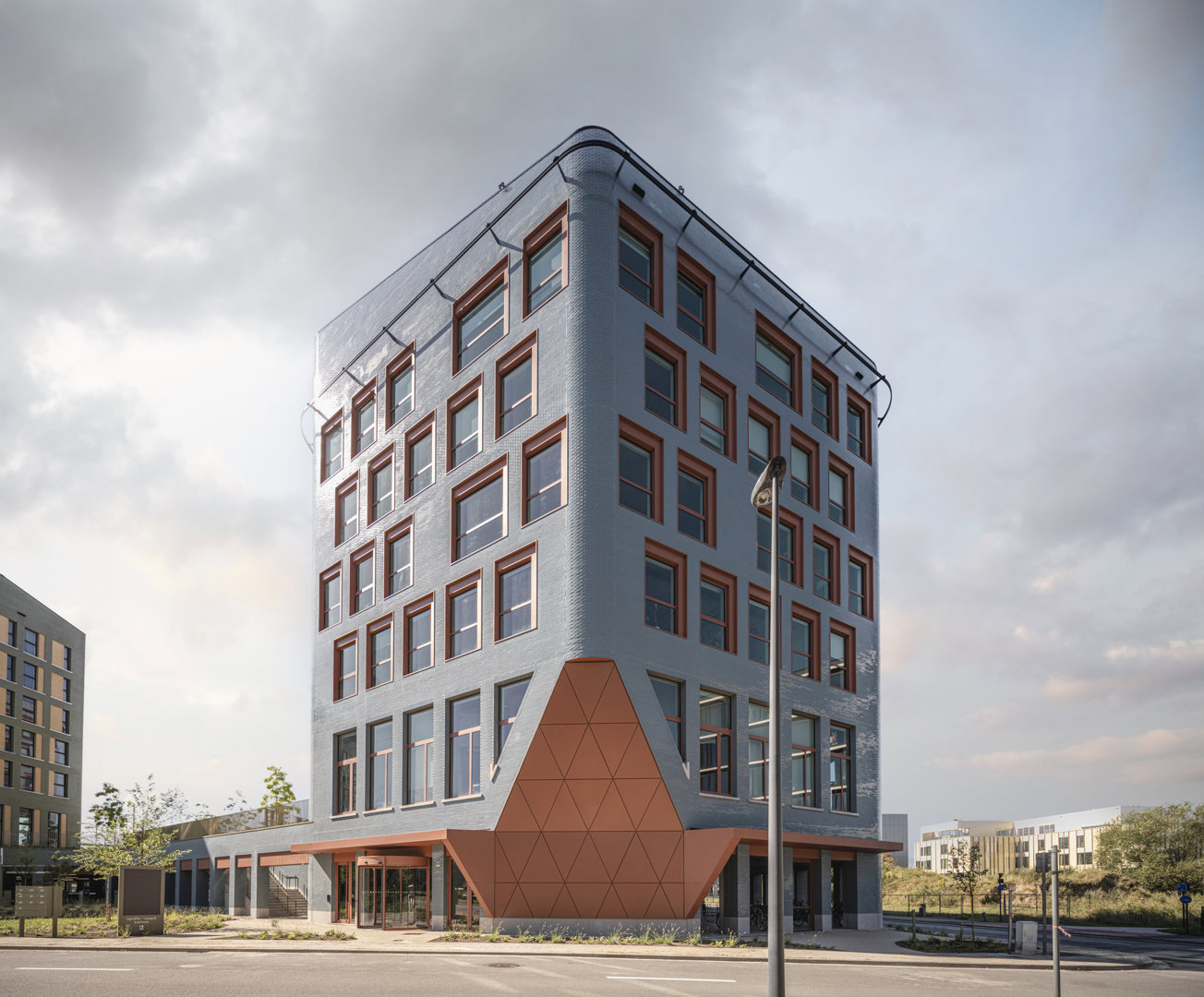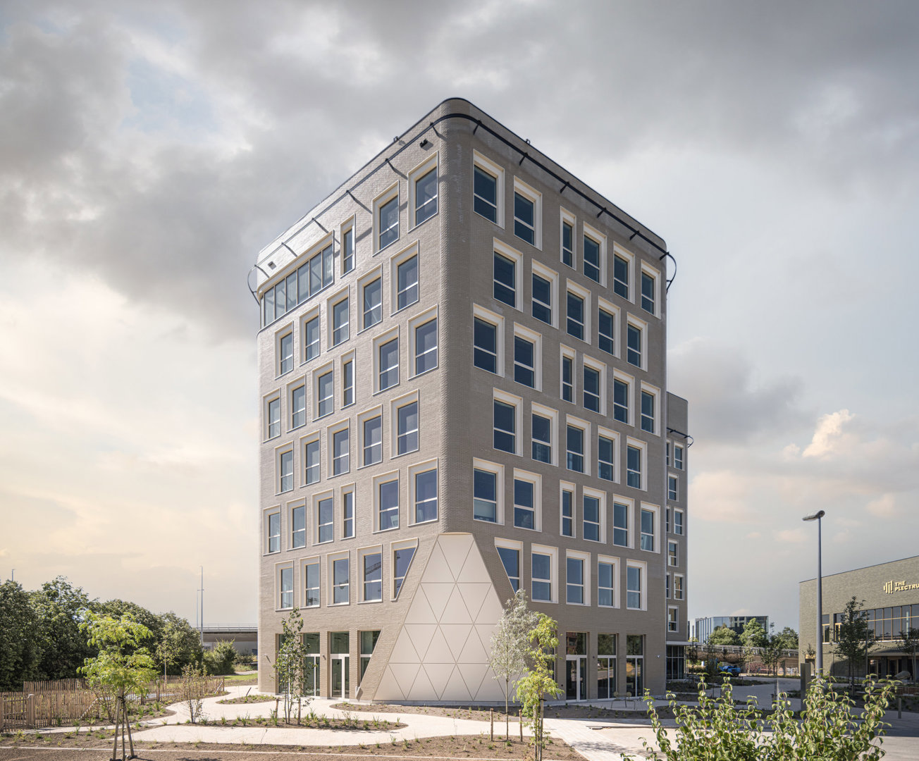 Het project toont hoe een complexe puzzel kan worden vertaald naar een helder, ambitieus en toekomstgericht geheel: een campus die tegelijk intensief, groen, flexibel en mensgericht is. De atypische vormentaal – vijfhoeken, gebogen hoeken, schuine gevelvlakken en spiegelende oppervlakken – genereert doorheen de dag veranderende perspectieven, kleuren en lichtinval. Deze dynamiek wordt versterkt door het parklandschap en de seizoenen, waardoor de plek een uitgesproken energie en vooruitgang uitstraalt. Zo wil de architectuur een katalysator zijn voor een omgeving die vandaag nog wordt bepaald door een steriel en achterhaald ruimtelijk uitvoeringsplan en dito voorschriften.