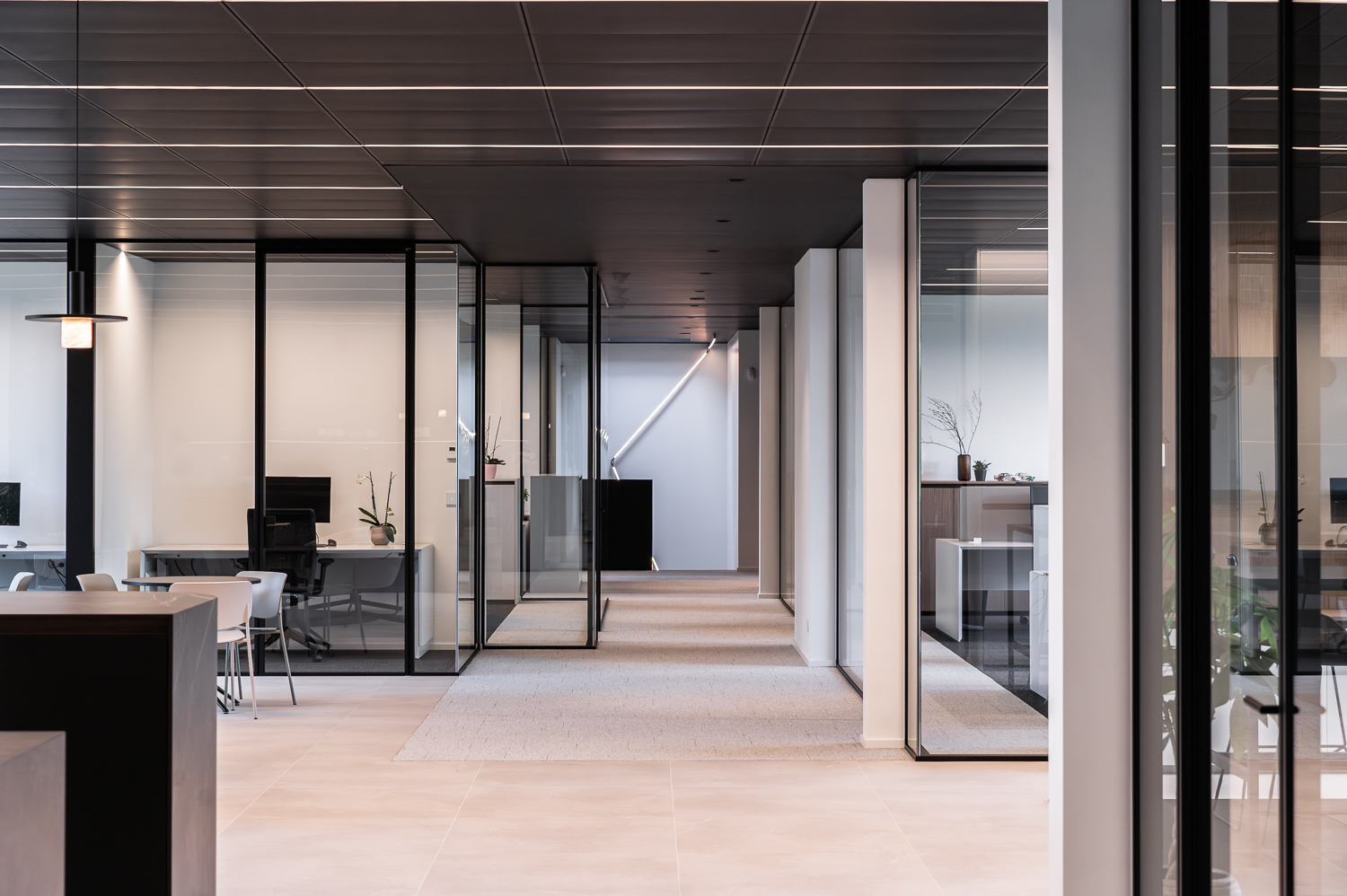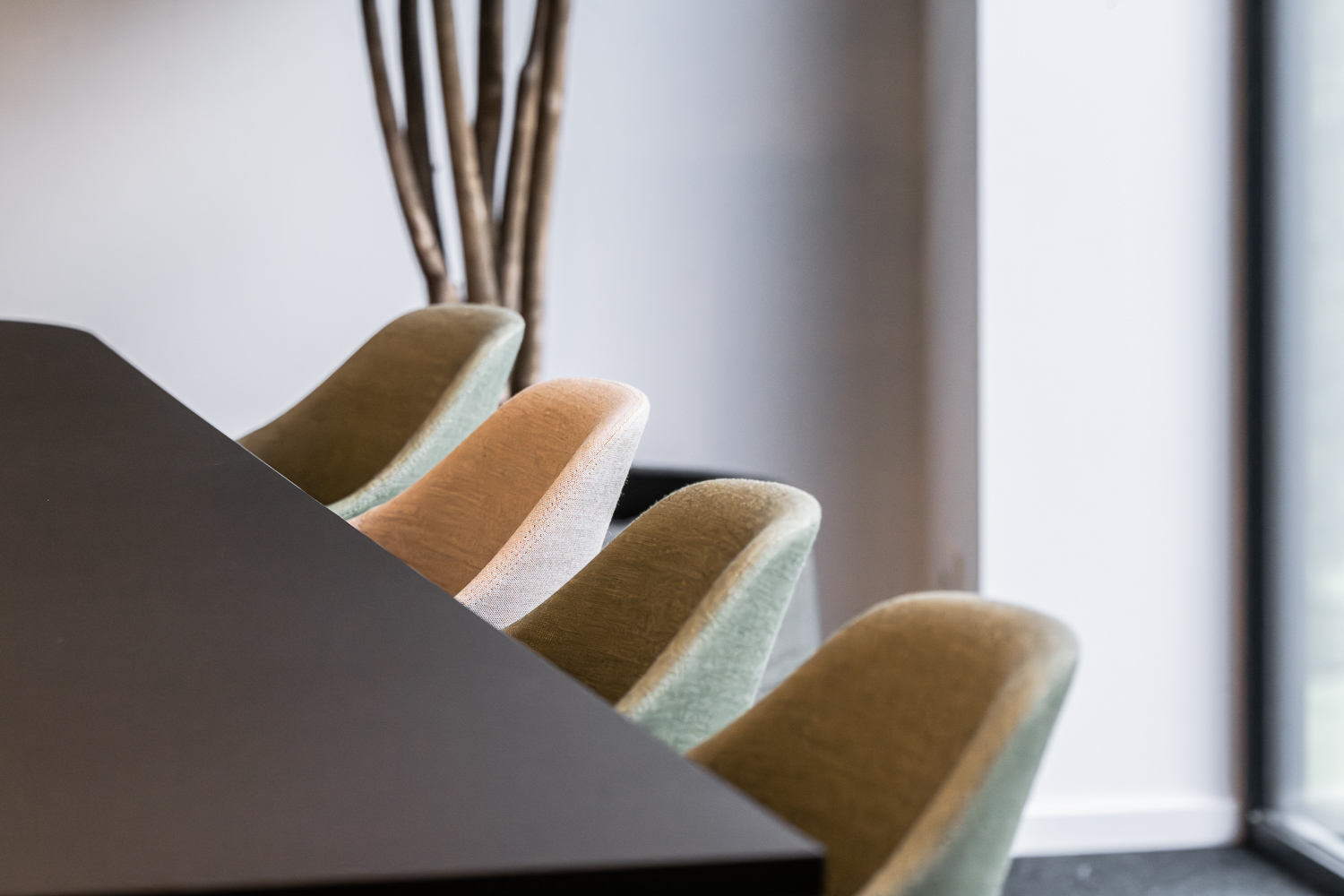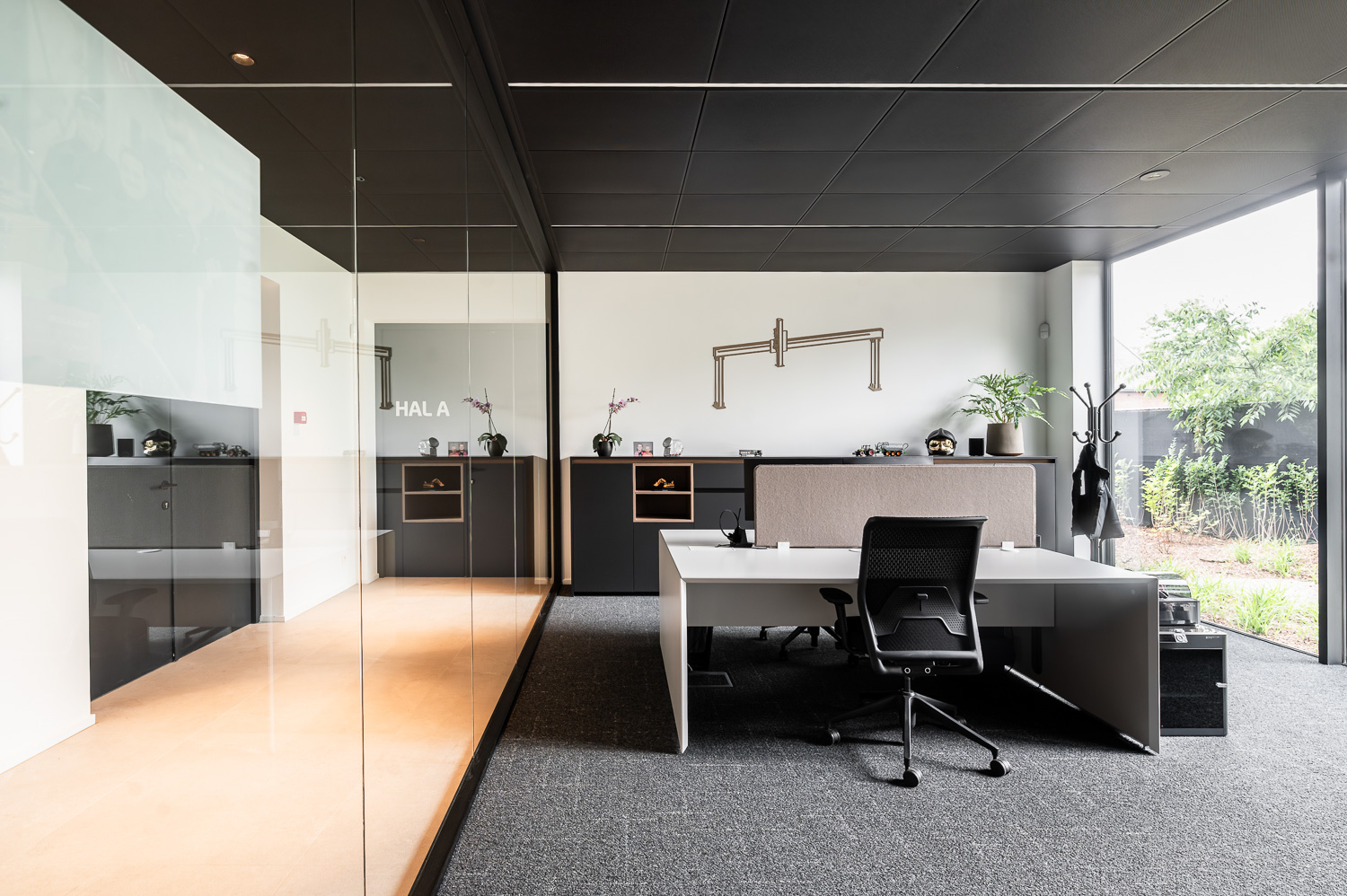 De grootste uitdaging was om in een technisch bedrijf maximaal in te zetten op welzijn. We realiseerden een sterke link met buiten: grote glaspartijen en groendaken brengen de natuur tot in de kern. In het interieur kozen we voor rust via notelaar, elegante stoffen en warme materialen. Een spel van afgeronde vormen en strakke geometrie zorgt voor verfijning. Ook technisch ligt de lat hoog: alle installaties zijn tot in detail uitgelijnd. De zaakvoerders streefden naar een afwerking op het niveau van een private woning. Hiervoor vonden we de juiste vakmensen om dit opmerkelijke en persoonlijke resultaat te bereiken.