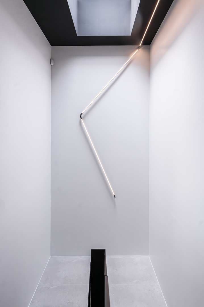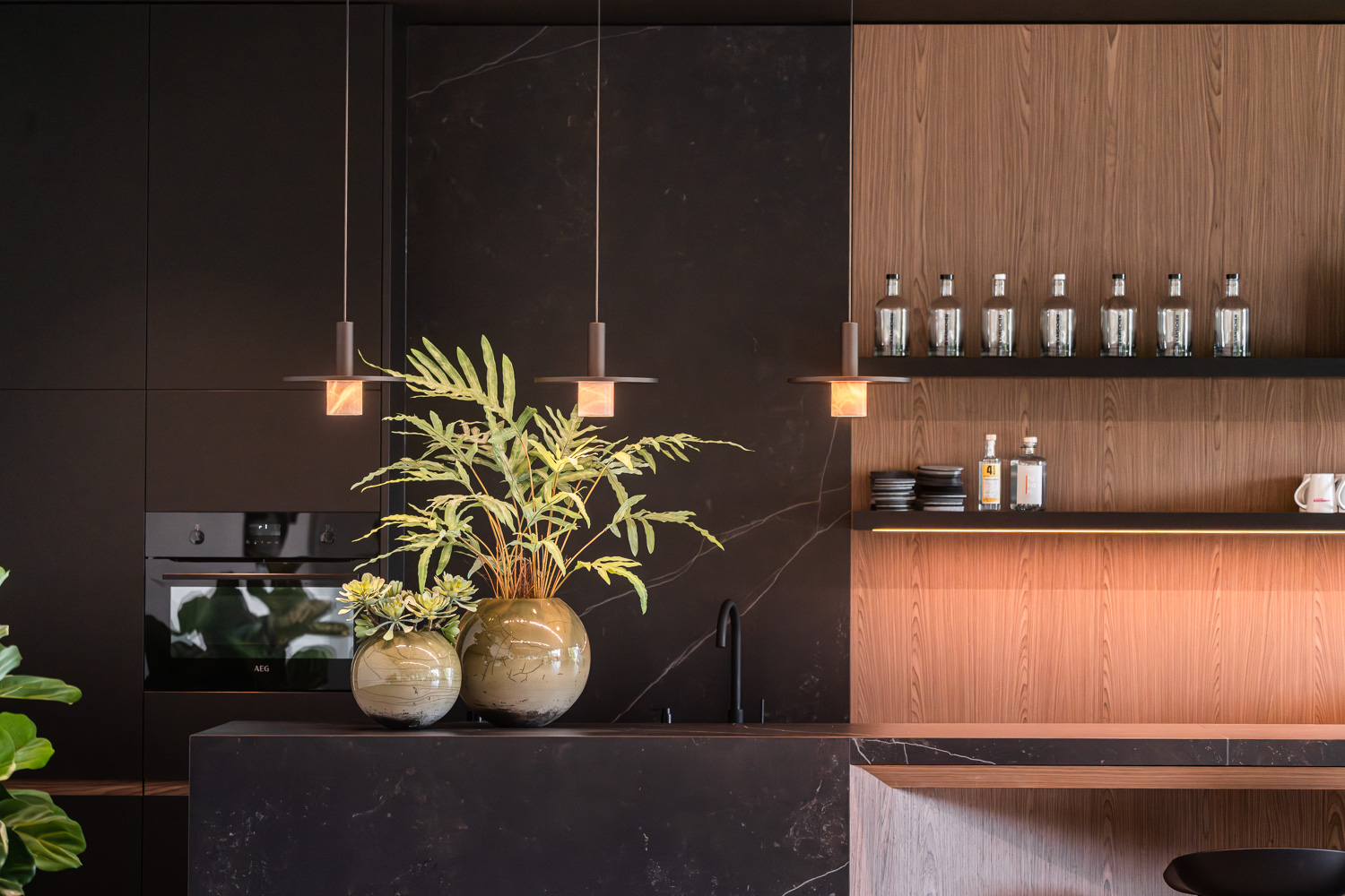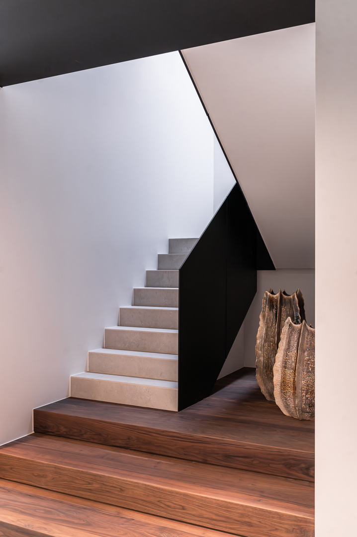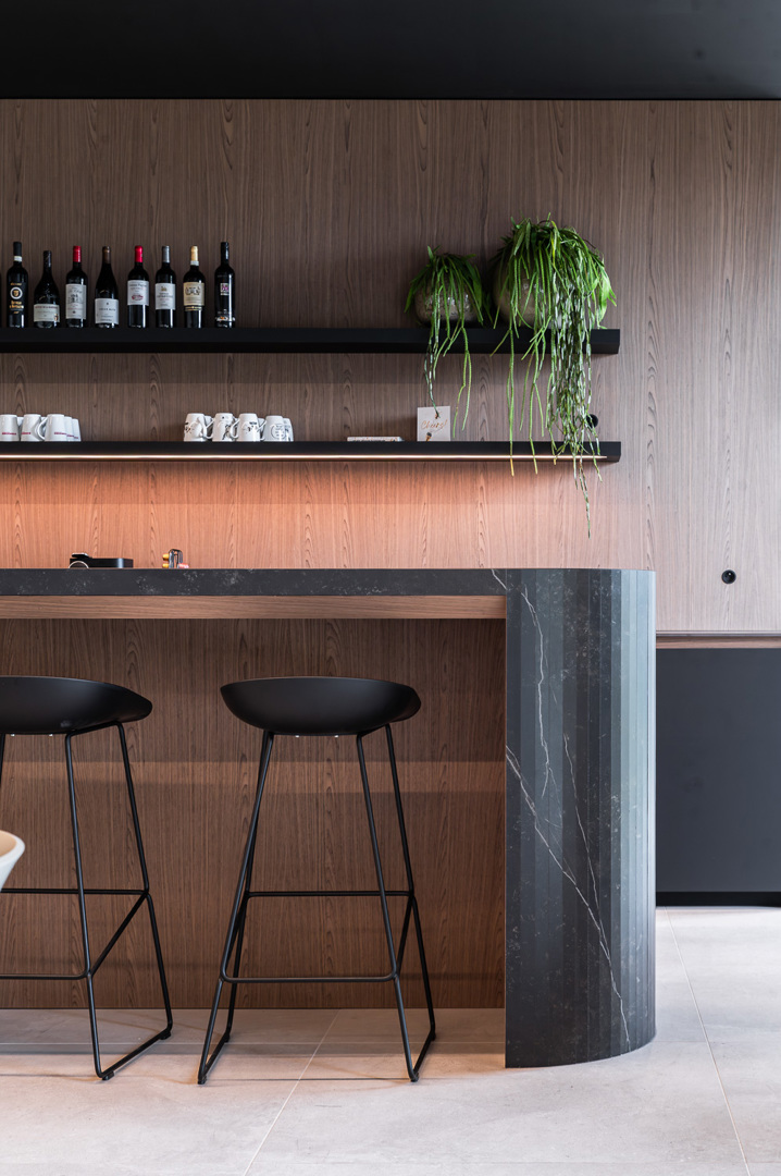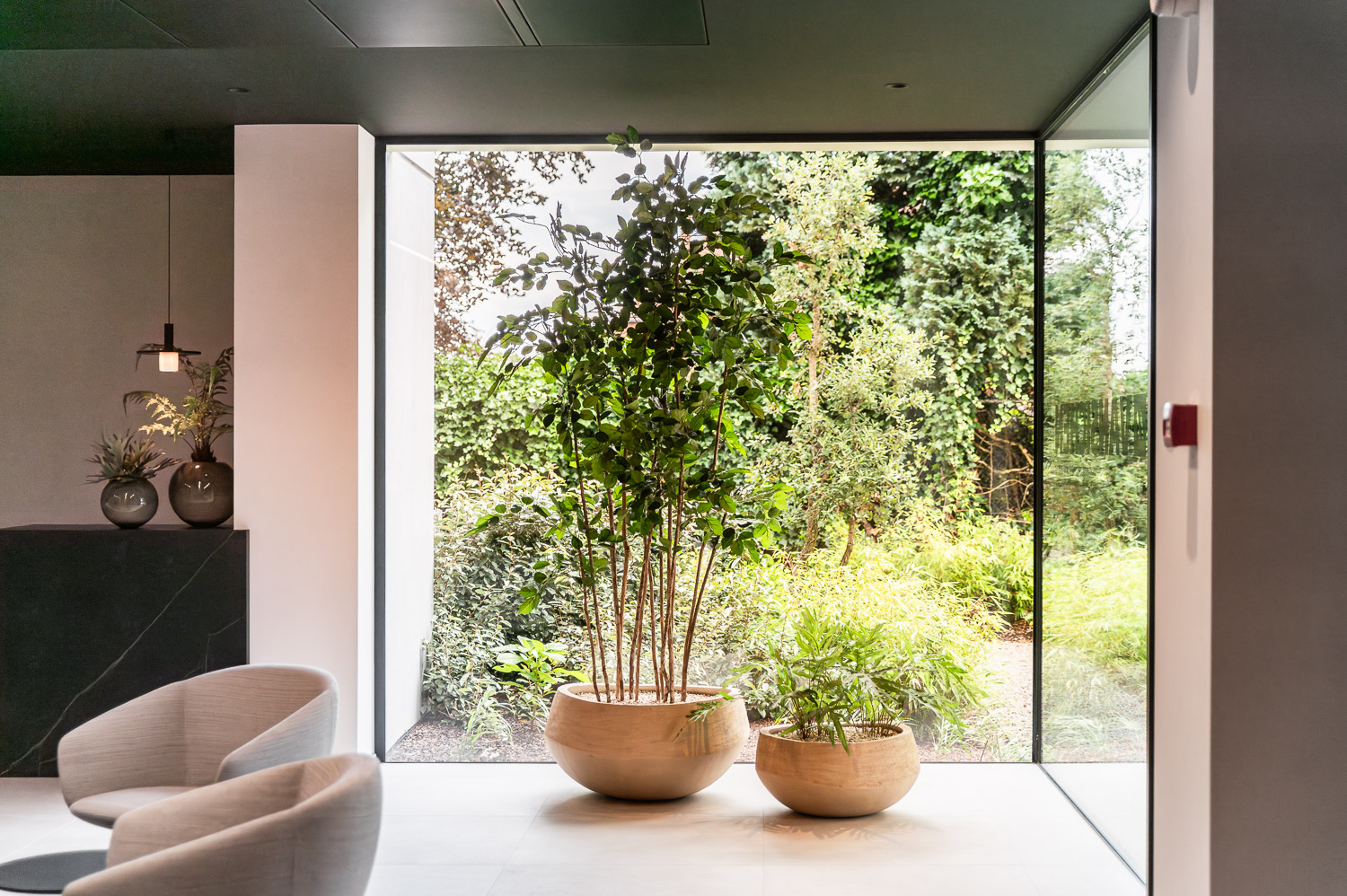 De grootste uitdaging was om in een technisch bedrijf maximaal in te zetten op welzijn. We realiseerden een sterke link met buiten: grote glaspartijen en groendaken brengen de natuur tot in de kern. In het interieur kozen we voor rust via notelaar, elegante stoffen en warme materialen. Een spel van afgeronde vormen en strakke geometrie zorgt voor verfijning. Ook technisch ligt de lat hoog: alle installaties zijn tot in detail uitgelijnd. De zaakvoerders streefden naar een afwerking op het niveau van een private woning. Hiervoor vonden we de juiste vakmensen om dit opmerkelijke en persoonlijke resultaat te bereiken.
