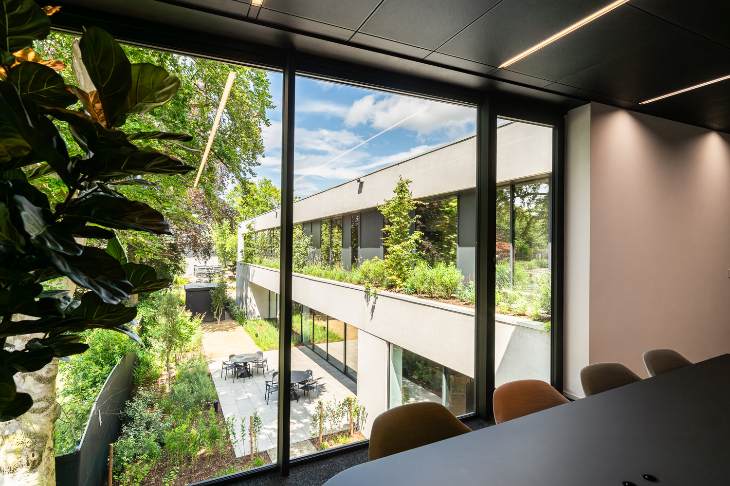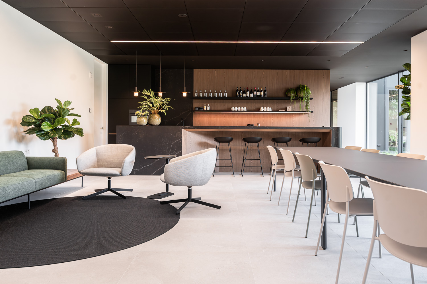 In dit ontwerp staan de mensen en hun dagelijks geluk centraal. Het welbevinden wordt gevoed door een constante visuele link met de natuur: grote glaspartijen en weelderige groendaken brengen rust en versterken de concentratie. In plaats van kille kantoortrends is er gekozen voor een tastbare, huiselijke kwaliteit met warm notelaar en een afwerkingsniveau dat aanvoelt als een private woning. De riante lunchruimte met bar fungeert als een informele ontmoetingsplek die de onderlinge verbinding stimuleert en ruimte biedt voor echte ontspanning. Tot slot garandeert het geothermische klimaatplafond een tochtvrij en optimaal binnenklimaat, wat elke werkdag gezond en aangenaam maakt.