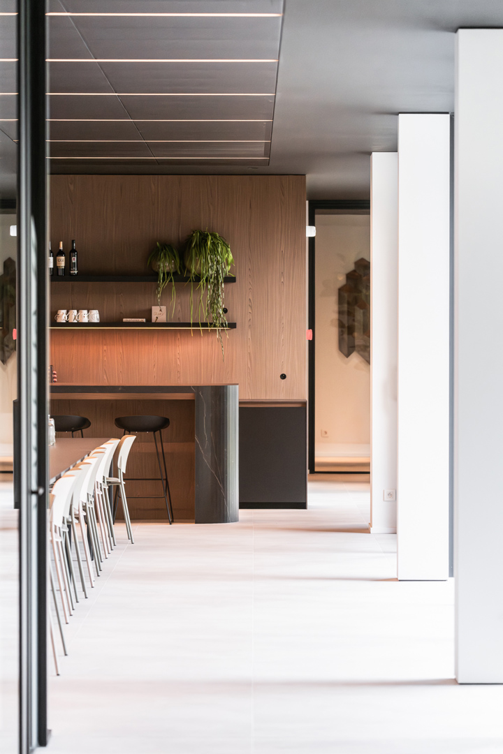 Dit project betreft de reconversie van een oude wafelfabriek in Hasselt naar een modern kantoor (1.150 m²) met productiehal voor Vansichen Lineairtechniek. De opdracht: creëer een werkomgeving die de bedrijfscultuur ademt en de internationale ambitie van dit familiebedrijf weerspiegelt. Het interieur biedt geborgen werkplekken per team, met een riante lunchruimte als sociaal hart. Deze multifunctionele plek met verfijnde bar dient voor de dagelijkse lunch én als eventlocatie. Centraal stond de kruisbestuiving tussen technische expertise en een menselijke schaal. Het resultaat is een plek waar medewerkers in rust werken en bezoekers de kwaliteit van deze wereldspeler in lineaire technologie ervaren.
