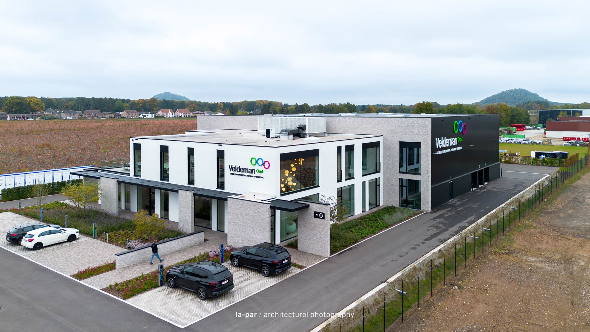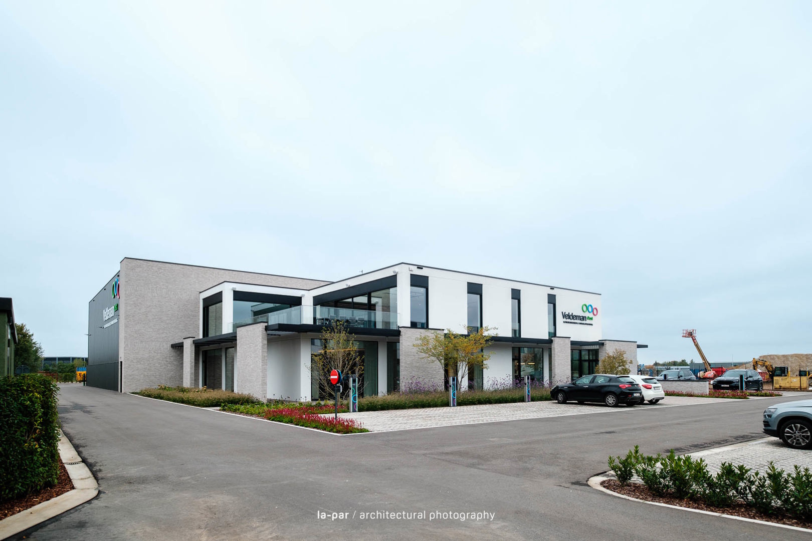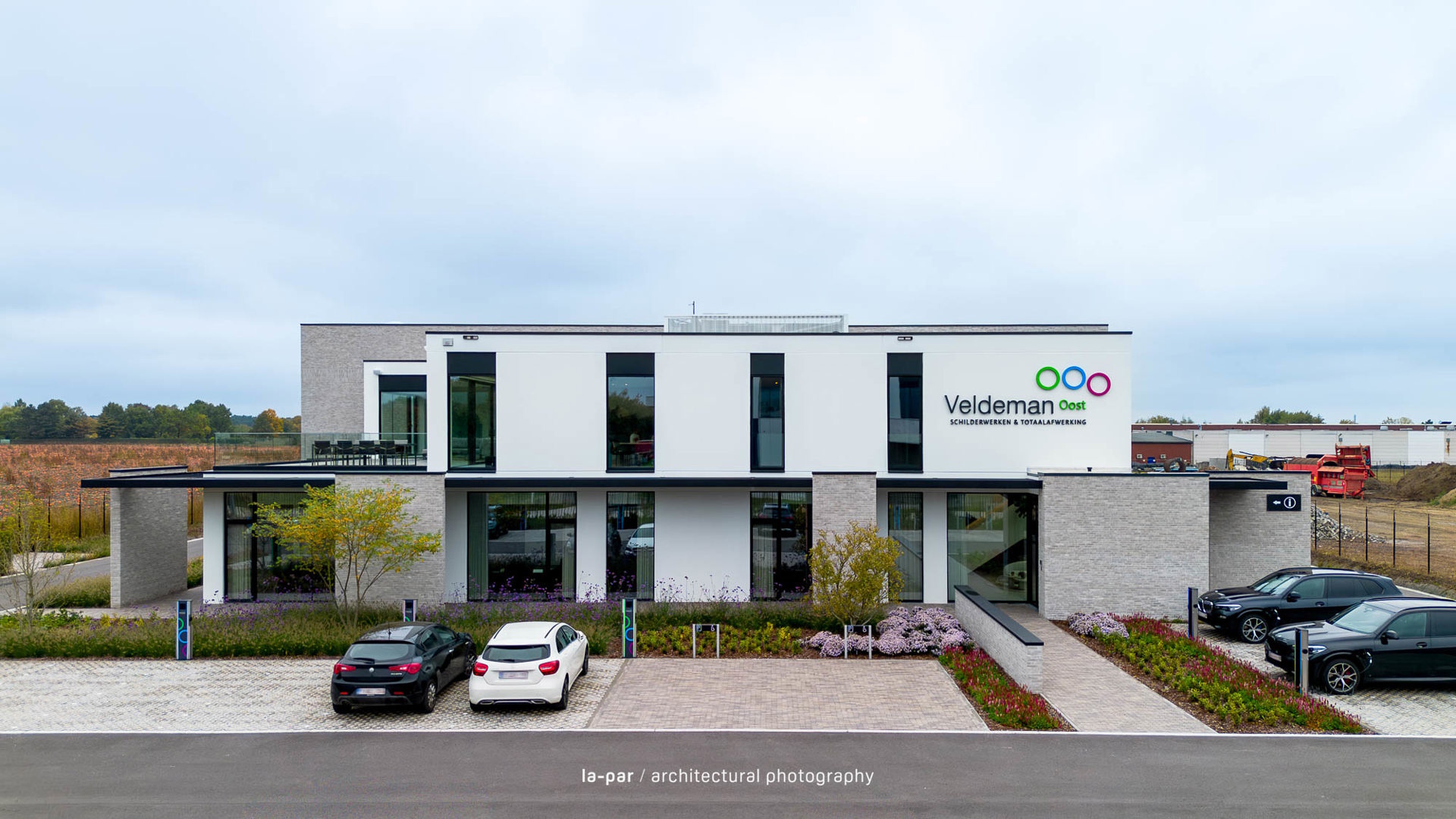 Veldeman Oost is een sterk groeiend bedrijf in interieurafwerking. Vanuit een beperkte kantoorruimte groeiden Peter en Vital naar een ambitieus project op een perceel van 1 ha in Opglabbeek, met een kantoor voor 50 medewerkers en een industriehal van 1.200 m², uitbreidbaar tot 2.400 m². Het ontwerp integreert architectuur, interieur en omgeving tot één geheel, met aandacht voor vakmanschap, detail en afwerking. Een efficiënte indeling met centrale kern en lichtrijke werkplekken zorgt voor een kwalitatief werkklimaat. Materialen zoals betonpanelen, lichtgrijze gevelsteen en zwart aluminium worden gecombineerd met groenaanleg voor een evenwichtige uitstraling. Het resultaat is een functionele en warme werkomgeving waar werken, overleggen en ontspannen samenkomen.
