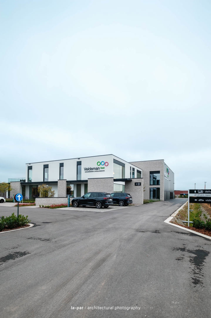 De realisatie van Veldeman Oost vertrekt vanuit de ambitie om een kleinschalige organisatie te laten doorgroeien naar een toekomstgerichte, schaalbare werkomgeving. De nood aan een “blank canvas” leidde tot een perceel dat zowel huidige noden als toekomstige uitbreiding ondersteunt. Een doordacht masterplan zorgt voor een heldere scheiding tussen logistiek en bezoekers, met ruimte voor een groene, representatieve omgeving. Er werd gekozen voor een sobere industriële structuur, gecombineerd met een verfijnde afwerking die het vakmanschap weerspiegelt. Architectuur, interieur en omgeving vormen één geheel, met aandacht voor daglicht, akoestiek en comfort, resulterend in een kwalitatieve en coherente werkomgeving.