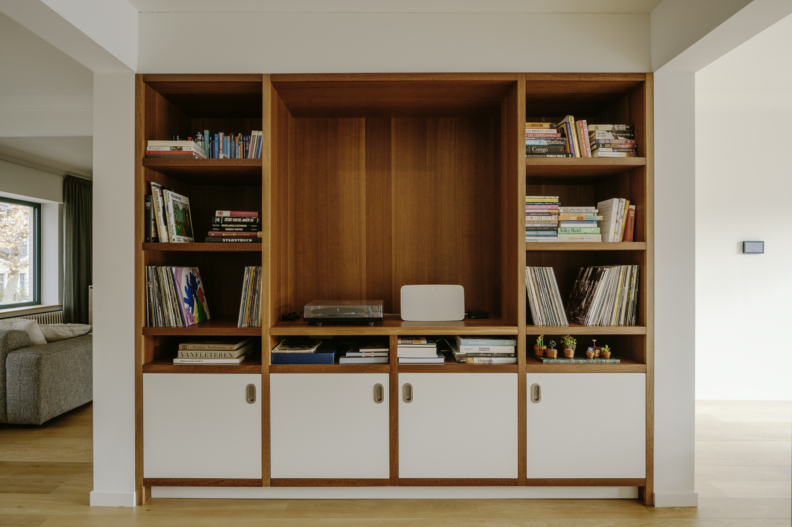 De opdracht bestond erin om van een nogal banale rijwoning van 3 lagen uit 1954 een aangenaam en warm woonhuis te maken. De gelijkvloerse verdieping bevatte enkel een garage, technische ruimte en bergruimten. Het contact met de tuin was niet wezenlijk. Op de eerste verdieping werd gewoond, op de 2de verdieping geslapen. De woning was enkele jaren geleden, in aanloop naar verkoop, grotendeels gerenoveerd. Structureel werd toen aan de woning niets gedaan. De nieuwe inkleding was zogenaamd modern, maar zonder enige samenhang in materiaal, kleur enz., een soort van ‘clean’ invulling zonder ziel. De ligging en grootte van de woning was voor onze opdrachtgevers doorslaggevend voor de aankoop, maar een make-over was dan wel een voorwaarde. Dat laatste hield dus de opdracht in.