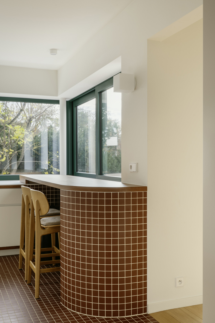 Het gelijkvloers voorzien van twee werkplekken voor de opdrachtgevers met een aangenaam contact met de tuin en de eerste verdieping omvormen tot een aangename kook-eet en zitplek was de uitdaging. We hebben ervoor gekozen om de afgescheiden keuken deels te openen en onderdeel van het wonen te maken. Daarnaast was er het streven om de vrij zielloze grote leefruimte wat meer te definiëren met verschillende leefplekken. De schaal van de ruimtes werd eigenlijk herleid tot een menselijke maat. De gevels van de woning werden geïsoleerd, de voorgevel werd voorzien van steenstrips en performante ramen in een vrolijke kleurstelling: van banaal naar karaktervol. De zuidelijke achtergevel werd wit bepleisterd en geeft licht in de tuin en, bij uitbreiding, in het bouwblok.