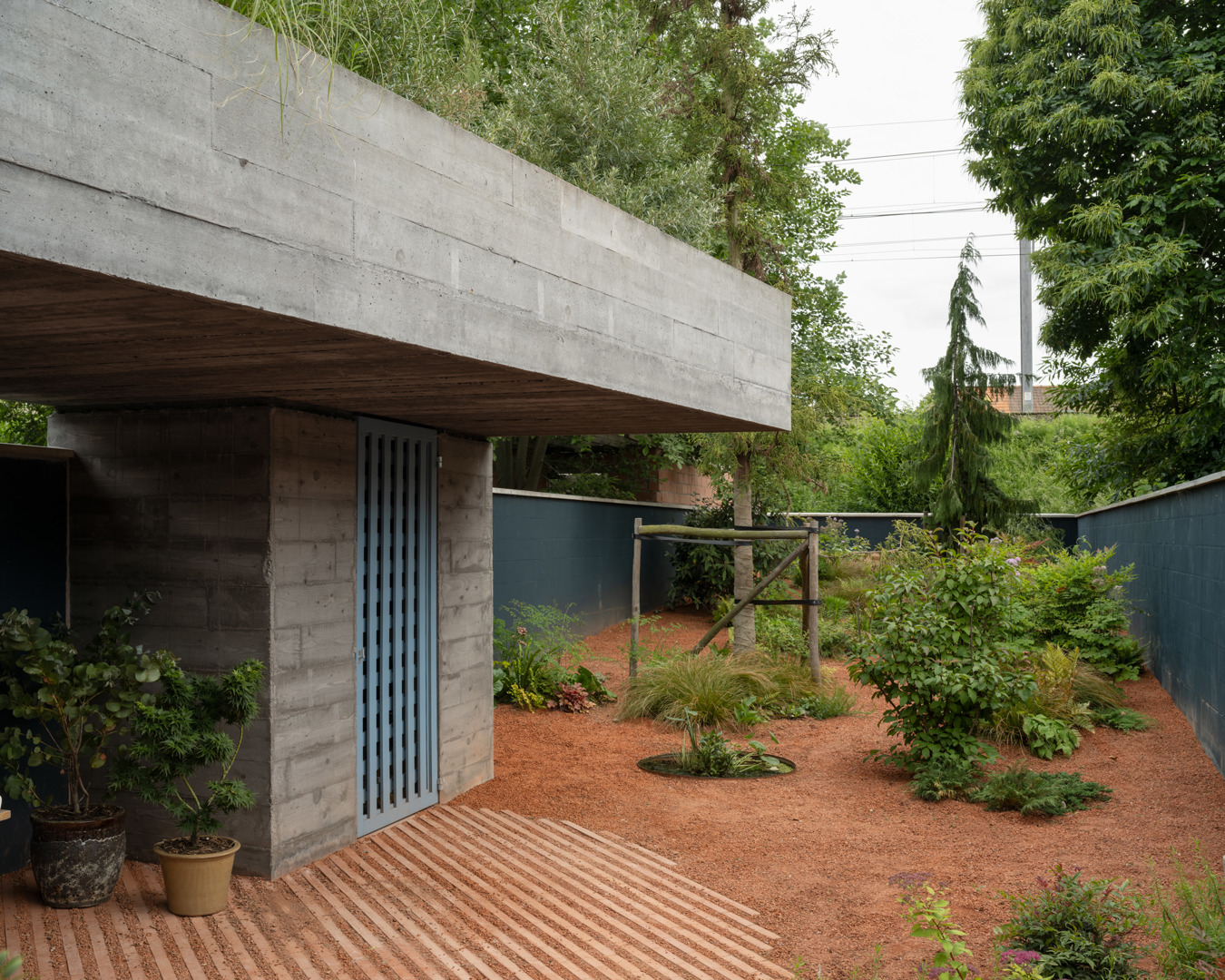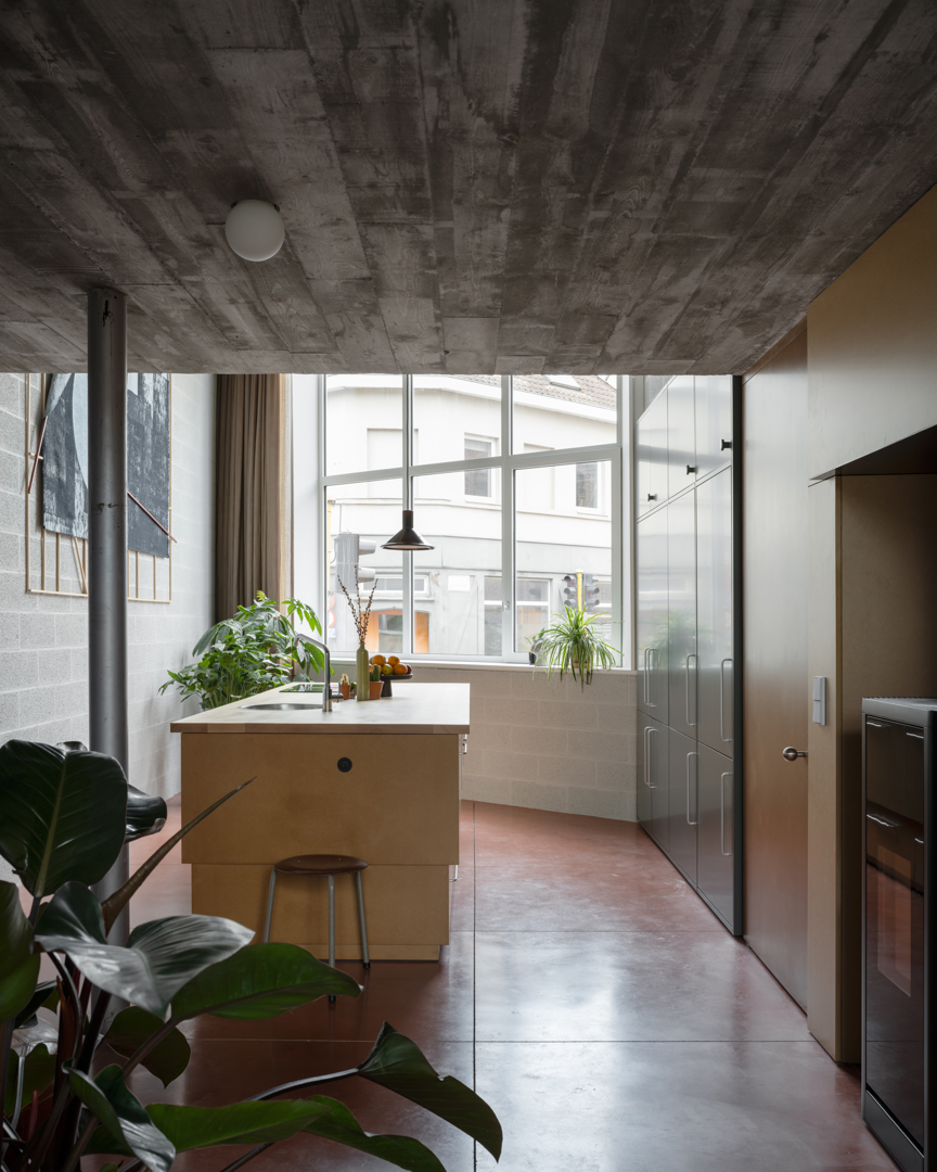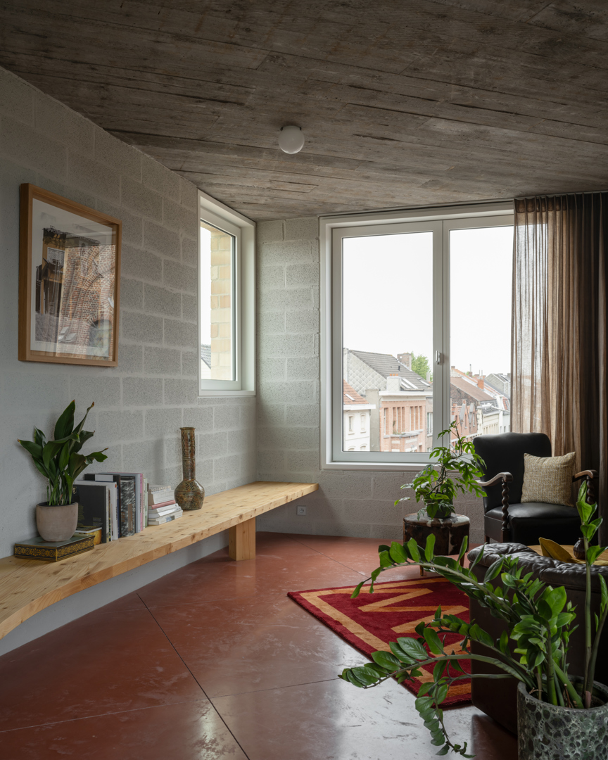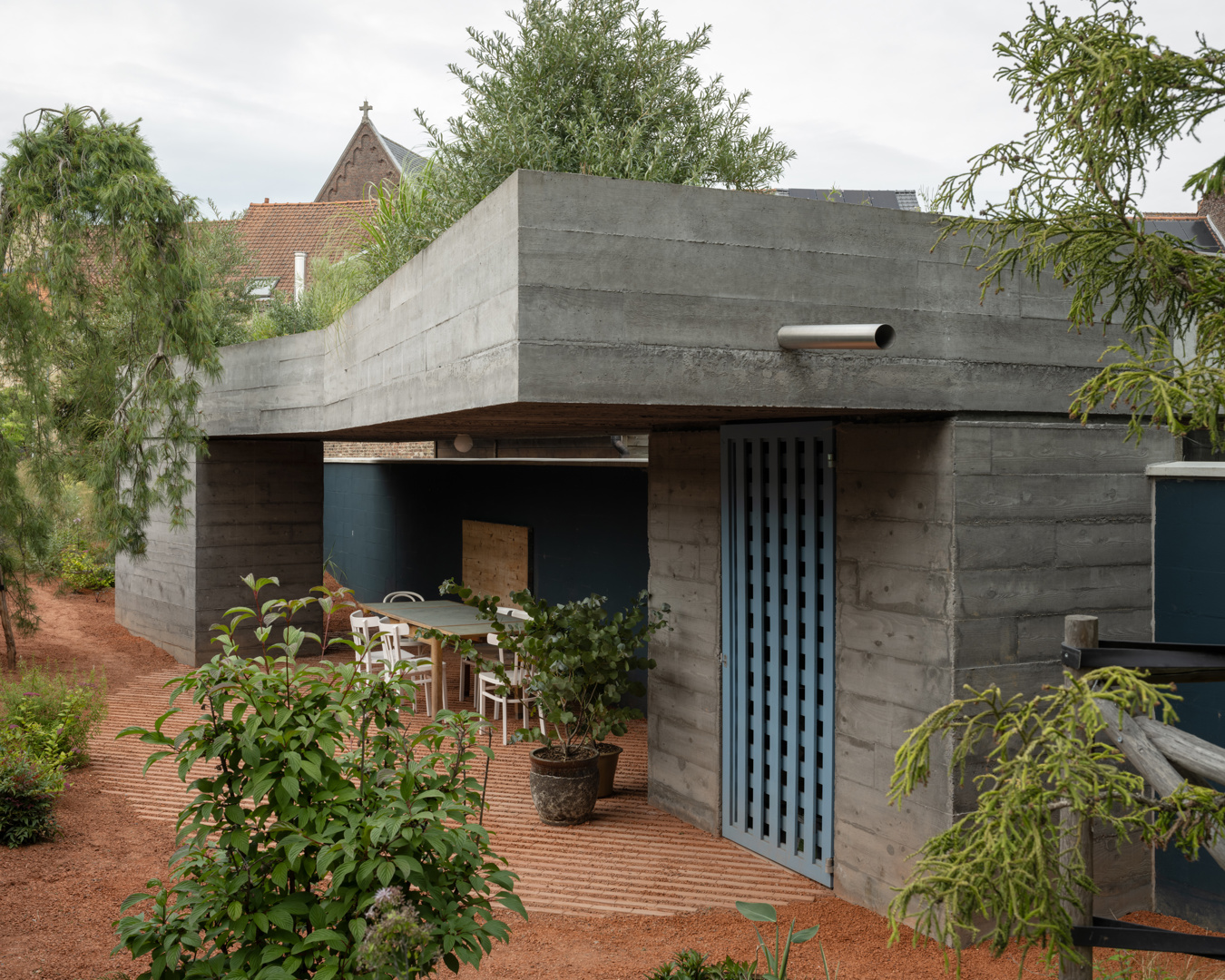 Een project realiseren voor de komende honderd jaar heeft geleid tot weloverwogen keuzes. Er werd resoluut gekozen voor een compacte, robuuste nieuwbouw met thermisch inerte materialen en aandacht voor weelderig daglicht en zonnewinst. Een doordachte woning zonder grote technische investeringen zoals vloerverwarming, geothermie, warmtepompen of veel PV-panelen. De volledige woning wordt immers verwarmd met één pelletkachel en heeft geen (passieve of actieve) koeling. Met een fundamentele ontharding, een injectie van wild, biodivers landschap én het wonen dat zich aanschurkt tegen de straat is dit niet alleen een oefening in compact bouwen maar ook een demonstratie van hoe de stad kan worden teruggewonnen. De woning activeert de straat en laat tegelijkertijd ruimte voor betekenisvol groen.