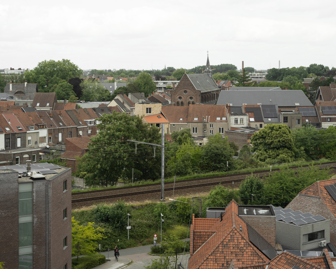 Doordat we in de binnenstad willen wonen en met het verlangen naar groene buitenruimte lonkte dit diepe perceel in Kortrijk. Op deze bebouwde kavel, uitgestrekt tussen straat en spoorweg, wilden wij een eigen compacte gezinswoning met genereuze tuin realiseren. De bestaande toestand, een typisch Vlaams amalgaam van gebouwen achter elkaar, herbergde nog geen enkele van die kwaliteiten. Het was de ambitie om hier een bijzondere ommekeer te realiseren, met een woning die de stad absorbeert en een tuin die in het verlengde van de woning niet enkel kijk, maar ook verblijfsruimte genereert. Ons geloof in de emanciperende rol van architectuur leidde tot een bijkomende ontwerpopdracht. Hoe immers, naast een aangename thuis, ook een project realiseren dat buurt, stad en samenleving beter kan maken.