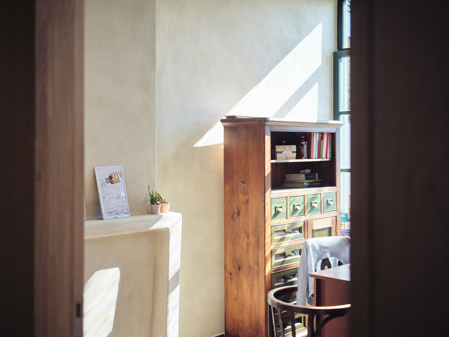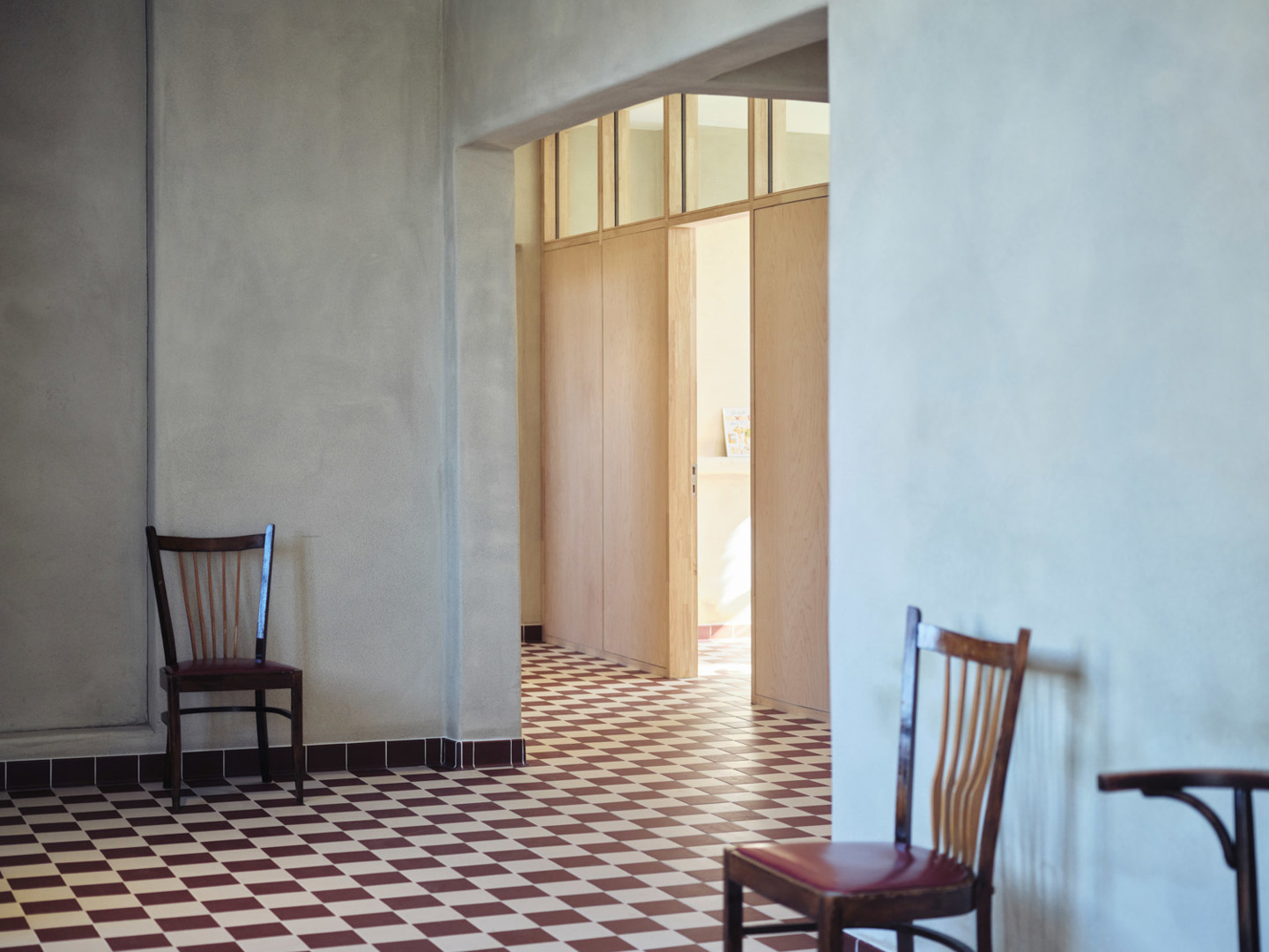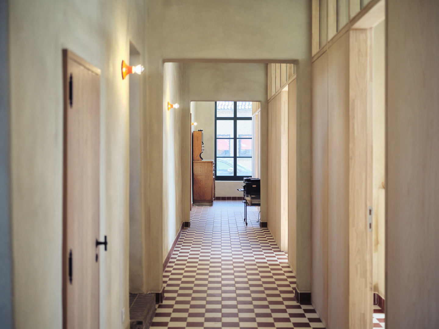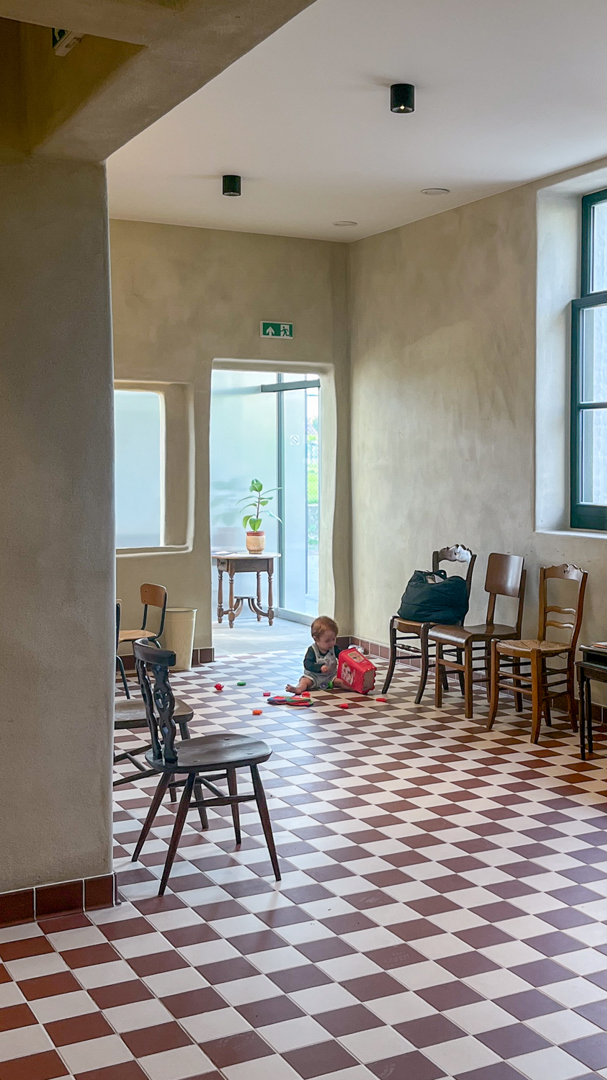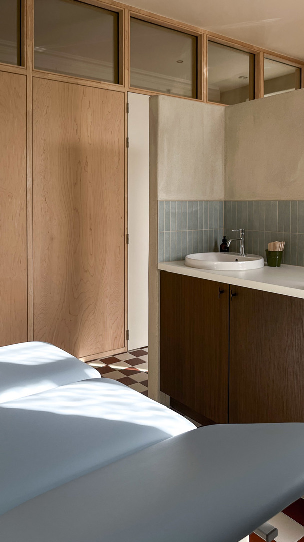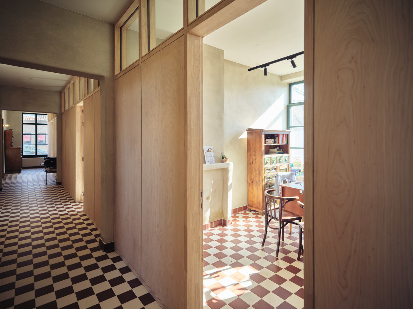 Na een grondige renovatie, restauratie en een innovatieve architecturale ingreep kreeg de dorpswoning haar oorspronkelijke glorie terug met een nieuwe betekenisvolle invulling als multidisciplinair huis voor zorg Materialiteit speelt een centrale rol in het ontwerp: dampopen wanden in kalkhennep en leempleister, kleinformaat-tegels in dambordpatroon als knipoog naar vroegere cementtegels, en hertekende plafondlijsten die het oorspronkelijke karakter van het gebouw laten herleven. Er werd een bewuste keuze gemaakt voor duurzame materialen, die niet steriel ogen en bijdragen aan een gezond binnenklimaat. Geen standaardoplossingen, maar warme, huiselijke accenten in plaats van de typische medische uniformiteit. Kortom, een toekomstgerichte praktijk in een gebouw met een verleden.