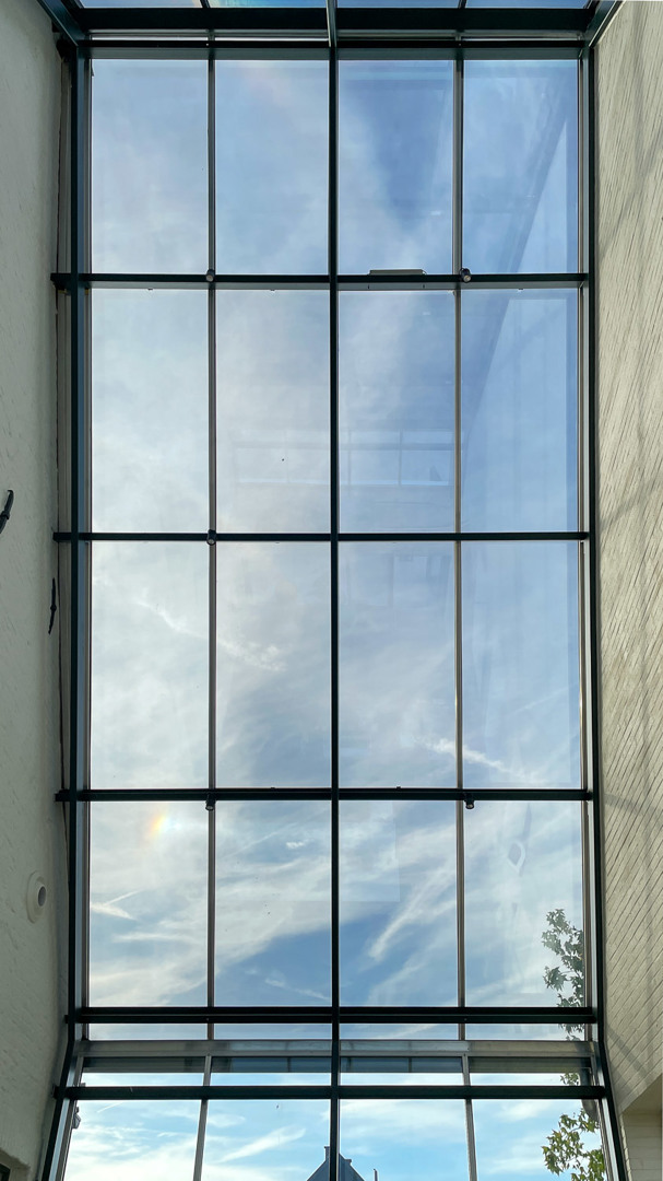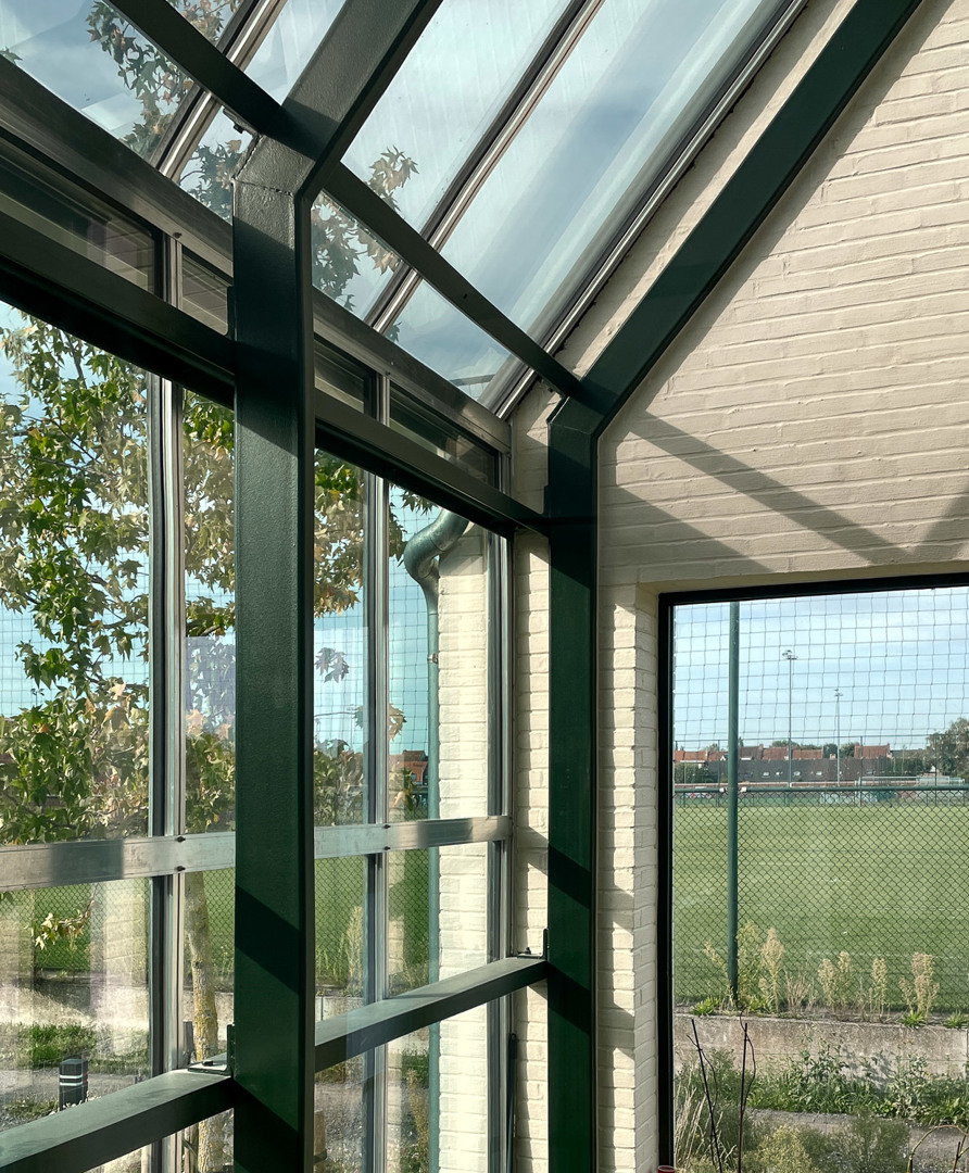 De bouwheren wilden geen klassiek dokterskabinet, en dat voel je in het resultaat. De grootste uitdaging was om in de beperkte oppervlakte alle functies onder te brengen. Want naast drie huisartsen biedt dit pand ook een onderdak aan een psychologe, een kinesitherapeut en eventueel andere paramedici. De uitbreiding aan het historische pand verbindt oud en nieuw met respect voor erfgoed. Door het gabarit van de historische topgevel te hernemen in een strak, hedendaags volume met volledig beglaasde tussenruimte, ontstaat een subtiele dialoog tussen oud en nieuw. De glazen verbinding werkt als een lichte, transparante schakel en fungeert tegelijk als inkomruimte. Wie binnenkomt, wandelt via de glazen tussenruimte naar de wachtzaal en kabinetten, elk met een eigen unieke invulling.
