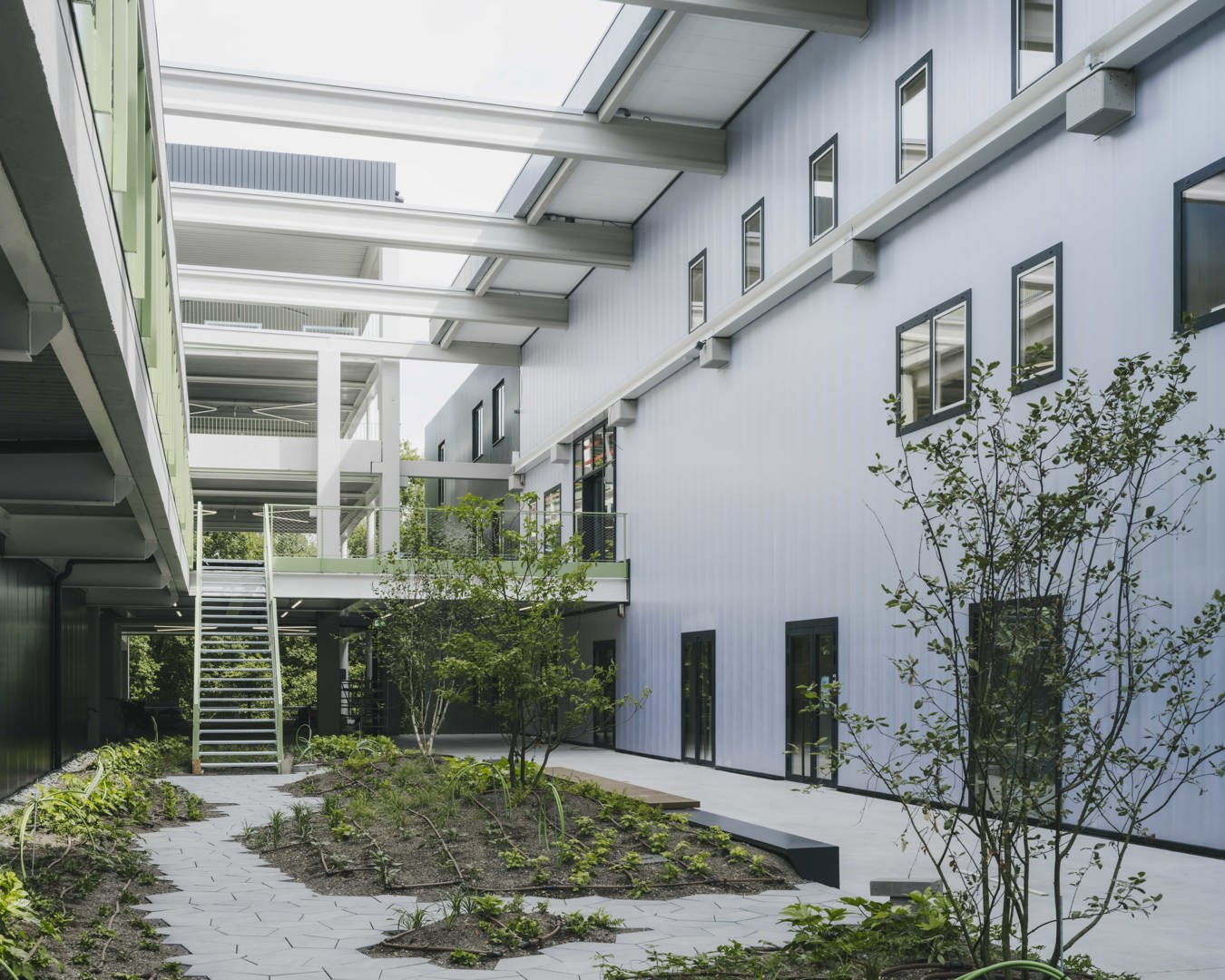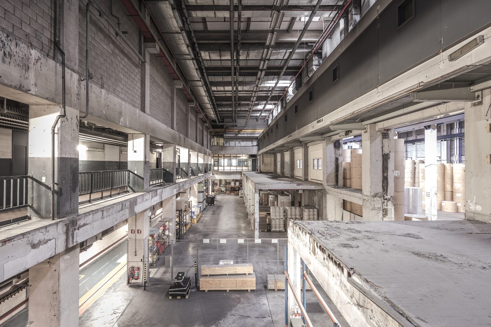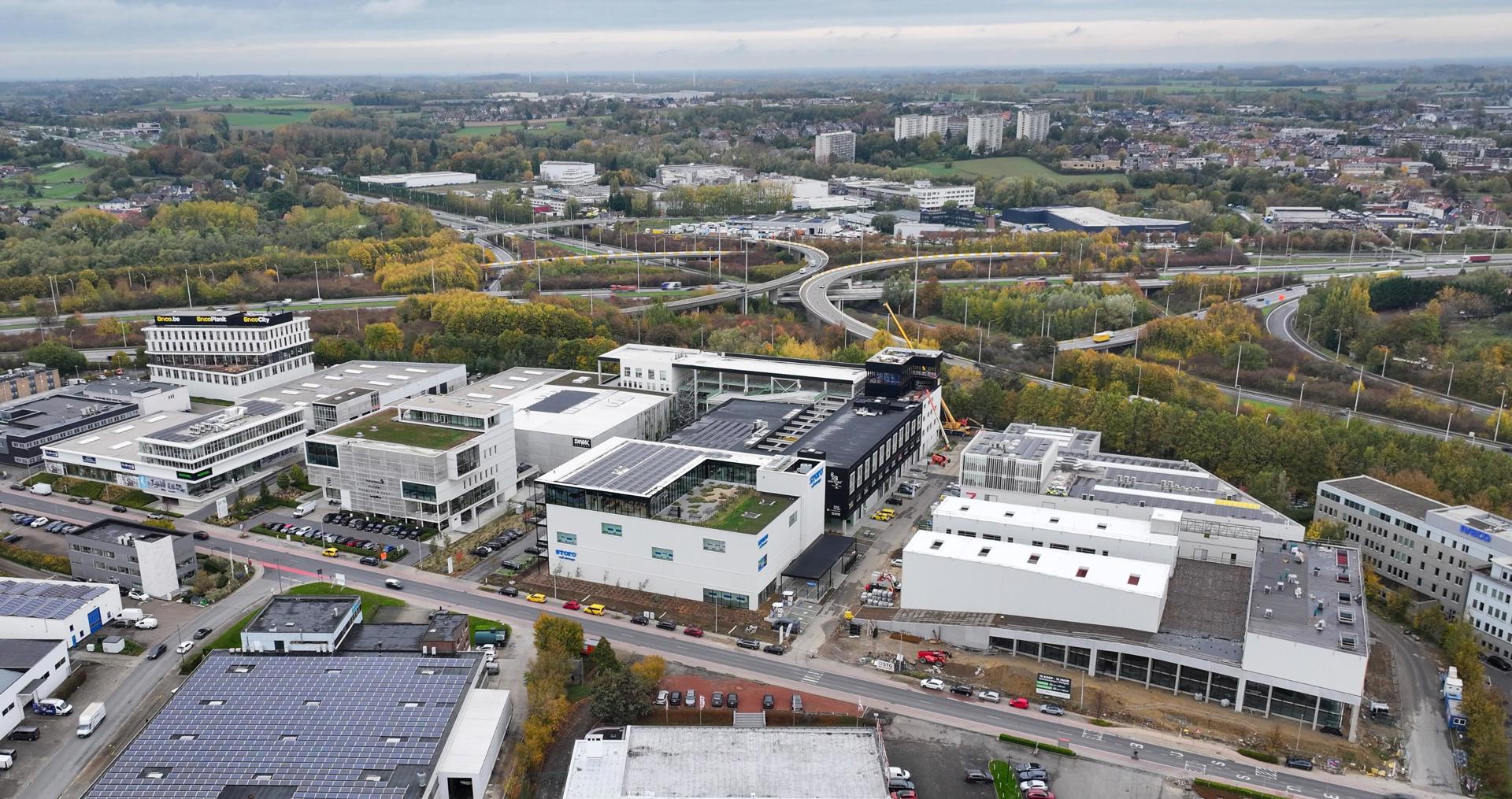 Westgate herdefinieert de klassieke bedrijvencampus als een open, stedelijk ecosysteem waarin productie, logistiek en werkplekken bewust worden verweven. De voormalige drukkerijsite Corelio werd getransformeerd via een robuust en flexibel masterplan, dat maximaal inzet op hergebruik van bestaande structuren. De ‘productieve ramblas’ vormt het ruimtelijk en sociaal hart van de reconversie: een genereuze binnenstraat waar circulatie, ontmoeting en bedrijvigheid samenkomen. Een bestaande drukpershal werd herbestemd tot een open, meerlagig parkeergebouw dat naast parkeercapaciteit ook logistiek ondersteunt en directe ontsluiting biedt tot de bedrijfsunits. Zo ontstaat een compacte, collectieve en toekomstgerichte werkomgeving binnen een traditioneel gesloten typologie van bedrijventerreinen.