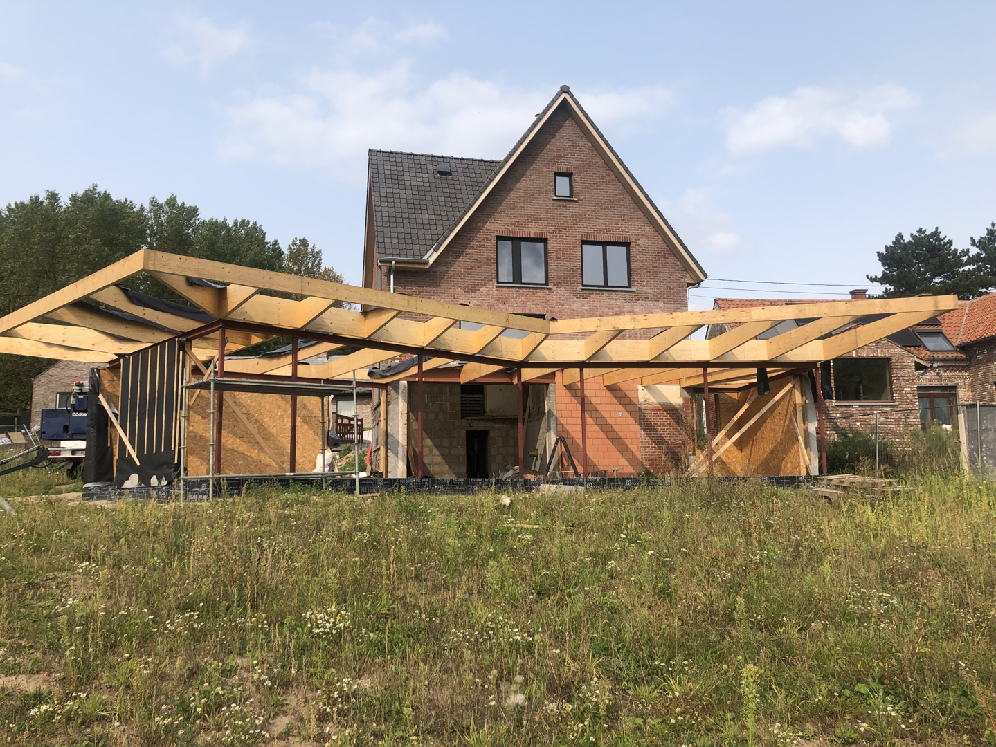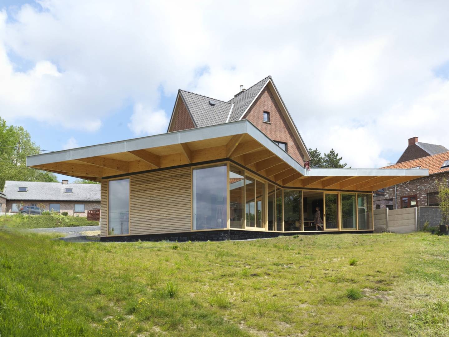 De uitdagingen van het ontwerp lagen in het aanpassen en uitbreiden van de woning tot future-proof woning concept dat de unieke ligging aan de rand van de Zwalmbeekvallei ten volle uitspeelt. Daarnaast diende het contact met de tuin en het terrein hersteld worden. De oplossing voor het ruimtelijk-landschappelijke probleem bestond erin de kelderverdieping als het nieuwe gelijkvloers te definiëren en er een uitwaaierend volume achter te plaatsen. Door de vloerplaat van de vroegere leefruimte eruit te halen creëerden we intern een ruimtelijke overgang tussen het straatniveau en het tuinniveau . Een bijzondere structuur van uitkragende en geprofileerde houten LVL-balken die rusten op enerzijds een fijne staalstructuur en anderzijds op houtskeletwanden bracht de compositie in evenwicht.