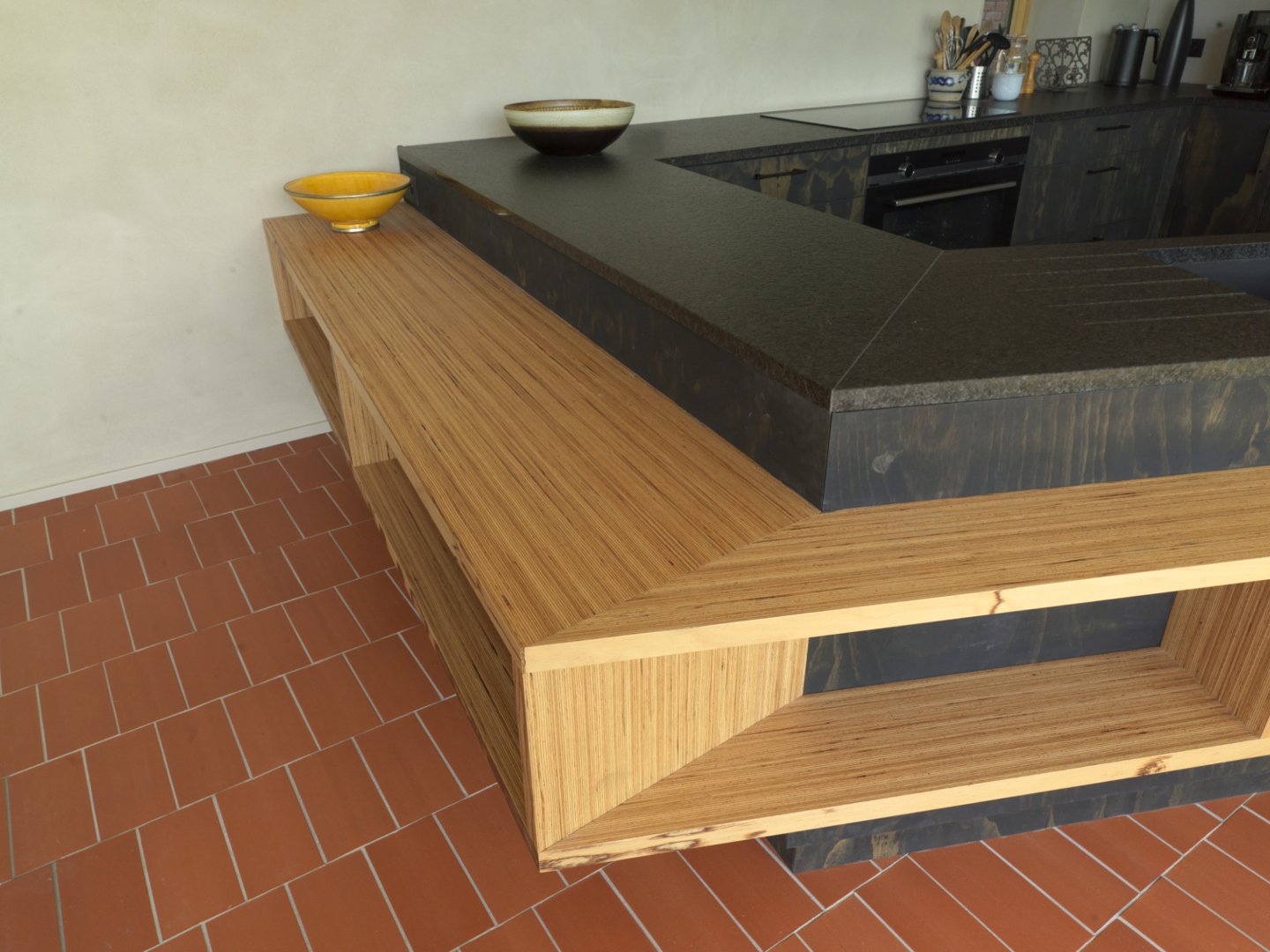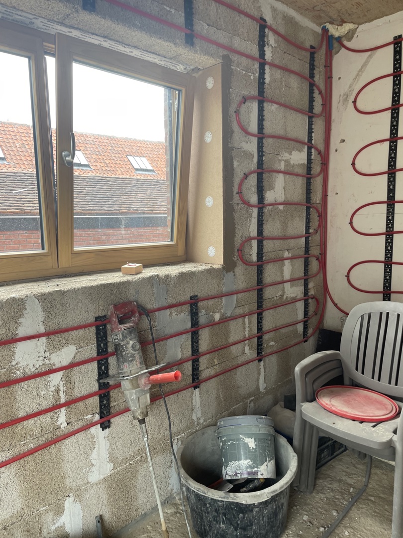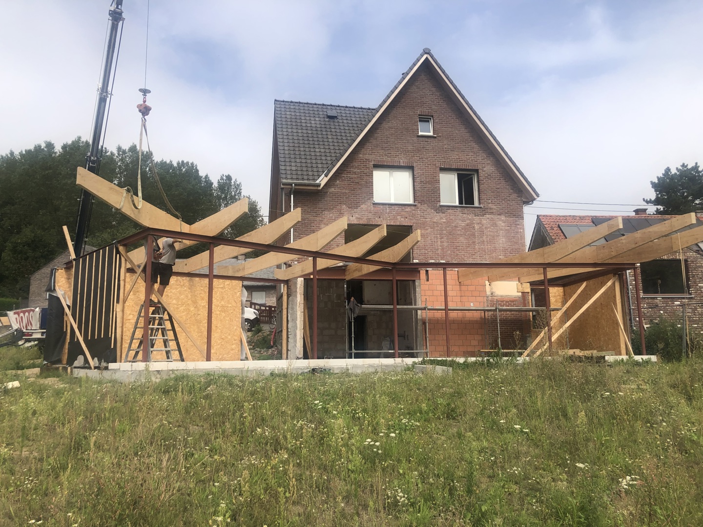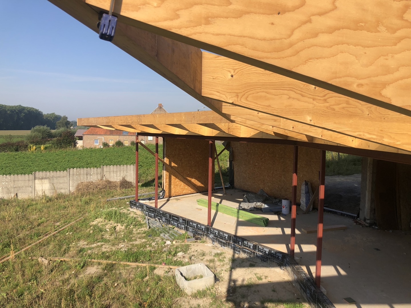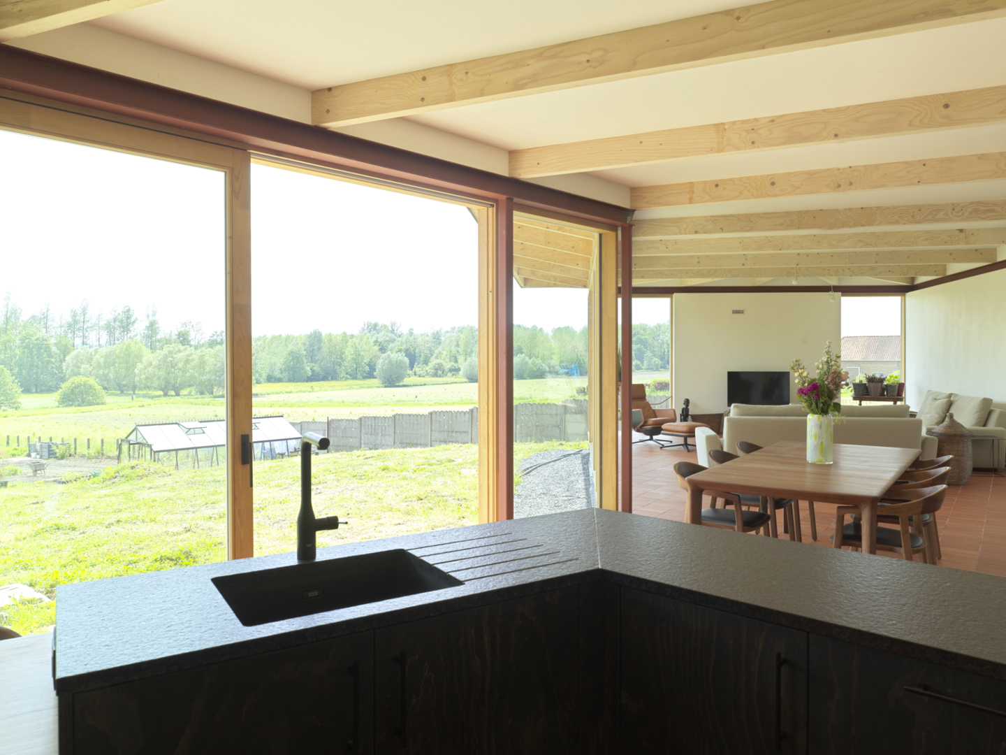 De dakuitkraging van het achtergebouw is het meest in het oog springende kenmerk van de transformatie. Naast een stevig zonne- en regenscherm is dit de ruimte bij uitstek waar allerhande nieuwe hybride activiteiten kunnen plaatsvinden. Het veranderend klimaat vraagt immers naar een aangepast leefomgeving die rekening houdt met nieuw extremen mbt regen, zon, temperatuur. De bestaande woning werd aan de binnenzijde voorzien van een isolatiemantel in kalkhennepblokken en werd afgewerkt met leempleister. Deze dampopen opbouw regelt de luchtvochtigheid en zorg voor een optimale luchtkwaliteit. Een geothermische warmtepomp, de ballansventilatie en de PV-installatie doen verder het verbruik van fossiele energie dalen.
