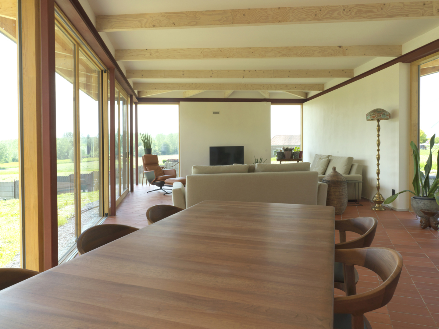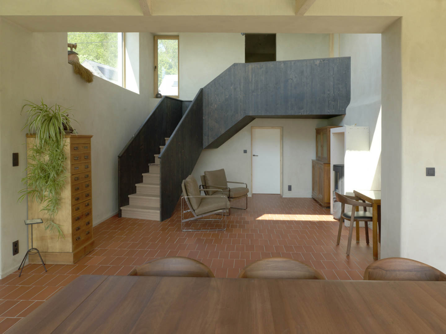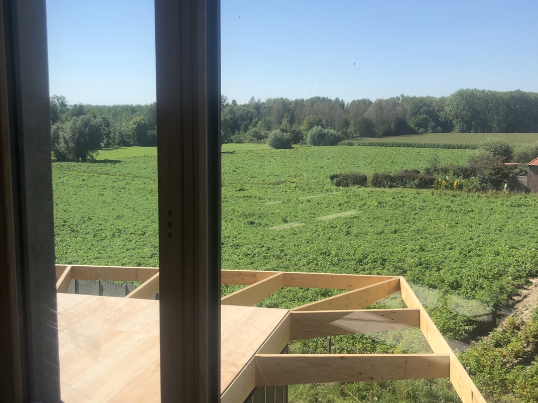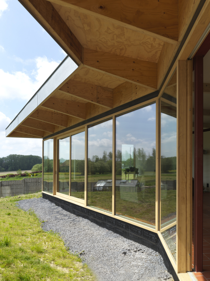 Door een eenvoudige ingreep in het bestaande grondplan, nl het openmaken van een vloerplaat, zijn we erin geslaagd de moeilijke reliëfconditie van het terrein intern te overbruggen. Een prachtige trap in hout binnen deze dubbelhoge ruimte vormt de spil van de woning Muziekkamer, gastenkamer en zolder kunnen probleemloos een andere invulling krijgen, waardoor de levensduur van deze woning ‘future proof’ is. De ruimte onder de luifels biedt ruimte aan een prachtig overdekt terras, maar ook aan tal van nog onbekende gebruiken. Het veranderende klimaat, met soms te veel regen, of te veel zon, dwingt ons tot nieuwe vormen van ruimtelijkheid, ergens tussen binnen en buiten. Met dit ontwerp proberen we daar een uitdrukking aan te geven.