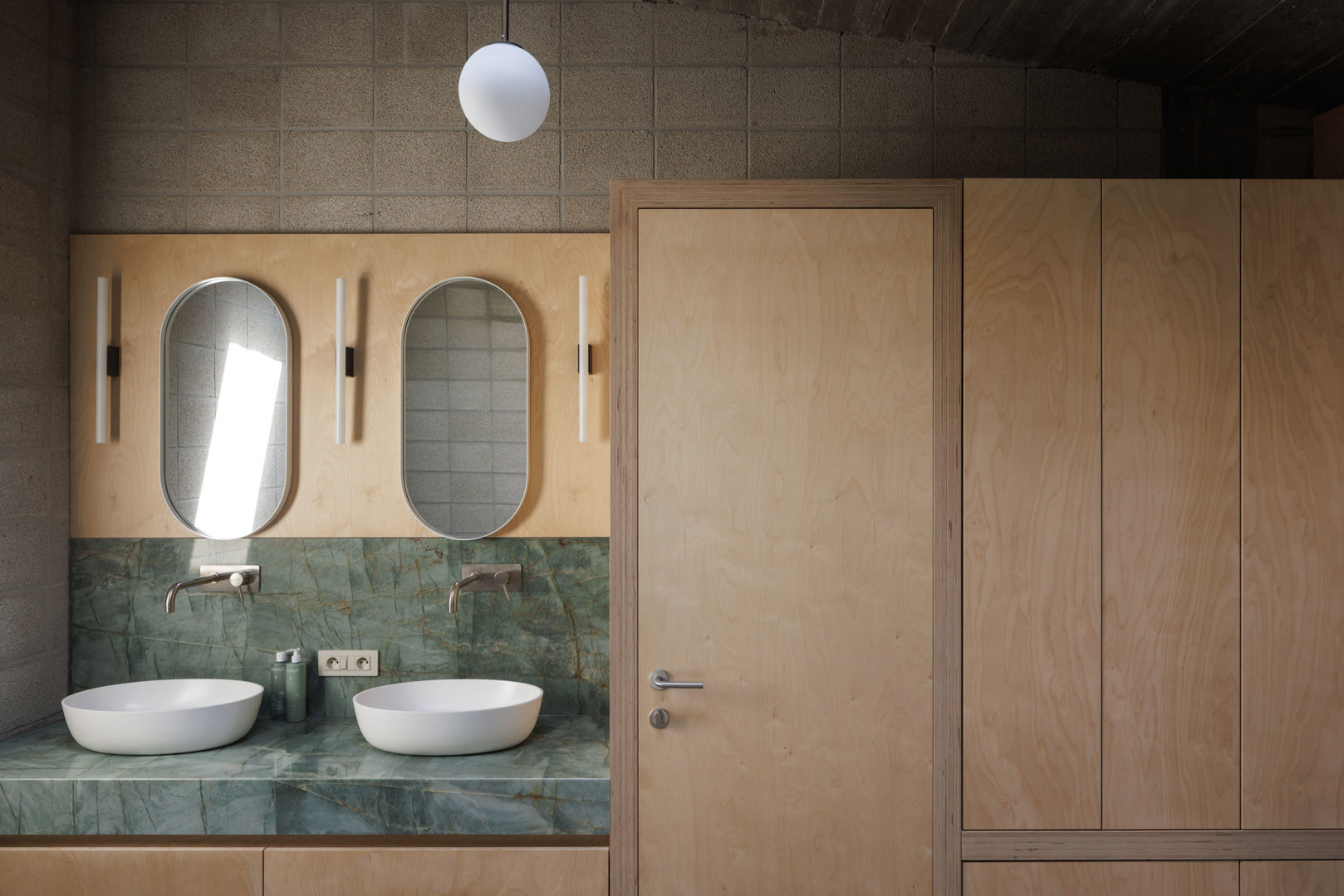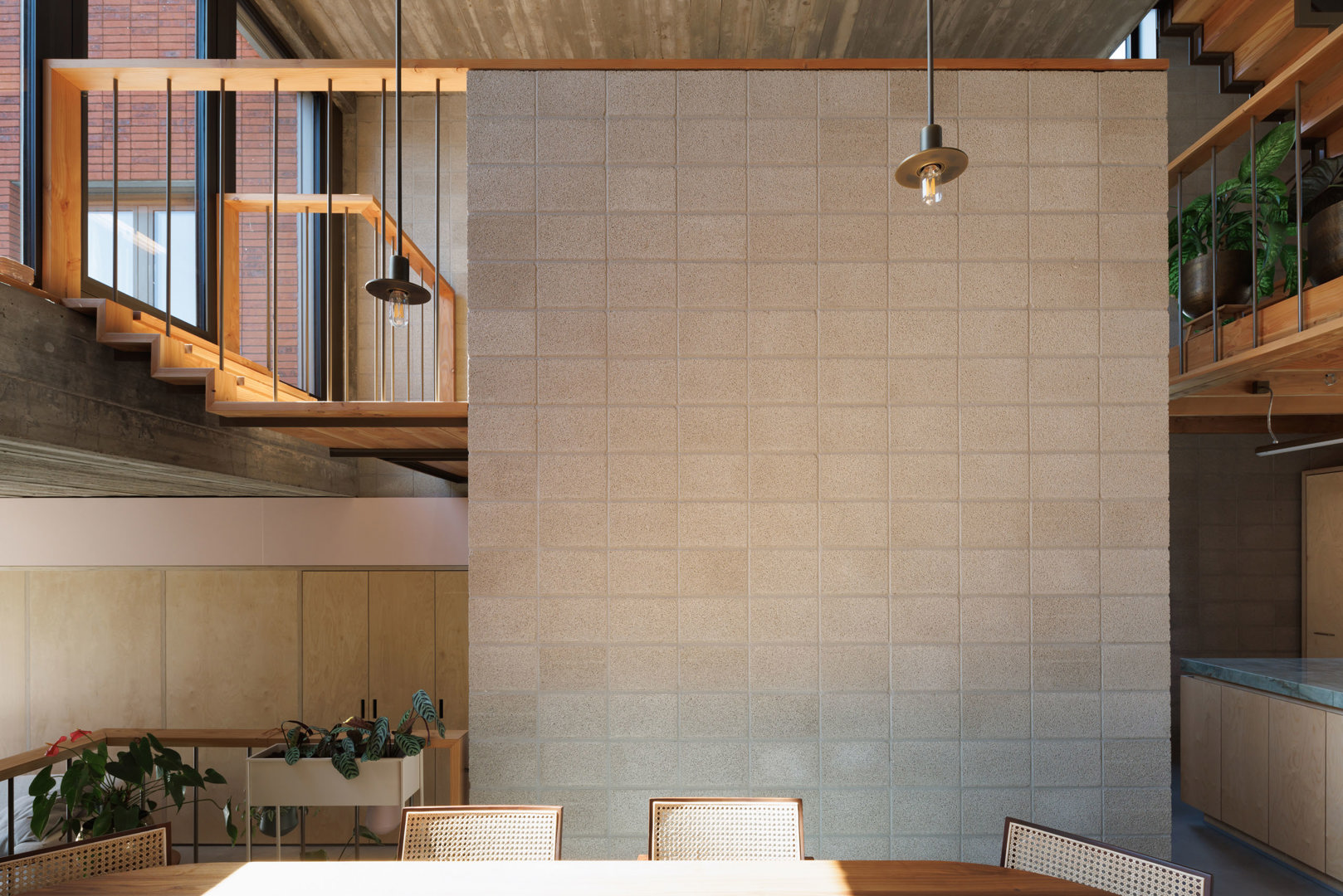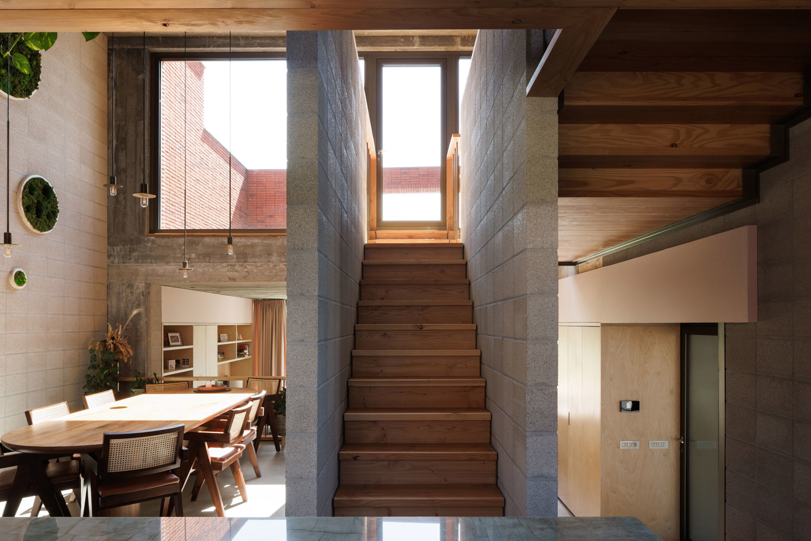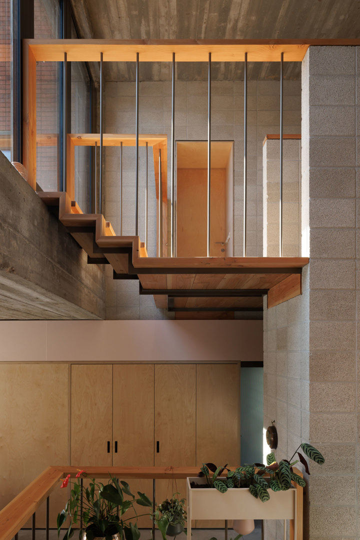 Ondanks de rigide volumetrische verkavelingsvoorschriften wordt een ruimtelijke hiërarchie uitgebouwd binnen het hoofdvolume, waarbij de gemeenschappelijke dienstige ruimten, zoals de leefruimten, centraal worden geplaatst binnen de ruimtelijkheid van de woning, met een buiten-ontbijt-zonneterras op verdieping. De dienende ruimten, zoals badruimtes en slaapkamers, bevinden zich zijdelings van de centrale dubbelhoge woonruimte, aansluitend op het centrale trappencircuit. De specifieke vraag werd gesteld naar een onafhankelijk geprivatiseerd ruimtegebruik voor ouders en kinderen. De respectievelijke geprivatiseerde slaapvertrekken en badruimten bevinden zich op verdieping, enerzijds onder het zadeldak voor de kinderen en anderzijds onder het vlinderdak voor de ouders.