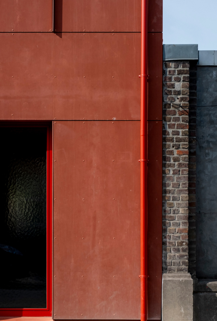 Karina benaderde ons met een duidelijke vraag: Een compacte woning voor haarzelf en haar 2 kinderen op een perceel in Gentbrugge op een boogscheut van de Gentbrugse Meersen, een regio ons welgekend. Het programma was ambitieus en het budget moest streng bewaakt blijven: 3 slaapkamers, 2 badkamers, een zitruimte, een eetplaats, een keuken, een wasberging, een techniekenzone, een inkom, een zwembad en ruimtelijkheid. Op een perceel breedte van 5m80 die conisch versmalt werd het ontwerp een ruimtelijke en financiële puzzel. Met Karina, scenografe van beroep met KLEUR als rode draad, ontwikkelden we een split-levelwoning die optimaal gebruikmaakt van volume en licht. Een centrale stalen trap vormt de ruimtelijke ruggengraat en visuele blikvanger, met een subtiele verwijzing naar de gevel.
