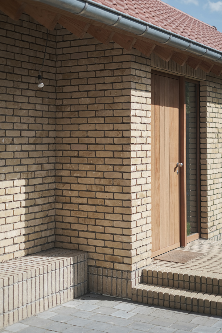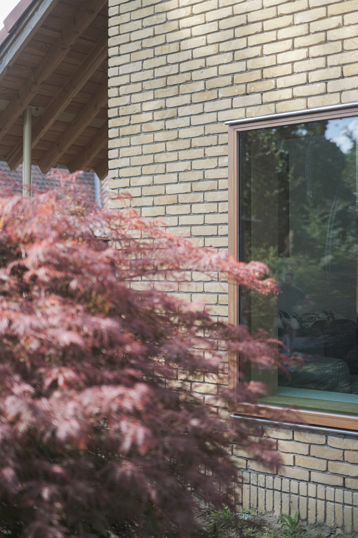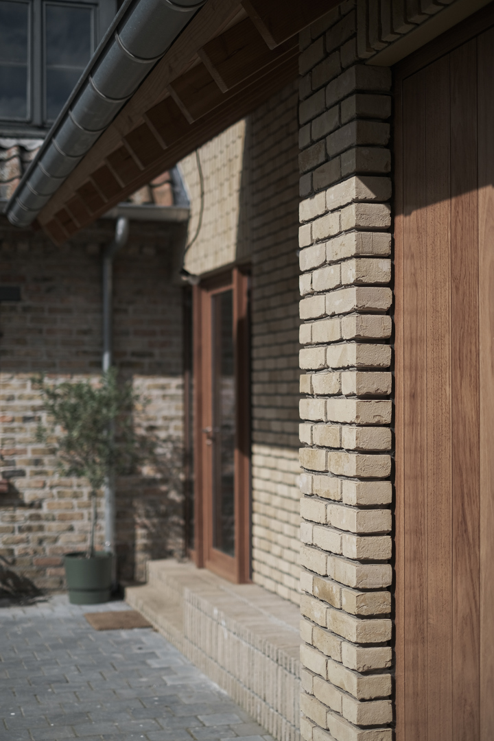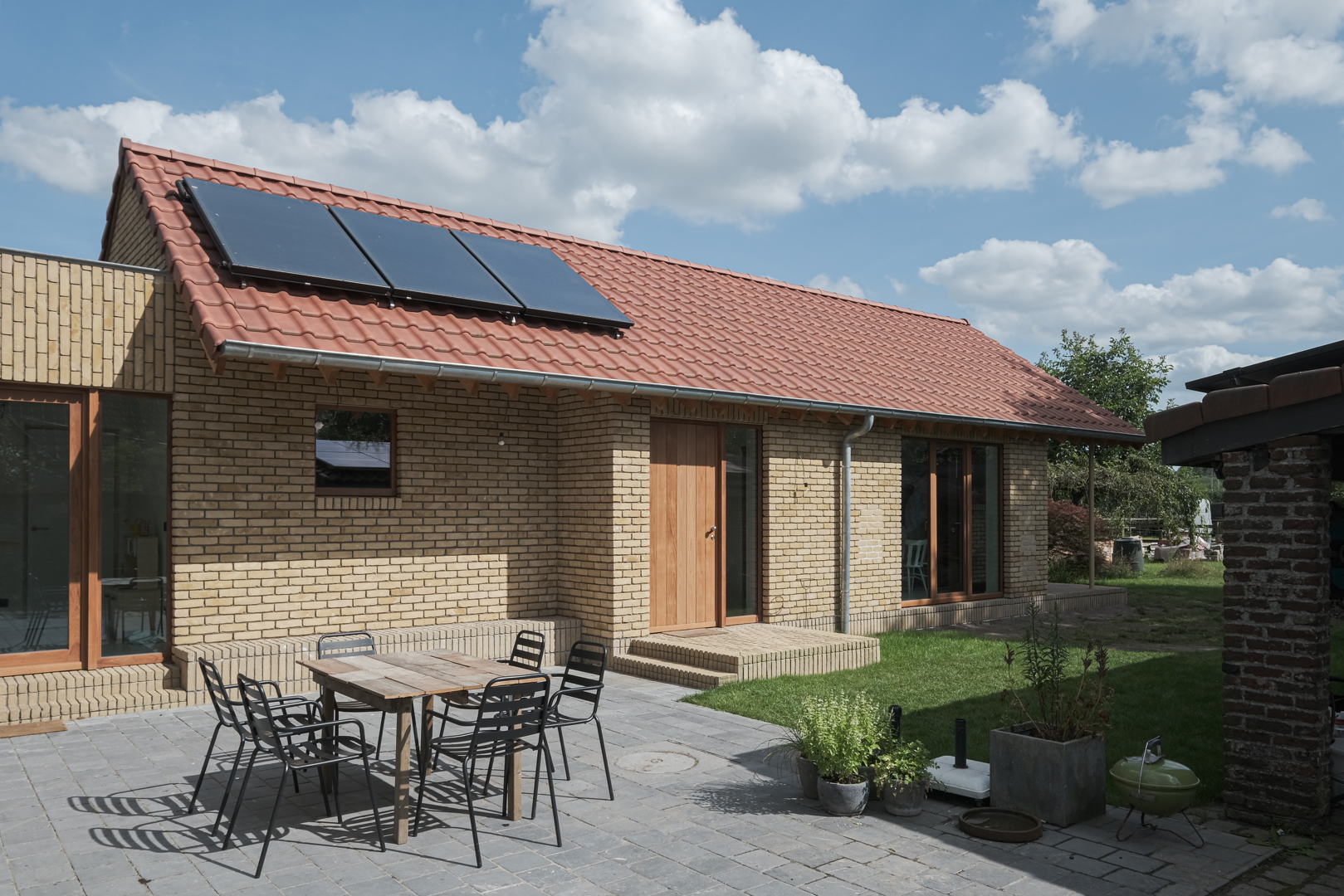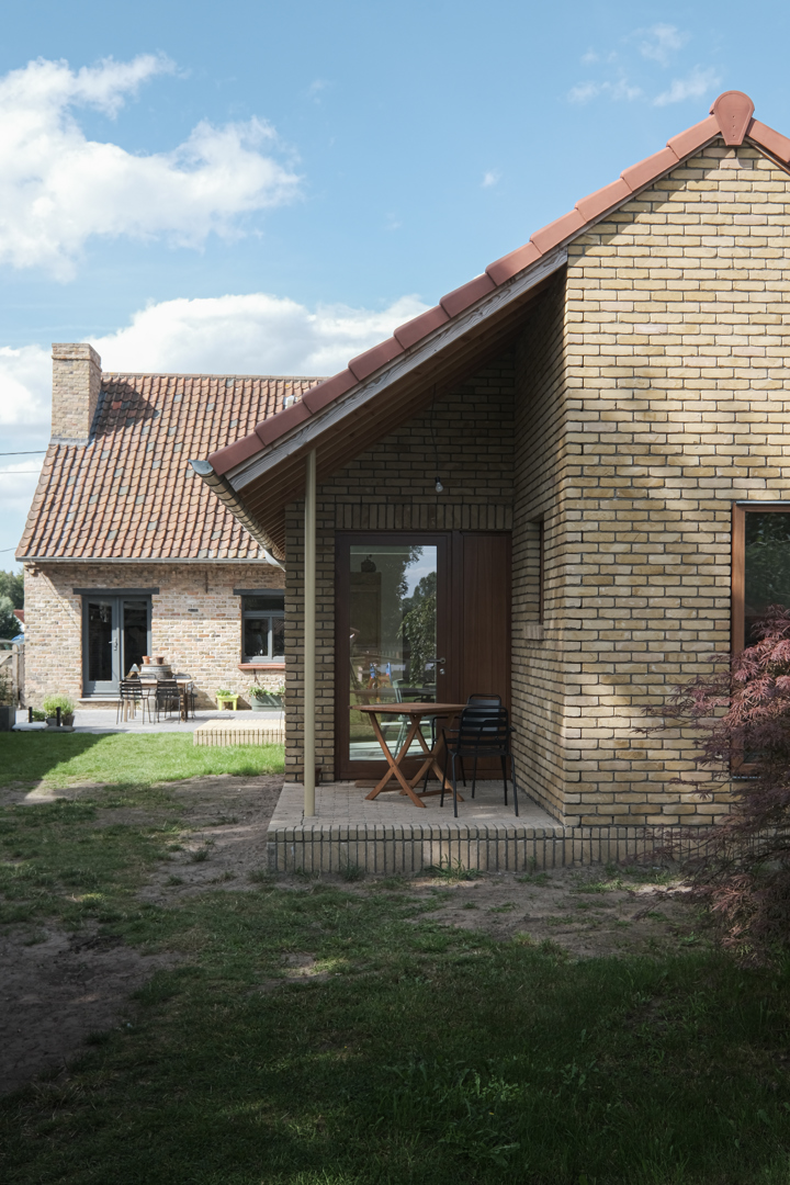 De stedenbouwkundige context - namelijk een uitbreiding bouwen bij een zonevreemde woning - en de regelgeving omtrent zorgwonen vormden een eerste puzzel waarbinnen het totale bouwvolume en de totale vloeroppervlakte moesten passen. Twee gezinnen dicht bij elkaar laten wonen – om de nodige zorg te kunnen bieden – maar met voldoende afstand en privacy was een tweede belangrijke uitdaging. De nodige afstand proberen we te bewaren door de inplanting van het nieuwe volume en zijn vertrapte gevellijn. Rechtstreekse inkijk bij elkaar wordt zo verhinderd en er ontstaan tegelijk twee overdekte zones onder het hellend dak: een gemetste zitbank bij het terras van de hoofdwoning en een overdekt terrasje achteraan de zorgwoning. Elk gezin krijgt zo zijn eigen buitenruimte aan de gedeelde tuin.