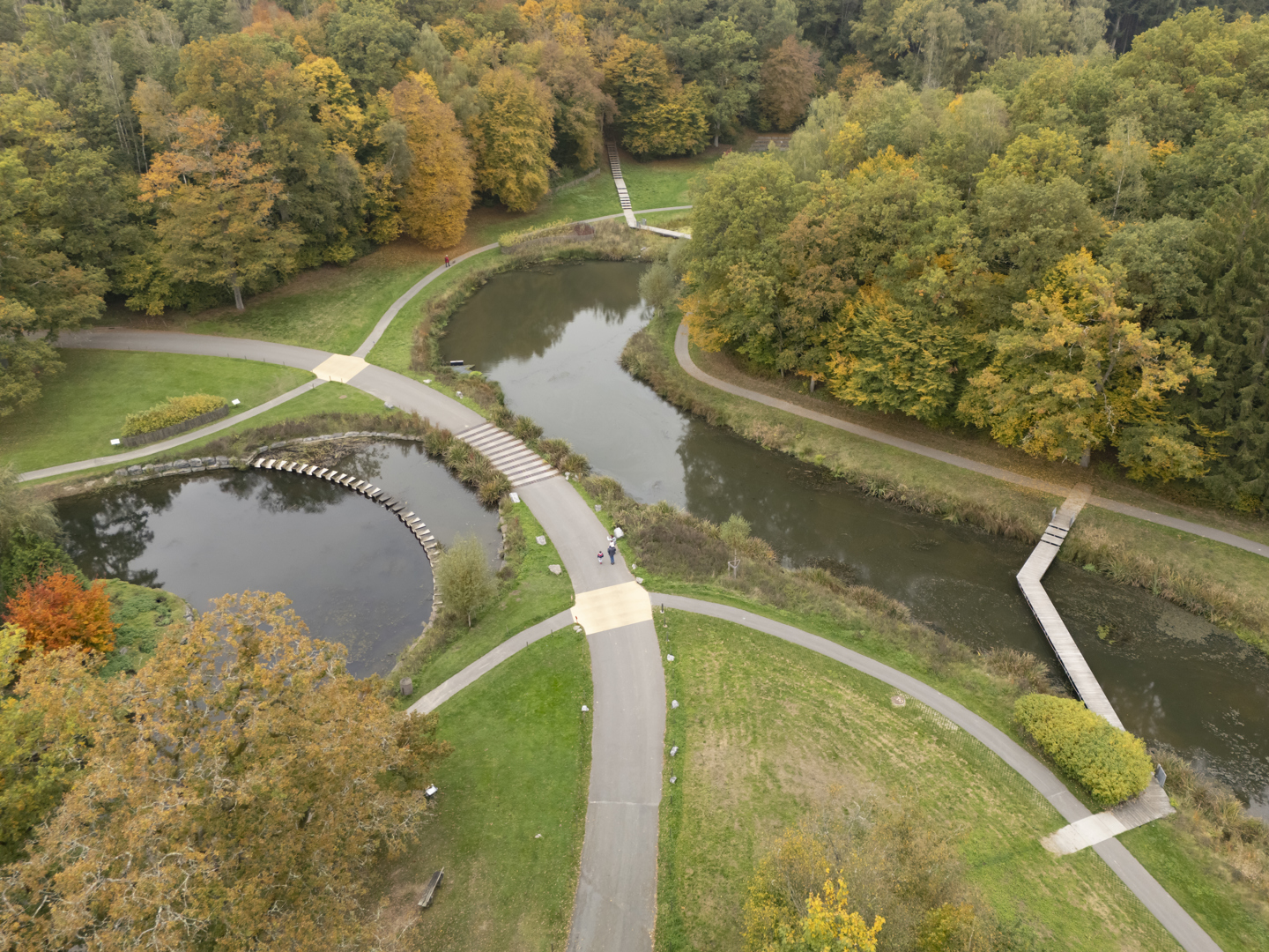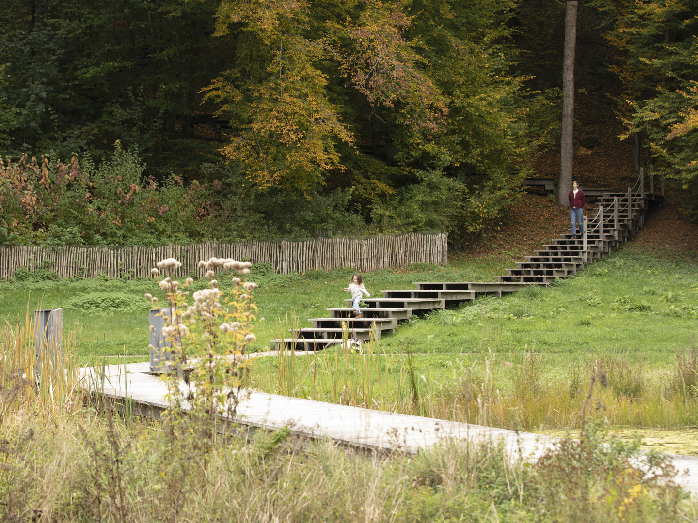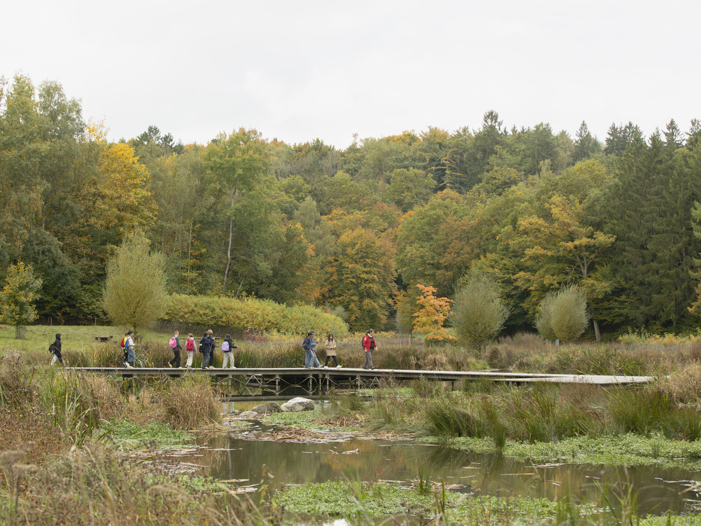Het project bevindt zich in het hart van het provinciaal domein van Chevetogne dat zich uitstrekt over een gebied van bijna 600ha met landerijen en bossen. In het centrum verwelkomt een recreatiepark van 200 ha jaarlijks 450.000 bezoekers in zijn tuinen, musea, restaurants, accommodaties, speel- en ontspanningsruimtes. De ingreep betreft een landschapsgedeelte van 4 ha bij de samenvloeiing van de beken Molinia en Mivau, die twee kleine valleien met beboste hellingen uithollen en de vijvers van het park voeden. In de jaren '70 werd een deel van de rivier gekanaliseerd, de weilanden werden drooggelegd en wegen werden gepland om een caravanpark op te zetten. 50 jaar later wordt een deel van het park verplaatst om een semi-natuurlijk landschap van wetlands te herstellen, waarmee wandelaars verwelkomd kunnen worden.