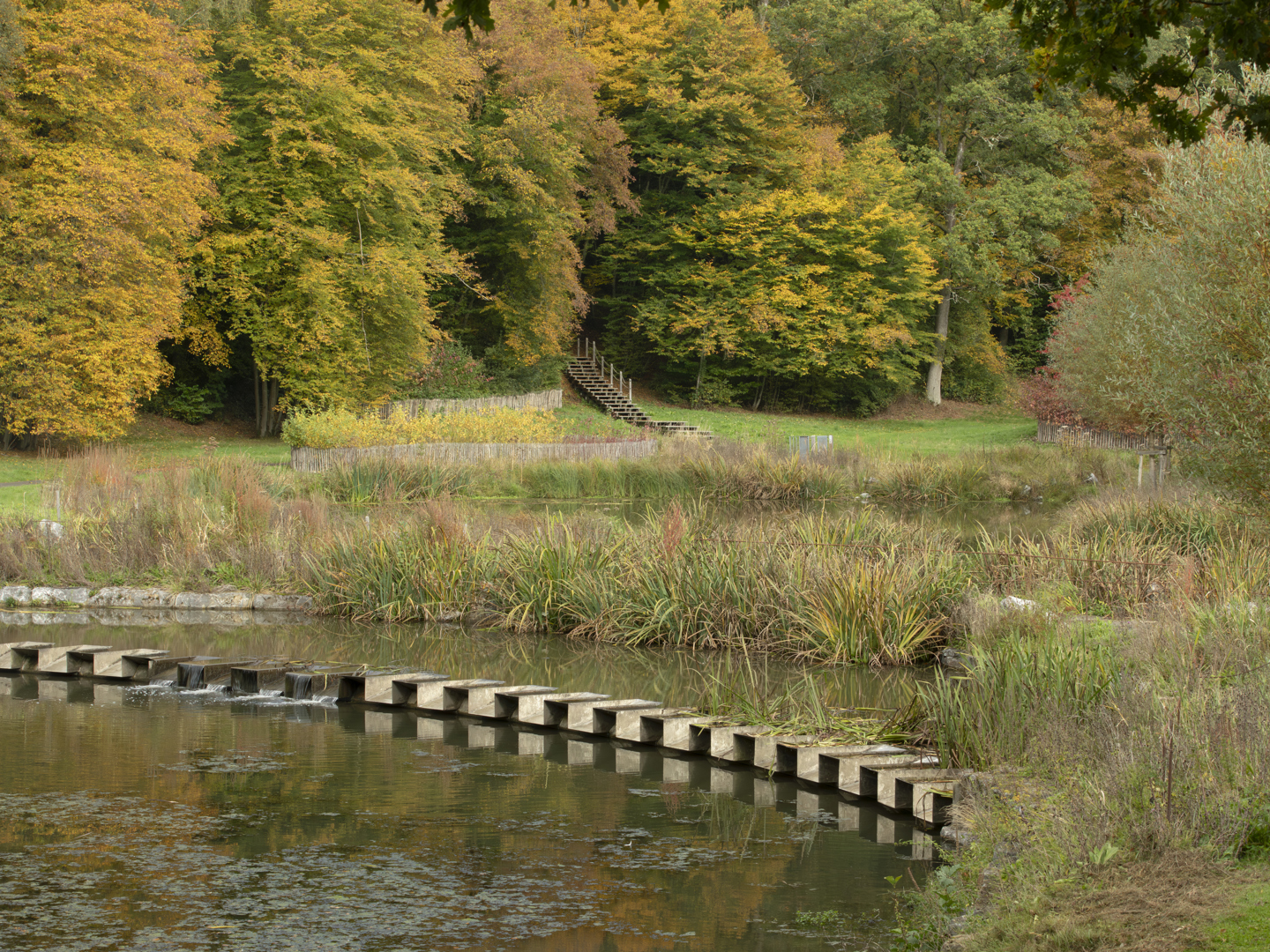 Het landschapsproject pakt verschillende vraagstukken aan: milieu, mobiliteit en identiteit. Prioriteit is ecologisch en hydrologisch door een sterke renaturering van de locatie te verzekeren. De riviergedeelten worden opnieuw getraceerd in het midden van nieuwe natte weiden, verrijkt met meanders, poelen en moerassen om de biodiversiteit te bevorderen, de waterkringloop te herstellen en de debietvariaties te reguleren. Het project moest de kruising van een weg integreren. In plaats van een brug te bouwen, liet het ontwerp toe het niveau dichter bij het water te brengen als een doorwaadbare plaats, waardoor men ondergedompeld wordt in de natuur. Paden en een speelterrein zijn aangelegd voor de vele wandelaars, waarbij zorg is gedragen voor landschappelijke continuïteit met het gehele domein, tussen verzorgde tuinen en wilde natuurgebieden.