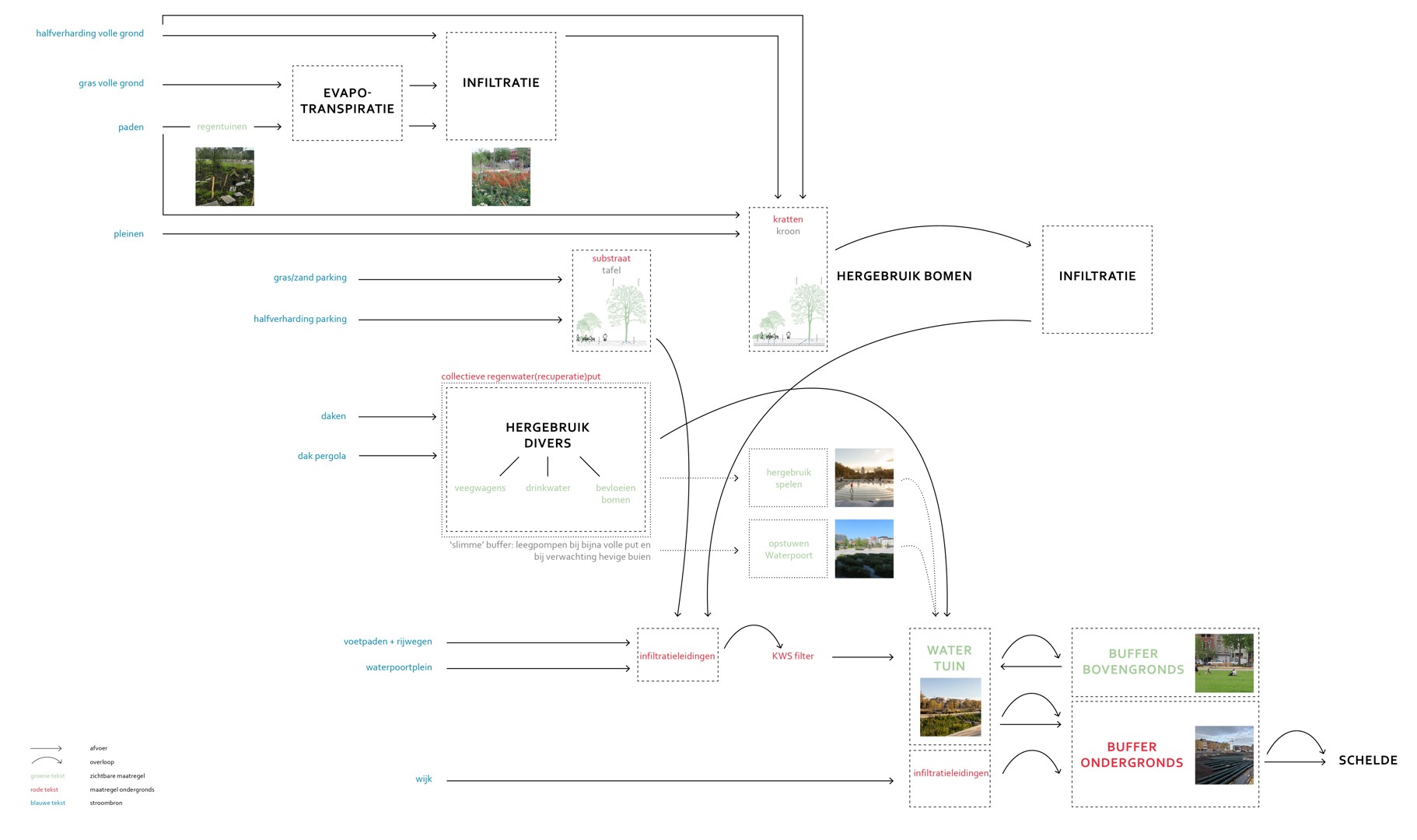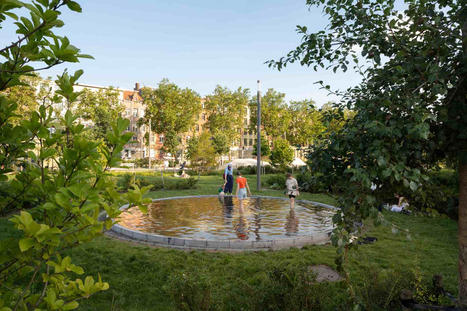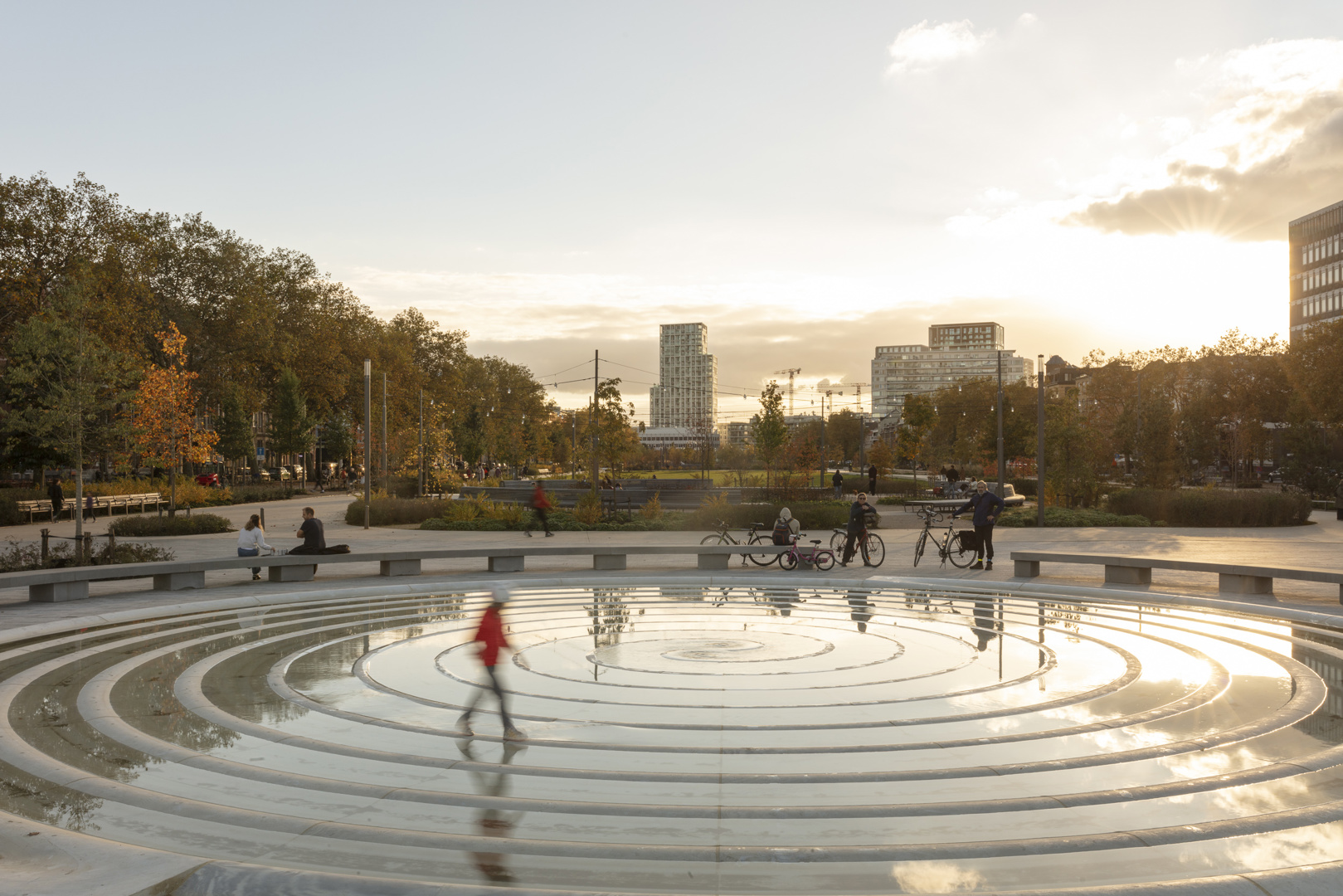 Het Zuidpark vertrekt van een ambitieuze starthypothese: door het parkeren ondergronds te brengen kon worden geïnvesteerd in een park met een integraal en toekomstgericht watersysteem. Dit systeem combineert buffering, infiltratie en hergebruik en overstijgt het park door ook water uit de wijk op te vangen. Zo fungeert het Zuidpark als een onderdeel van de stedelijke waterhuishouding. Deze ecologische en technische ambitie vertaalt zich rechtstreeks in het dagelijks gebruik. Ontharding, beplanting en waterstructuren creëren een plek waar mensen de stad anders ervaren: flaneren onder het bladerdak, waterplekken ontdekken, buren ontmoeten... Met zijn heldere structuur verenigt het Zuidpark mensgericht ontwerp en ecologische veerkracht tot een sociaal productieve en cultureel verankerde plek.