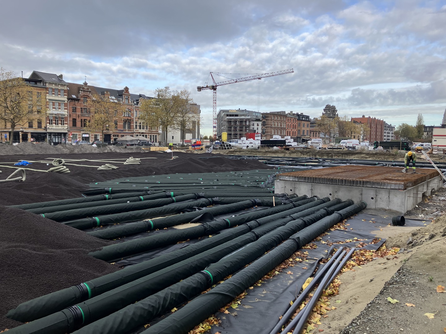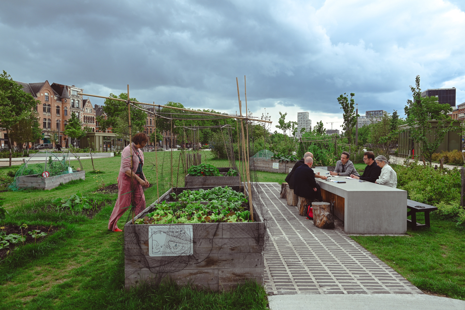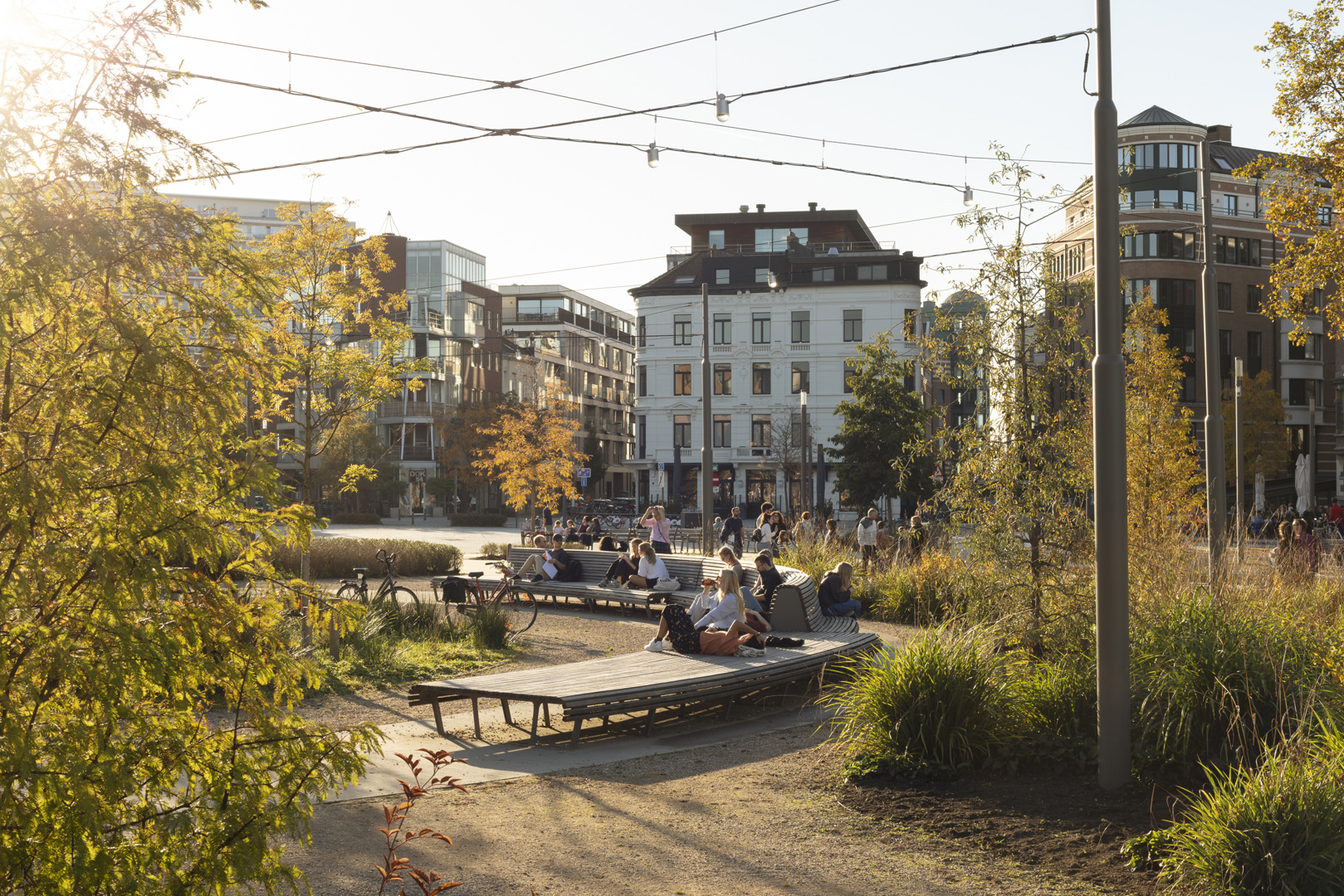 Duurzaamheid zit in het Zuidpark niet alleen in de ontharding en vergroening, maar ook in de materialisatie. Tal van elementen uit de voormalige Gedempte Zuiderdokken kregen een tweede leven: hergebruik van kasseien in parkeervakken, natuurstenen onderdelen keren terug als stapstenen, en de stalen elementen van de vroegere hangars vormen vandaag de pergola. Zo wordt de milieu impact beperkt én blijft het geheugen van de plek zichtbaar aanwezig. Daarnaast is het project duurzaam in sociale zin. Het werd ontwikkeld met en voor de inwoners van Antwerpen, via een intens participatief traject met omwonenden, scholen, handelaars, cultuurinstellingen en bezoekers. Zo ontstond een gedragen ontwerp dat niet alleen ecologisch veerkrachtig is, maar ook sociaal robuust en breed gedragen.