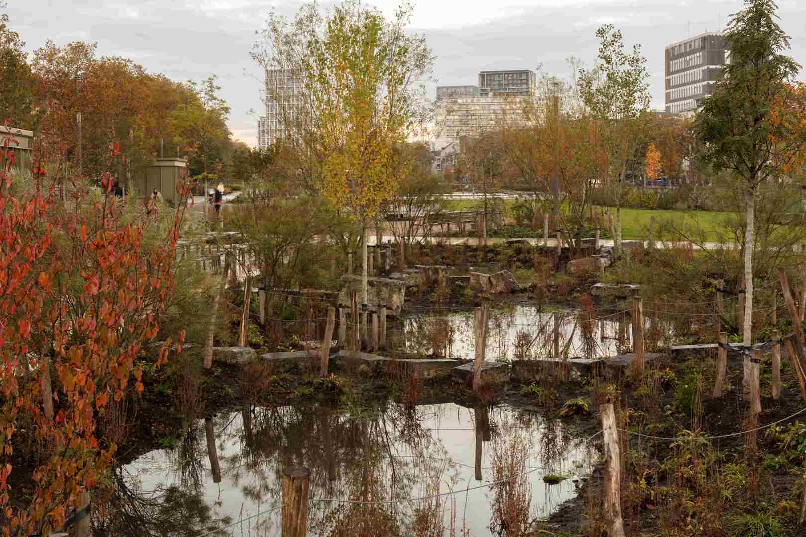 Het Zuidpark koppelt vergroening aan een doordacht regenwaterbeheer dat de veerkracht van de wijk versterkt. Een combinatie van zichtbare en verborgen ingrepen vormt één coherent watersysteem: regenwater van omliggende daken wordt opgevangen in een buffer van 1.500 m³, een drainagesysteem voedt de bomen, en onder de centrale weide zorgt een argexbuffer van 7.000 m³ voor extra opvang van wijkwater. Regentuinen en een watertuin maken deze waterstromen zichtbaar én speels. De grootschalige vergroening met 508 bomen en diverse gras en plantzones verhoogt biodiversiteit, verkoelt de omgeving en bouwt aan een robuuste groenstructuur die de stad beter wapent tegen hitte en droogte. Zo groeit het Zuidpark uit tot een klimaatrobuust park waar ecologie en stedelijke ontwikkeling elkaar versterken.