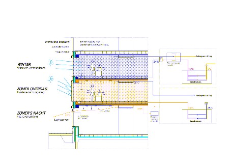 Naast het beperken van de warmteverliezen en de koellasten van het gebouw door creatieve ingrepen op het gebouwconcept en de gebouwschil, zorgt een unieke combinatie en integratie van efficiënte installaties en passieve technieken voor een aanzienlijke besparing op het energieverbruik. Het globale energieconcept is een toonbeeld van duurzaamheid waarbij de vooruitstrevende passieve koeling een hoog comfort zowel tijdens de winter- als zomerperiode garandeert. Het gebouw zal naar schatting slechts 4,7 kWh/m²•jaar voor verwarming en 5,6 kWh/m²•jaar voor koeling verbruiken of bijna een factor 10 minder dan een standaard nieuwbouwkantoor.