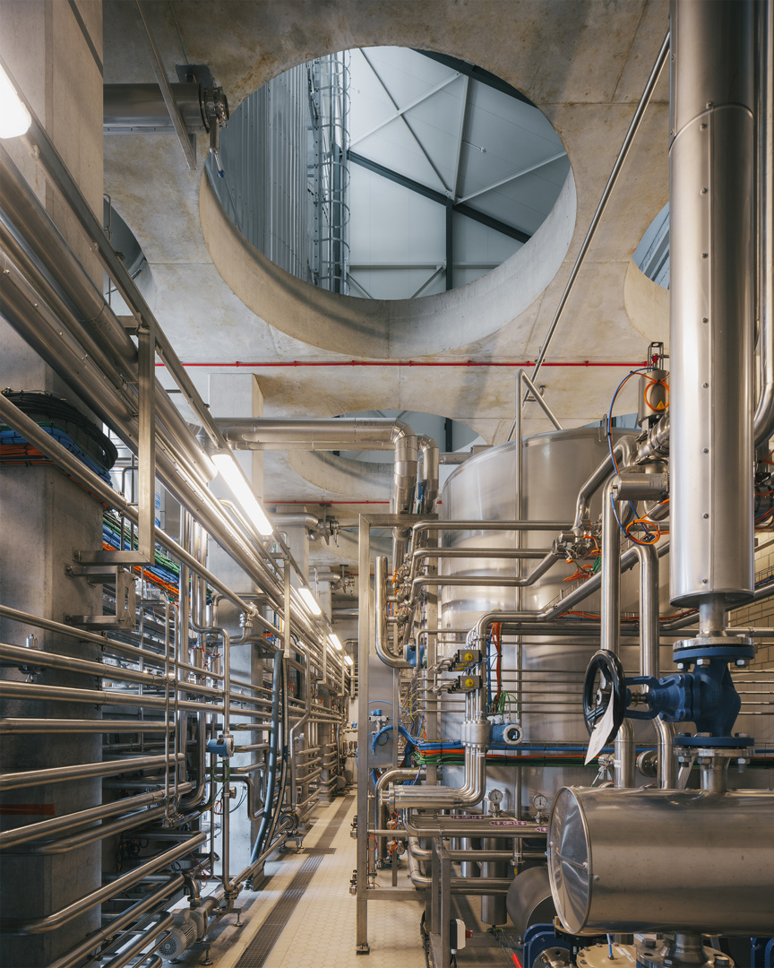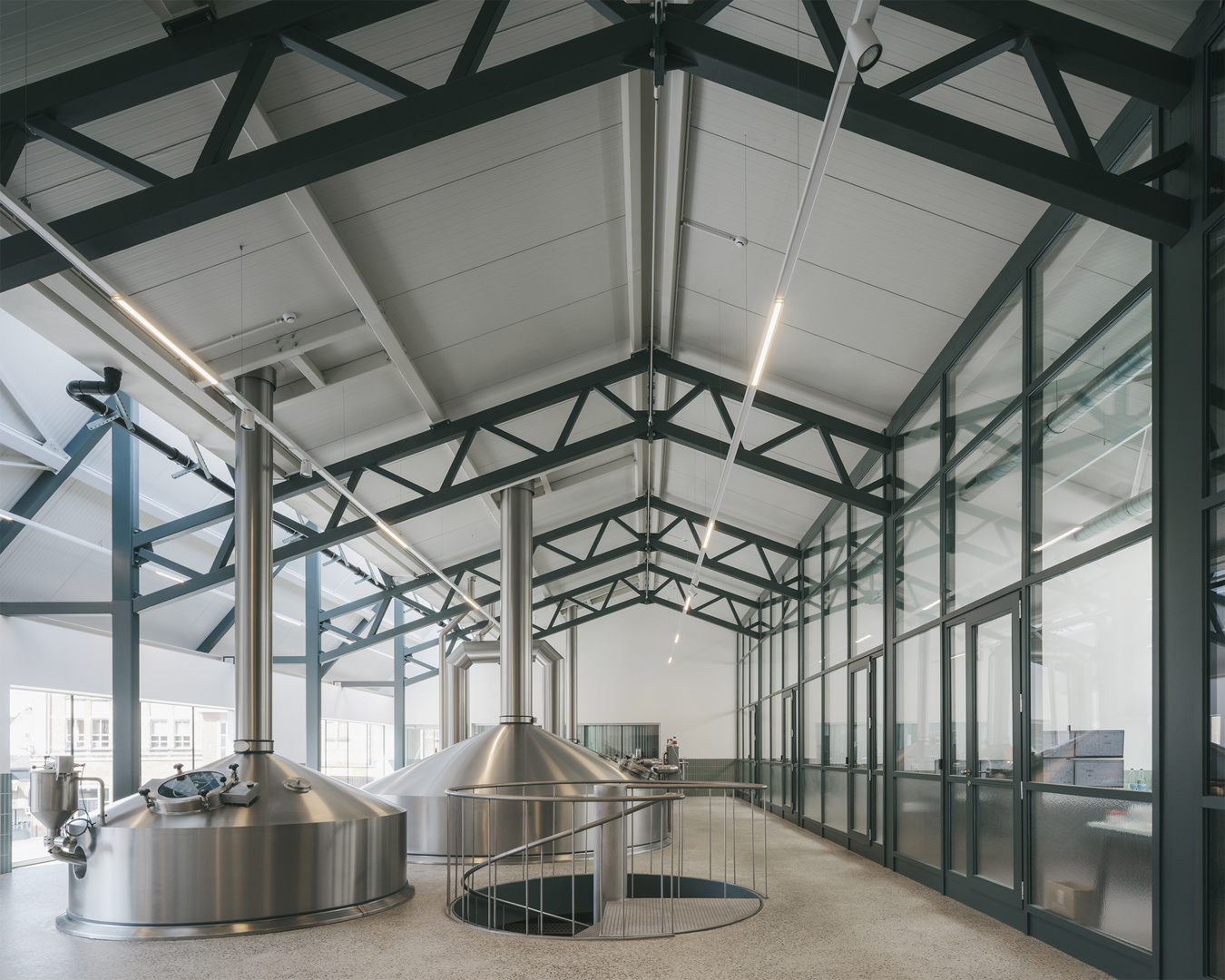 Binnenin vertrekt het ontwerp van de oorspronkelijke doorsnede. Op een robuuste betonnen tafelstructuur staan de brouwketels en gisttanks opgesteld, terwijl het gelijkvloers plaats biedt aan technische installaties. Een nieuwe staalstructuur ondersteunt het dak, waarin royale daklichten overvloedig daglicht binnenbrengen. Bovendien krijgt de bezoeker een zorgvuldig ontworpen parcours: vanaf de koer loopt een lus die via de overdekte loskade langs de brouwzaal en gisttanks naar een uitkijkplatform boven de bottelarij leidt. Zo ontstaat een traject dat productie, geschiedenis en gebouwde context op een vanzelfsprekende manier verbindt.
