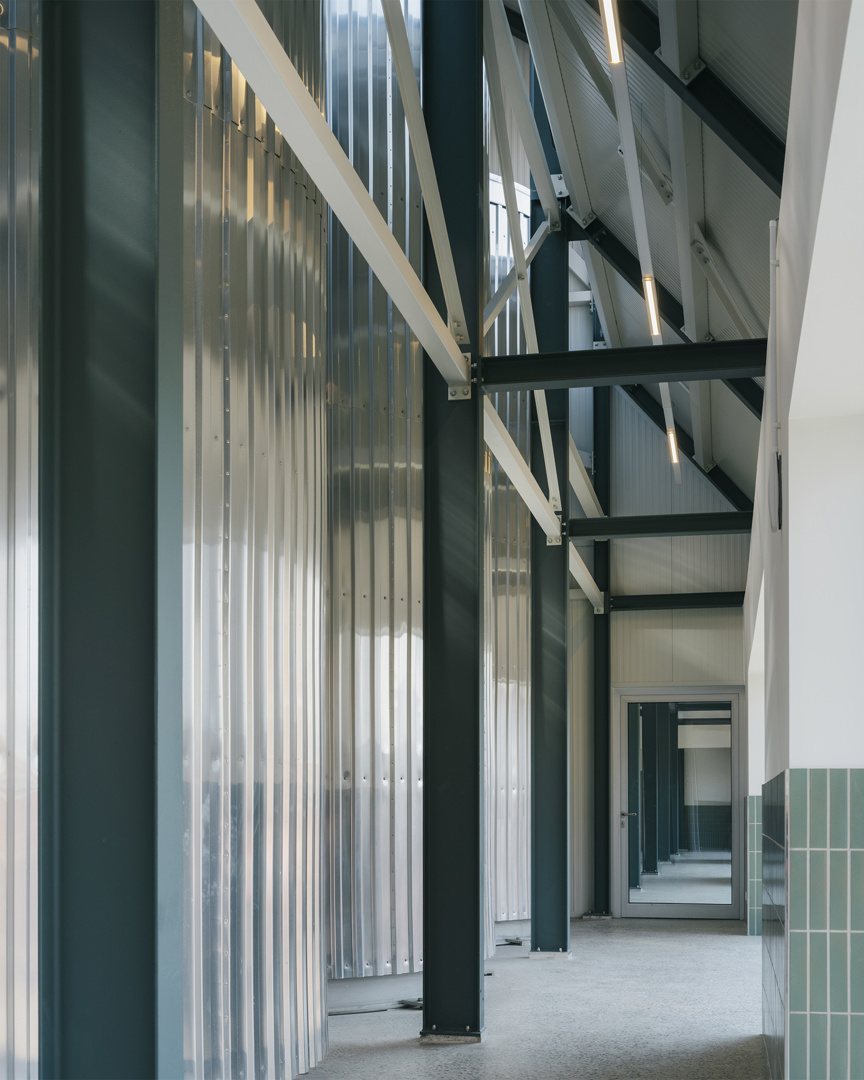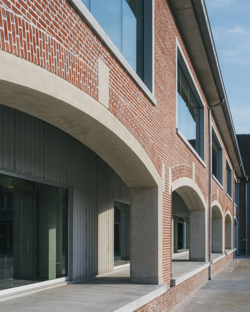 Ook in de gevelaanpassingen primeert respect voor het bestaande karakter. Vergrote raamopeningen zijn voorzien van betonnen lijsten die het ritme van de oude gevel herinterpreteren zonder die te camoufleren. Op de verdieping zorgen extra ramen voor een sterkere visuele relatie tussen interieur en koer. De vernieuwde poort, geflankeerd door een dubbele stalen ligger, fungeert tegelijk als functionele toegang en symbolische markering van een nieuwe fase in het verhaal van Brouwerij Roman—een nuchter gebaar met grote impact.