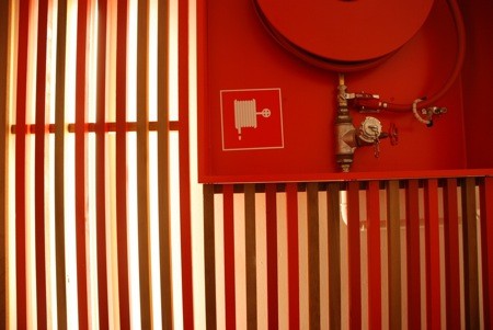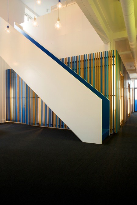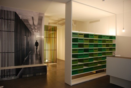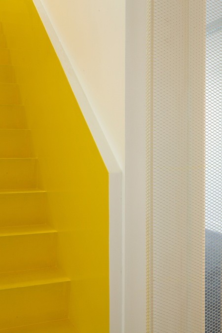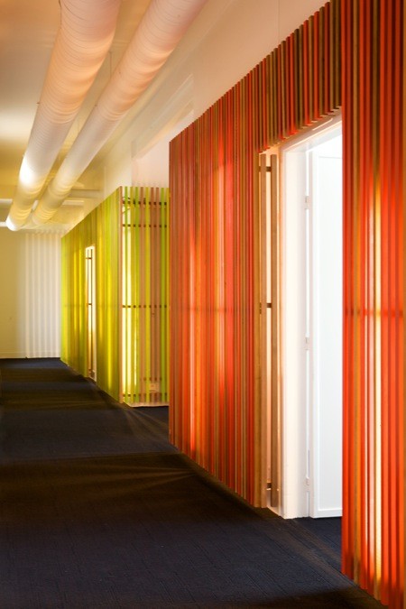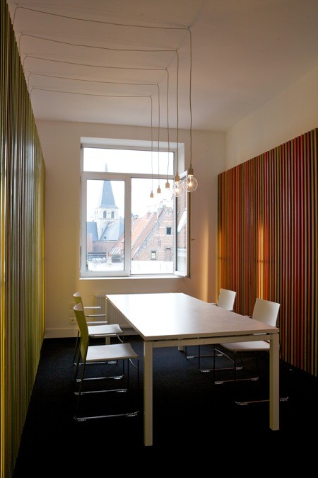 Een soortgelijke ingreep werd toegepast bij de vergaderzalen, dewelke zich op elke verdieping bevinden achter een glaswand die daglicht toelaat tot in de gang. Door de glaswand terugliggend te plaatsen en zowel de wand- als de vloerbekleding van de gang door te trekken in de vergaderruimte ontstaat er een visuele verbreding van de smalle gang. Sterker nog, de ruimte wordt niet langer ervaren als een lange, smalle gang met deuren, maar als een groot plateau waarop opeenvolgende volumes staan, als ware het kleurrijke containers. Deze visuele volumetrie creëert een gevoel van ruimte en zorgt voor herkenbaarheid.