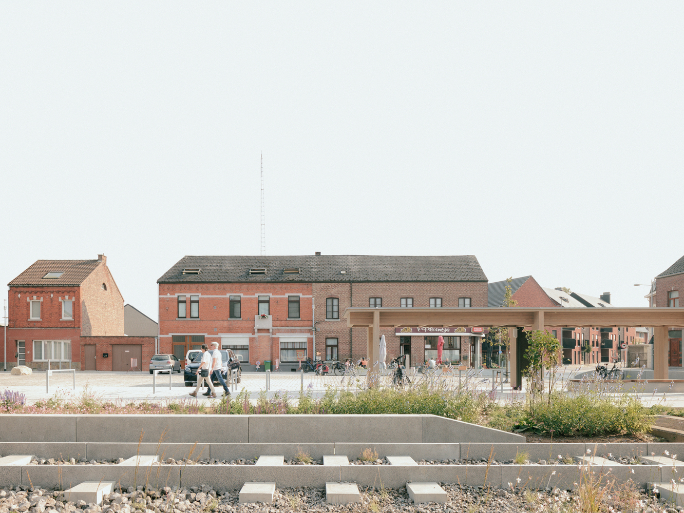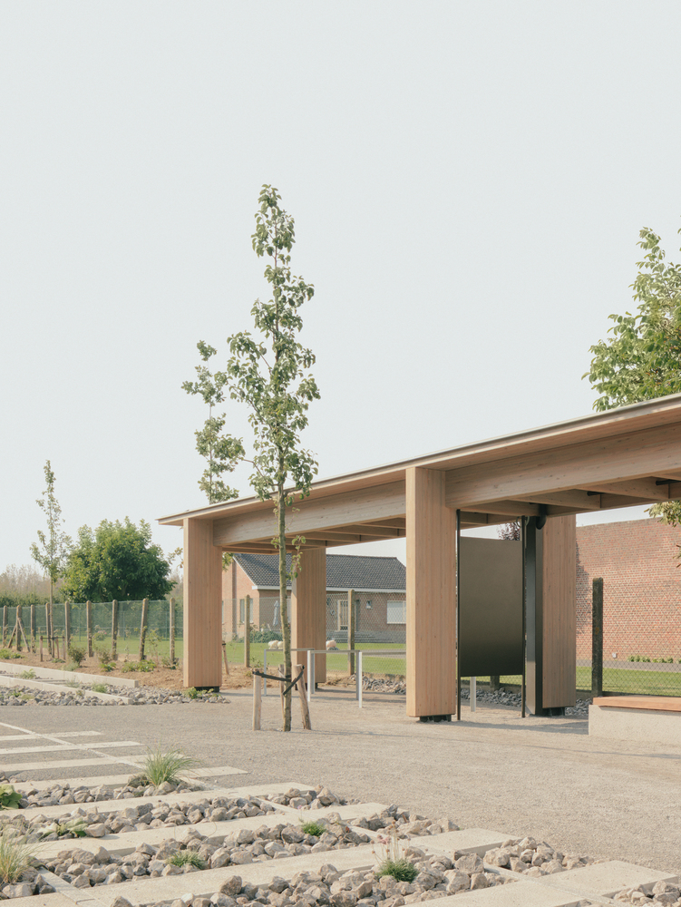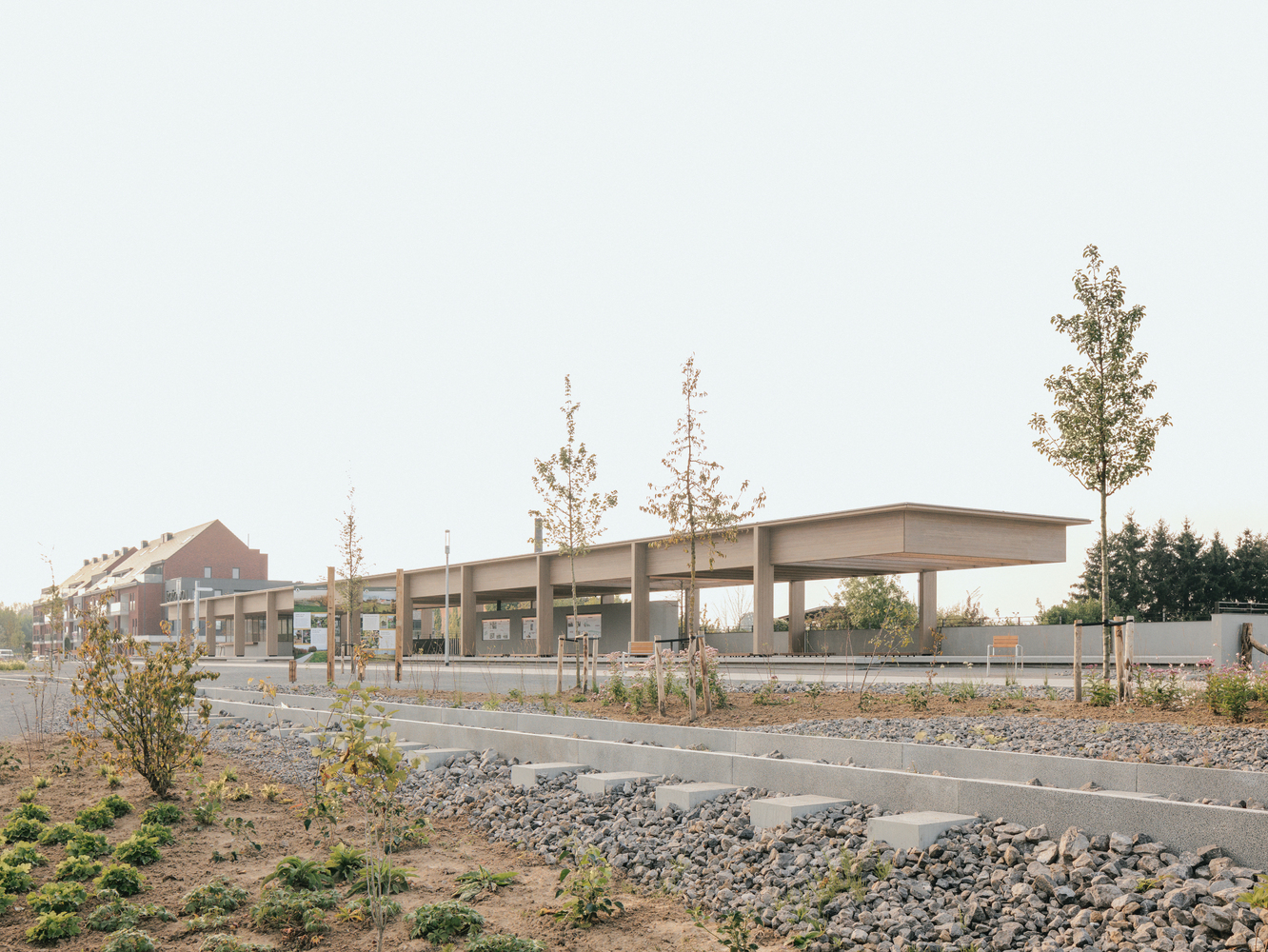 Centraal in het ontwerp staat het houten paviljoen, dat refereert aan het ritme en volume van het vroegere stationsgebouw. a2o ontwierp een langgerekt, modulair gebouw met afwisselend open, halfopen en overdekte zones. Het volume functioneert als een ‘perron’ dat geleidelijk de verschillende niveaus van de site met elkaar verbindt. Dankzij die slimme inpassing kon een parkeerruimte discreet worden ingewerkt, zonder afbreuk te doen aan de openheid van het plein. De constructie uit hout en andere duurzame materialen versterkt de link tussen erfgoed en ecologie.