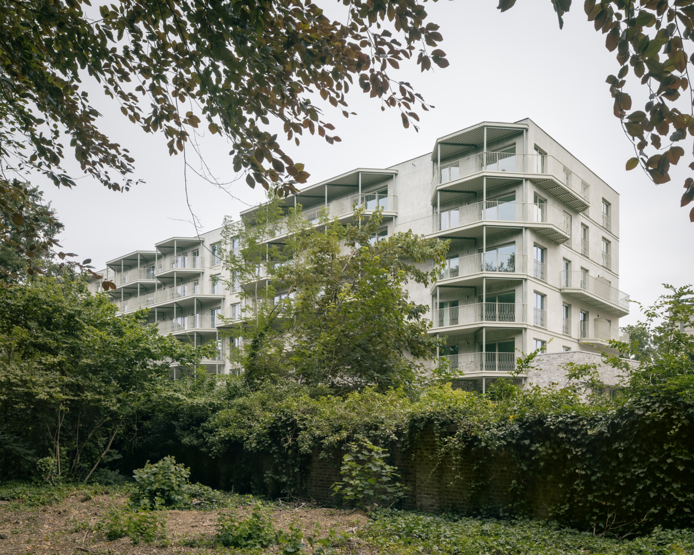 Daarnaast wordt ook het collectieve buitengebruik versterkt. De luifel boven de parking wordt ingericht als een ‘hangende tuin’, een gedeelde plek die fungeert als ontmoetingsruimte voor bewoners. In combinatie met de groene context van de naastgelegen begraafplaats ontstaat een bijzondere dialoog tussen gebouw en landschap, waarbij stedelijkheid en natuur in elkaar overvloeien.