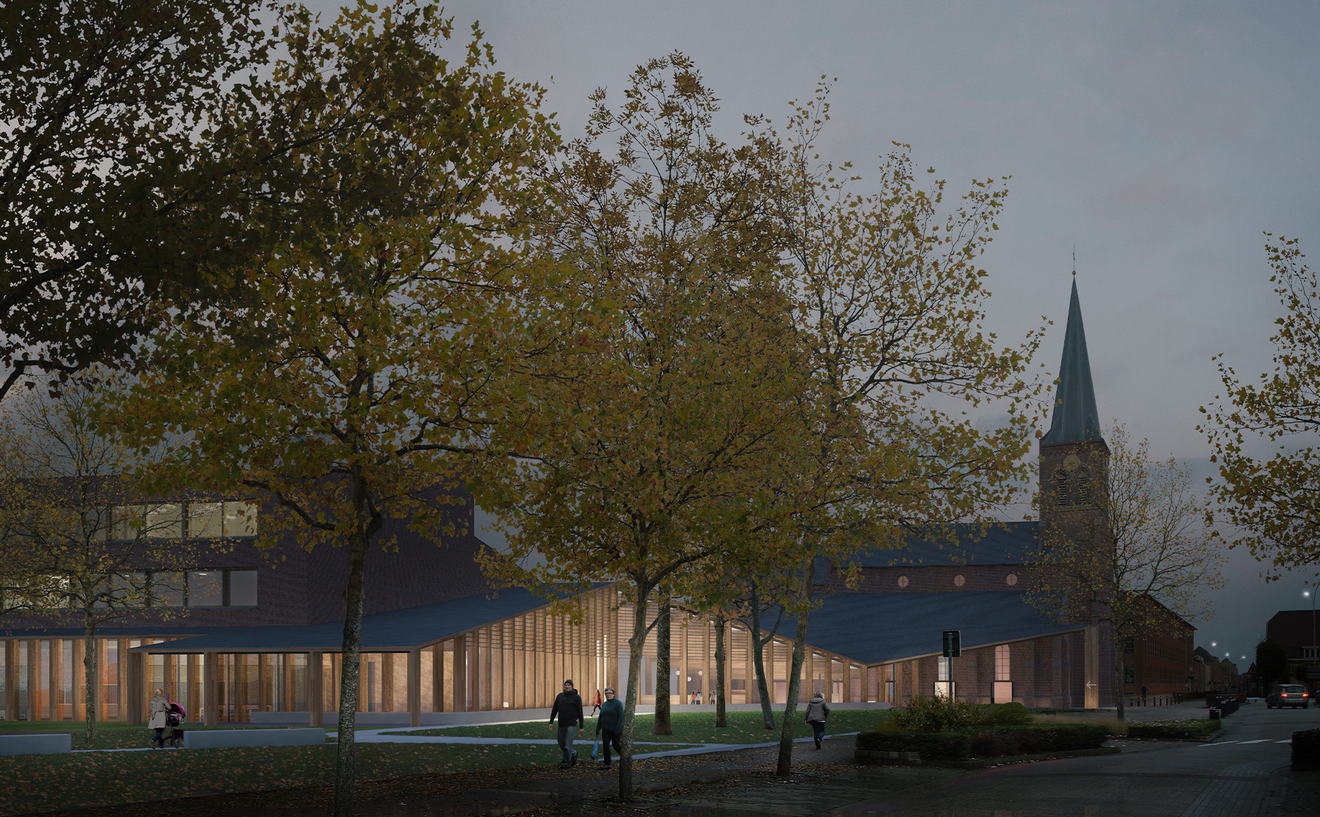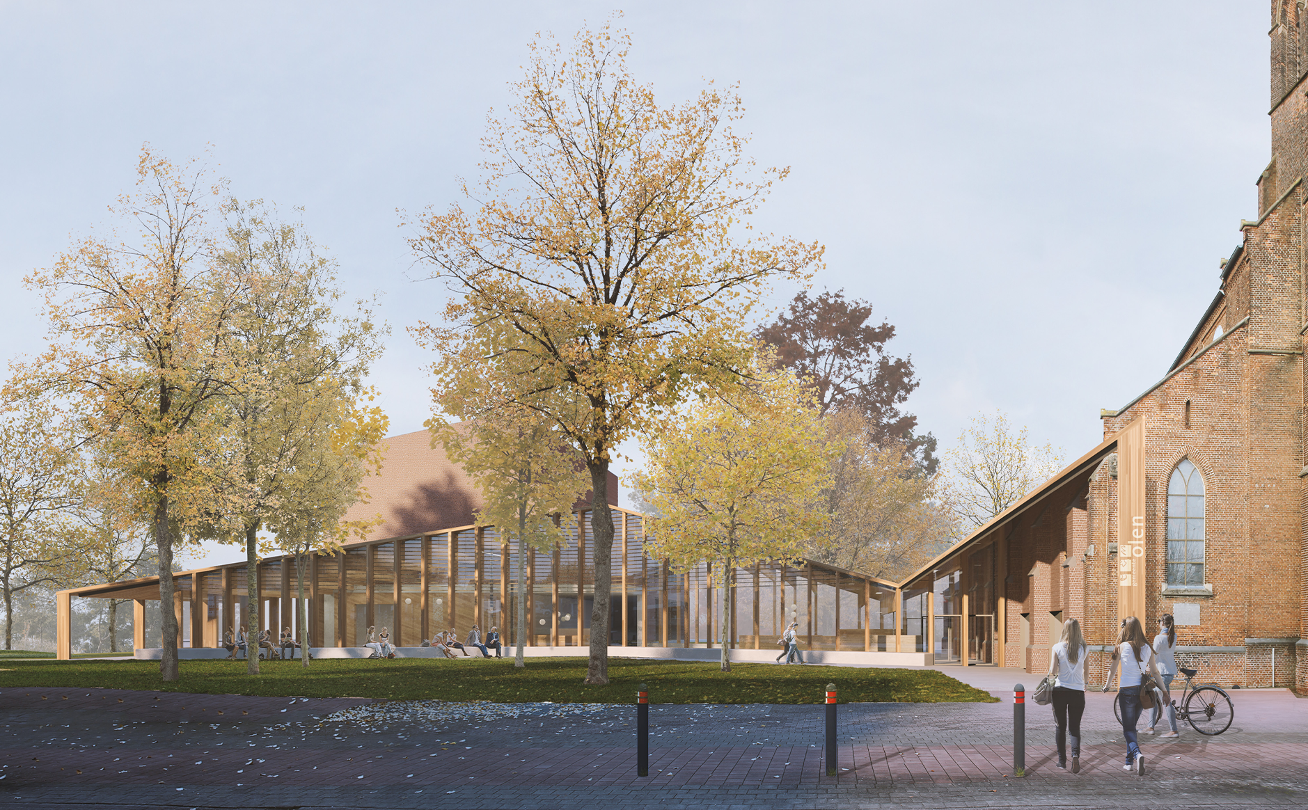 Het bouwprogramma vraagt, naast een nieuwe invulling van de kerk, ook om de realisatie van een nieuw gebouw. Het nieuwe hoofdvolume wordt net als de kerk gebouwd als een skelet met een massieve kern, en neemt ook de meer massieve uitstraling van het kerkvolume over en wordt voorzien van een roodbruin gekleurde, bakstenen gevelafwerking. Het nieuwe volume is een herinterpretatie van de schuine dakstructuren van de kerk en op een evenwicht tussen open en gesloten gevelvlakken. Het behoud van het waardevolle bomenbestand in de pastorietuin en de versterking van de groene zone binnen het dorpsweefsel staan voorop bij de positionering van de volumes.
