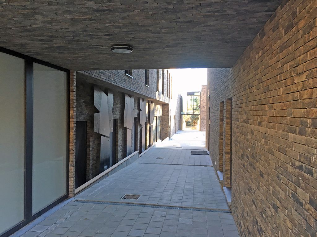 Het was ook de bedoeling dat elke leefgroep een privétuin zou hebben. A33: “We wilden niet dat deze tuinen gewoon een stuk van het park waren met een draad errond, zoals het vroeger was. Door het gebouw U-vormig uit te werken, kregen we 2 beschutte buitenruimtes: eentje tussen de bestaande tuinmuur en het gebouw, en eentje in het midden van de U. Zo krijg je een samenspel van 4 leefgroepen rond een binnenstraatje.”