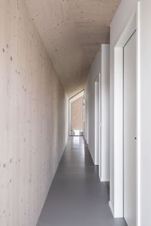 De woning ent zich middels haar speciale dakvorm en volumetrie op de omgeving: bescheiden en introvert langs de straatkant, open en extravert naar het landschap. Het dak heeft een vliegerstructuur en is zelfdragend, vandaar ook de keuze om de gehele verdieping in CLT uit te voeren. Dit vroeg om een doorgedreven detaillering en ingenieurschap waarvoor Martens Van Caimere Architecten samenwerkte met studiebureau Declerck & Partners: hoe eenvoudiger het detail, hoe complexer.