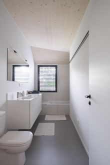 Naar integrale toegankelijkheid werd haaks op het hoofdvolume een slaapkamer met badkamer en toilet voorzien uitkijkend op het heuvellandschap.