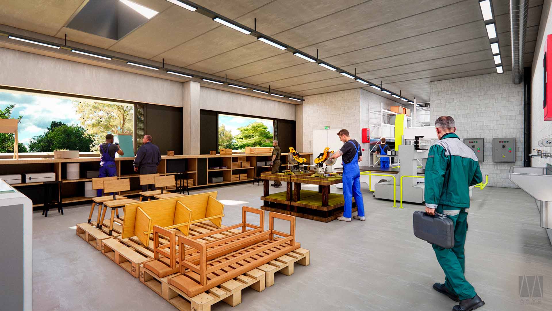 De centrale binnenplaats krijgt een actieve rol als logistiek knooppunt en ontmoetingsplek. Rondom worden de verschillende functies georganiseerd: werkplaatsen, opslagruimtes, bureaus en technische installaties. Zo ontstaat een leesbaar en coherent geheel dat tegelijk robuust en uitnodigend oogt. De architectuur ademt streekgebondenheid én hedendaagse efficiëntie uit.