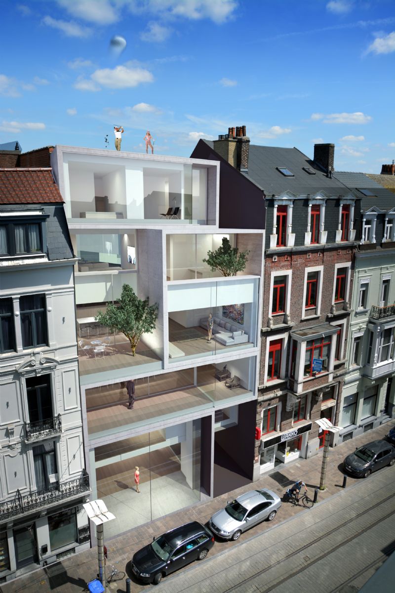 Gestileerde, strakke blokken op elkaar gestapeld: het Brugse architectenbureau Govaert & Vanhoutte ging resoluut voor een ultramodern concept. Door zowel op de voor- als de achtergevel het principe van de Gulden Snede toe te passen, bewaarden ze de link met de historische gebouwen in de Vlaanderenstraat. "We hebben de Vlaanderenstraat goed bestudeerd," vertelt architect Benny Govaert. "Zo ontdekten we dat alle 19de eeuwse gevels in de straat ontworpen zijn volgens de Gulden Snede. Dat principe van ideale verhoudingen komt in ons ontwerp zowel in de voor- als de achtergevel terug. Op die manier konden we een hedendaags gebouw uittekenen dat toch volledig op zijn plaats is in zijn omgeving." Het gebouw werd ingedeeld in een handelsruimte, drie appartementen en een penthouse. De handelsruimte bevindt zich op de benedenverdieping en een stuk van de eerste verdieping. Ook de andere appartementen zijn verdeeld over de twee verdiepingen. Het nieuwe gebouw is ontworpen in samenspraak met de stad Gent, maar een bouwvergunning zit nog in de pijplijn.