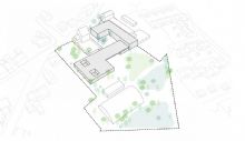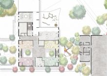 Aan de achterzijde van het perceel opent het landschap zich naar de omliggende weilanden. Door de achtergevel van de school evenwijdig met de groene speelzone in te planten, creëren de ontwerpers een permanente interactie tussen de school en deze omgeving en versterken ze de relatie met het groen. Door de centrale eetzaal volledig in glas te voorzien ontstaat er bovendien een doorzicht vanop de speelplaats van de lagere school naar de groene speelzone. Het maximaal behoud en de versterking van het groen op de site is een belangrijk uitgangspunt in de ontwerpvisie. Waardevolle bomen worden zoveel als mogelijk in het ontwerp geïntegreerd en aangevuld met nieuwe aanplantingen.