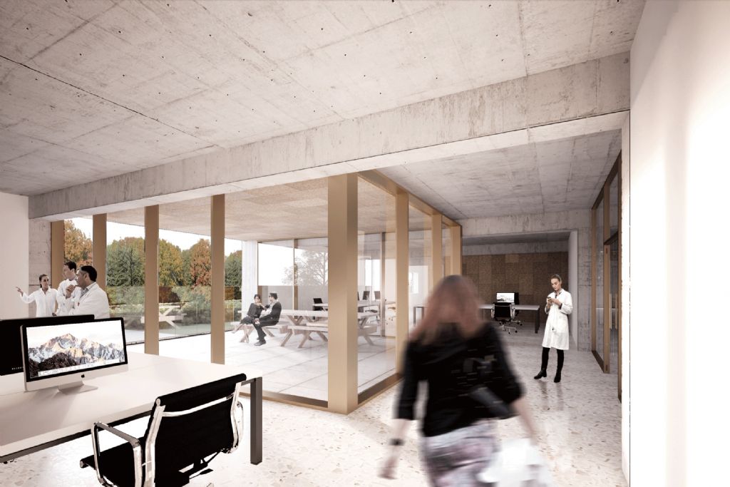 De mogelijkheid tot vlotte uitbreiding van het gebouw vormt een belangrijk vertrekpunt bij het ontwerp. Het gevraagde programma wordt geconcentreerd en georganiseerd op een deel van de gegeven footprint, een ander deel wordt gevrijwaard. Abscis Architecten kiest ervoor om de toegestane vijf bouwlagen te benutten: de weid uitgespreide site van de campus met veel (groen)ruimte tussen de gebouwen nodigt hiertoe zeker uit. De ontwerpers streven hierbij naar een compacte, duidelijke gebouwlay-out.