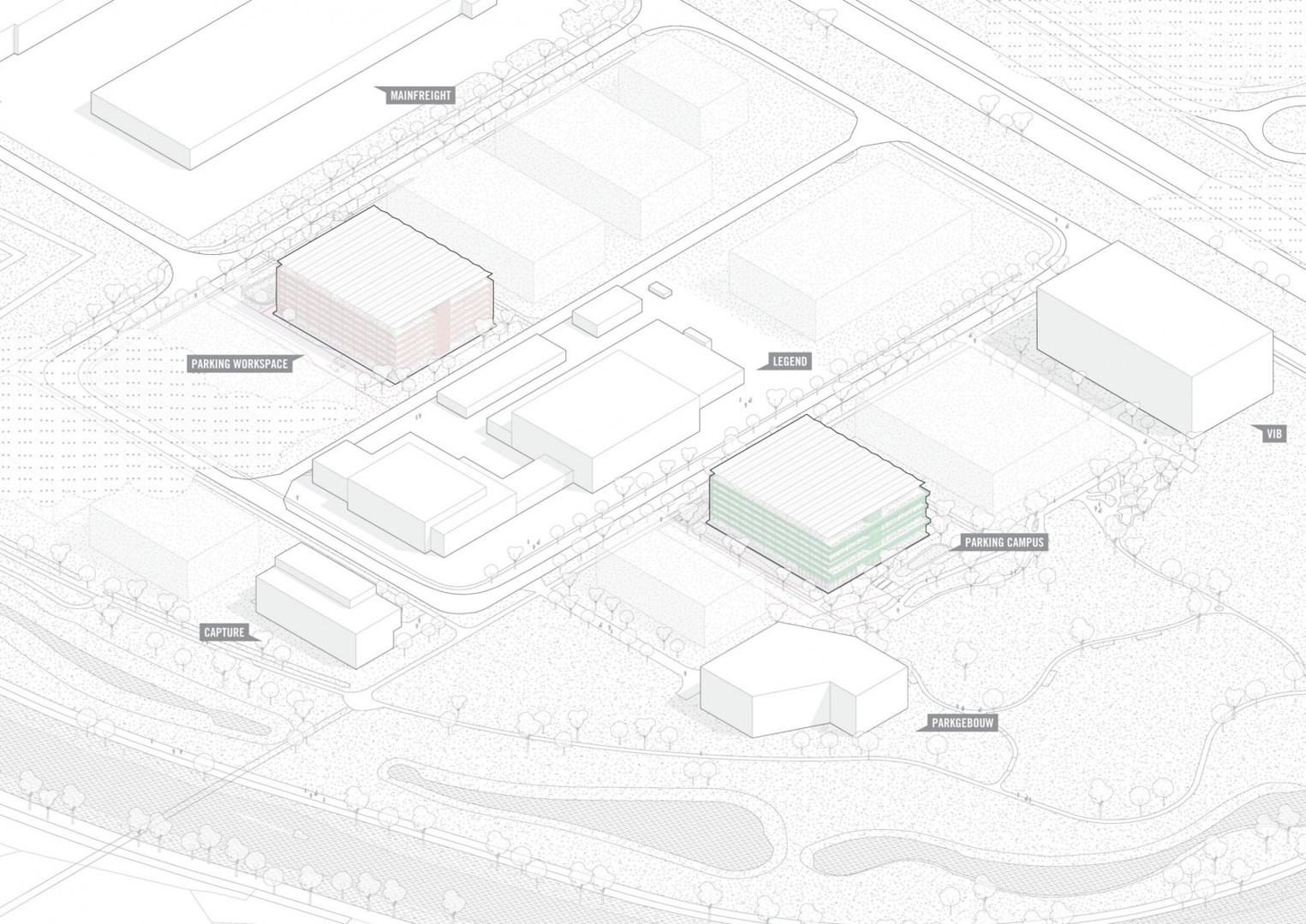 Het Eiland Zwijnaarde ligt in een groen en strategisch gesitueerd deel van Gent, omringd door Ringvaart, Tijarm en BovenSchelde. Binnen dit grotere geheel, Tech Lane Gent, worden zones ingericht volgens specifieke noden: Logistics, Workspace en Campus. De nieuwe parkeergebouwen volgen deze indeling en krijgen daarom de namen Parking Campus en Parking Workspace. Hoewel beide constructies op dezelfde structuur zijn gebaseerd, varieert hun verschijningsvorm subtiel. Zo krijgt elk gebouw een eigen identiteit door het gebruik van verschillende kleuren voor borstweringen en traphallen, terwijl de witte dakstructuur met geïntegreerde PV-panelen zorgt voor een visueel verbindend element.
