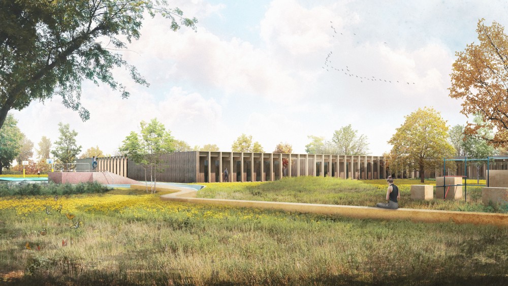 Langs deze levenslijn ontvouwen zich diverse activiteiten, van een hangplek en freerun-parcours tot een sportveld, skatezone en DJ-booth. Naar het noorden toe verbreedt het landschap en vloeit het over in een boomgaard die aansluiting zoekt bij de kinderboerderij. Zo ontstaat een gelaagd buitenlandschap dat meegroeit met de leefwereld van de jongeren en ruimte laat voor beweging, ontmoeting en herstel.