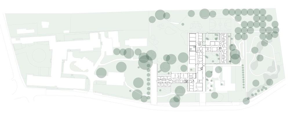Het perceel op de site Mater Dei wordt gekenmerkt door een parktuin, omringd door landerijen en bestaande zorggebouwen. Abscis Architecten koos ervoor het nieuwe volume in één bouwlaag te realiseren, in analogie met het Zusterhuis, om de schaal bewust laag en leesbaar te houden. Het gebouw wordt rond dit Zusterhuis ingeplant, waardoor een nieuwe centrale toegang en een pleintje ontstaan waar onthaal en inkom van de K-dienst samenkomen.