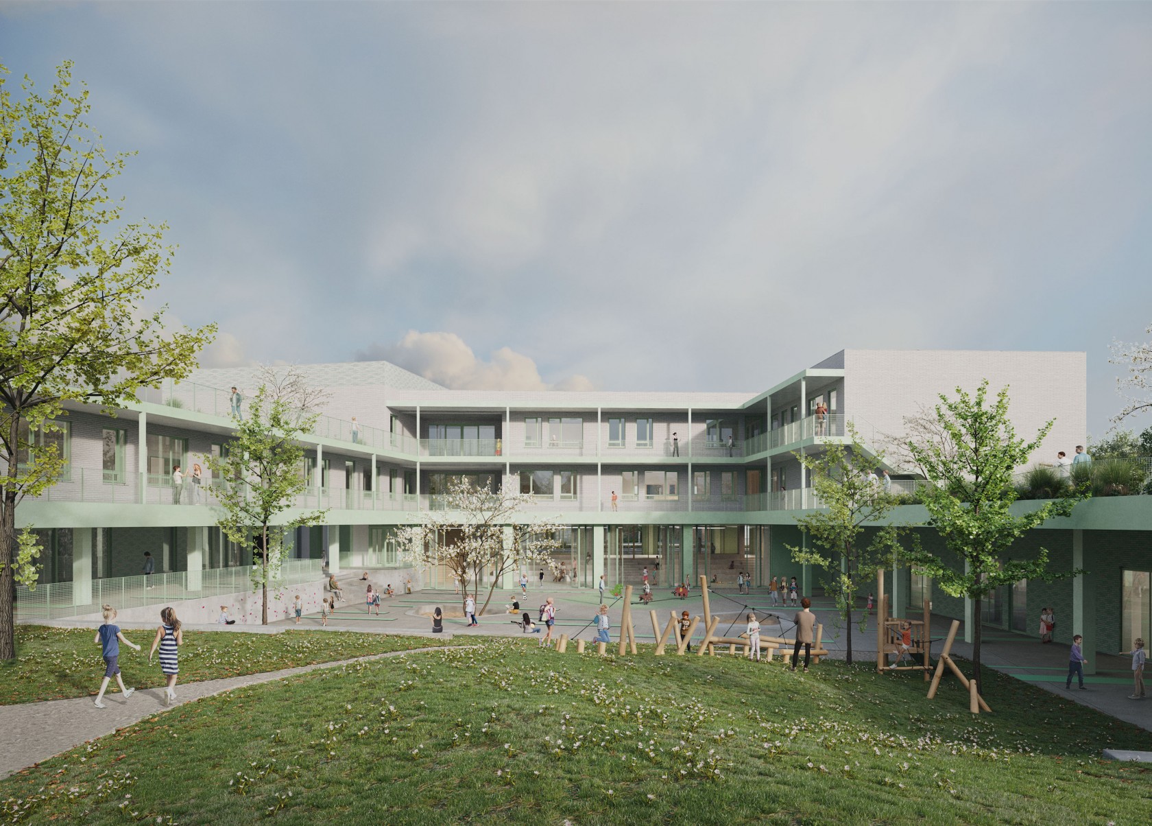 De groene speelzone en de kloostertuin vormen samen de ruggengraat van het ontwerp. Verschillende zichten op het groen, zowel vanuit de publieke ruimte als vanuit de school, bepalen de uitstraling van de campus. Door het aanwezige hoogteverschil tussen de kloostertuin en het inkomplein slim te benutten, ontstaan diverse speel- en leerzones voor verschillende leeftijden, aangevuld met zitbanken, speelelementen en een buitentribune die de centrale speelplaats voor kleuters omarmt. Zo wordt de buitenruimte niet alleen functioneel benut, maar ook ruimtelijk gelaagd en betekenisvol gemaakt.