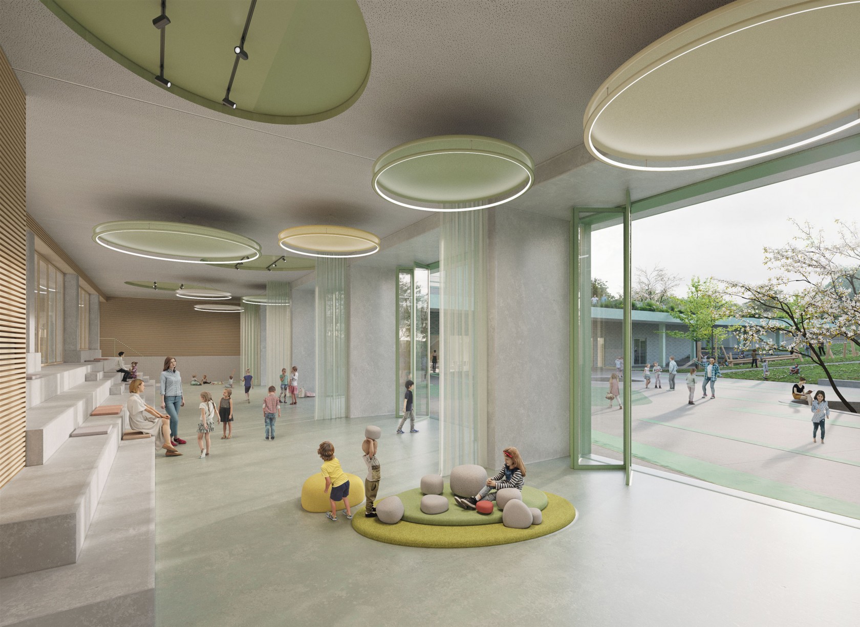 Ook naar de publieke ruimte toe zet het ontwerp in op openheid. De gebouwen communiceren met hun omgeving via ruime raampartijen en een uitnodigende opzet. Vanuit de school kijk je uit over het landschap, terwijl de buurt zicht krijgt op het levendige hart van de campus. Zo ontstaat een voortdurende wisselwerking tussen leren en ontmoeten, tussen geborgenheid en openheid.
