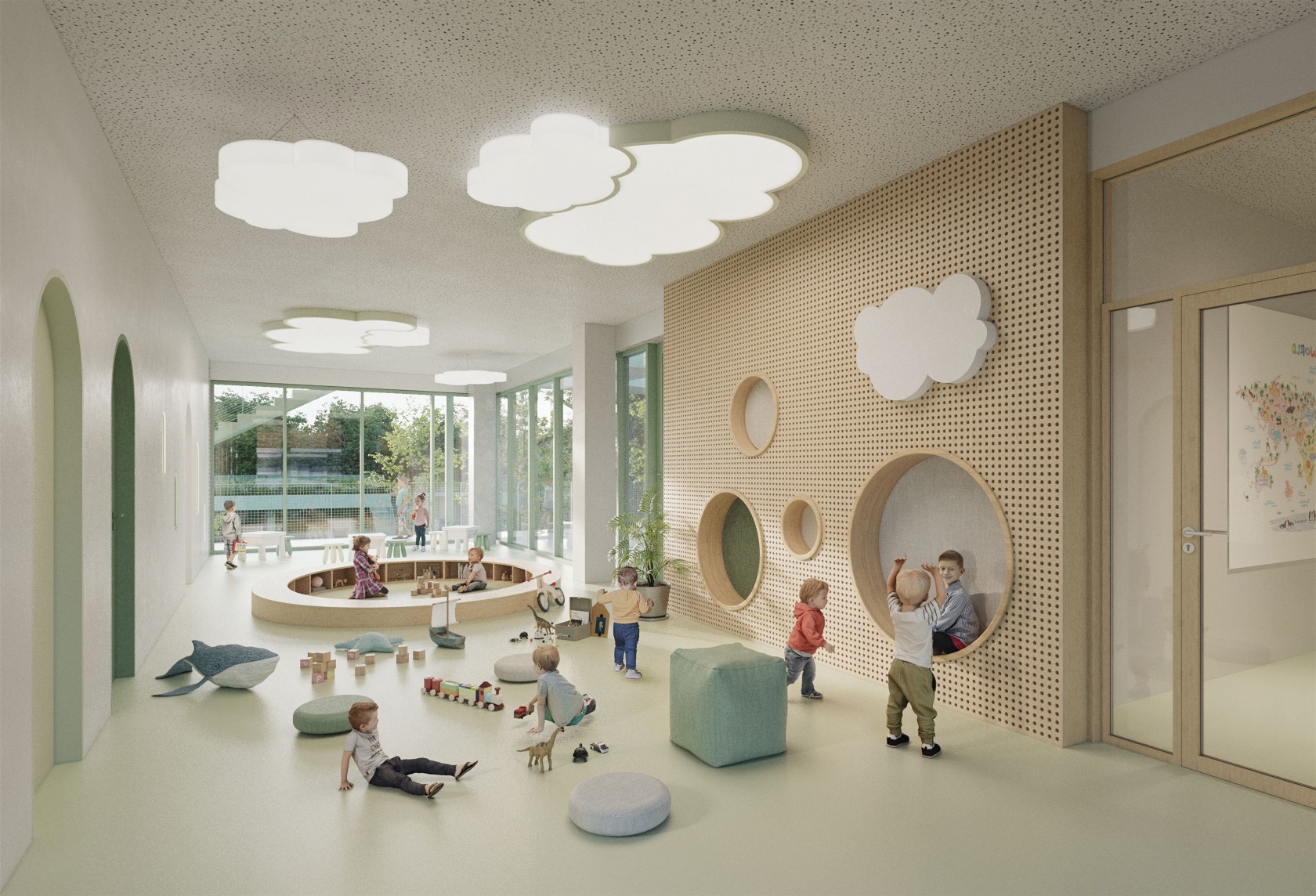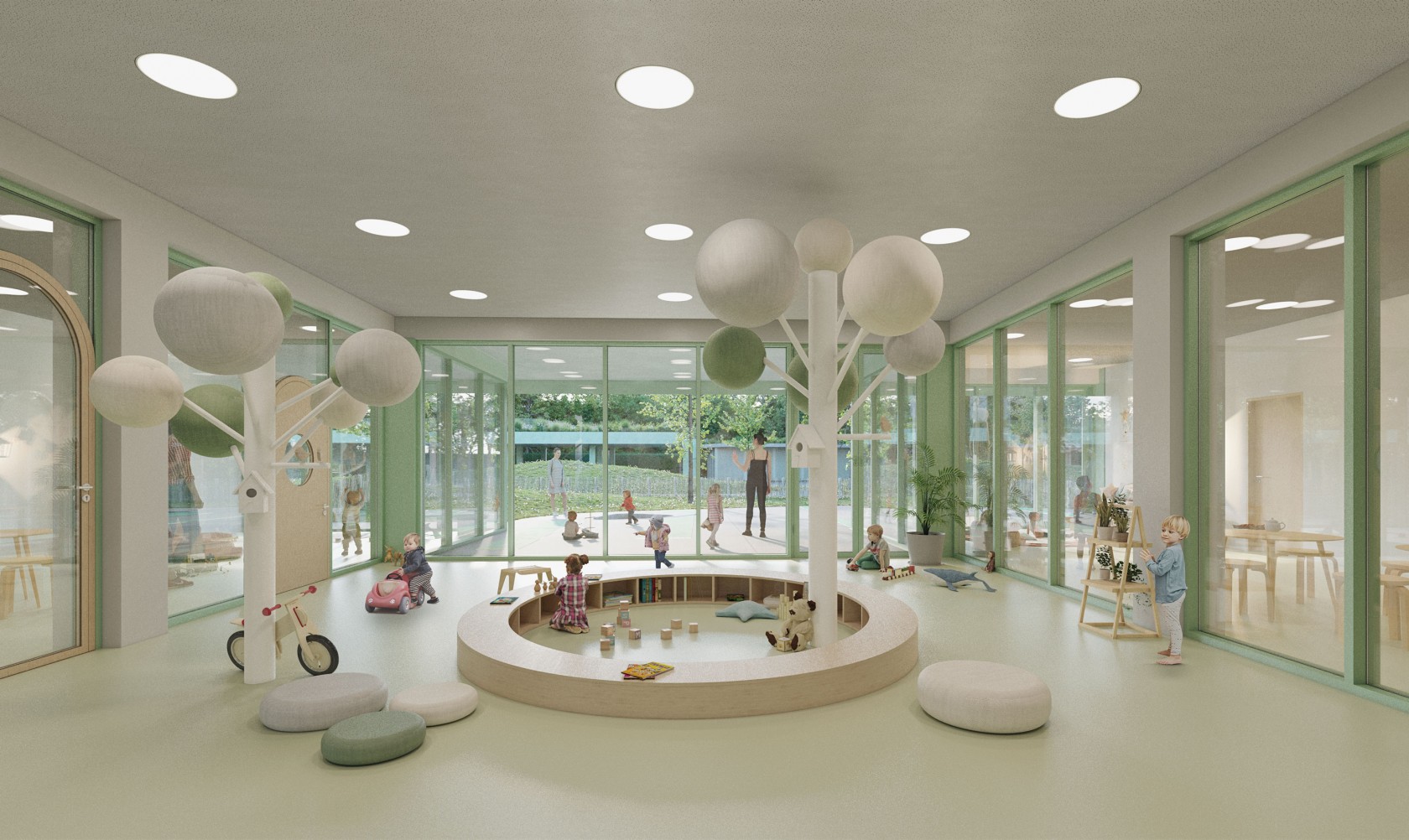 De organisatie van het kinderdagverblijf is zo opgevat dat spelen, leren en ontdekken een vanzelfsprekend geheel vormen. De verschillende functies – ontvangstruimte, polyvalente zaal, lokalen – zijn helder georganiseerd rond een centrale circulatie-as, steeds met een directe connectie naar de buitenruimte. Deze transparantie verhoogt niet alleen het comfort, maar stimuleert ook de zintuiglijke beleving en de zelfstandigheid van de kinderen.