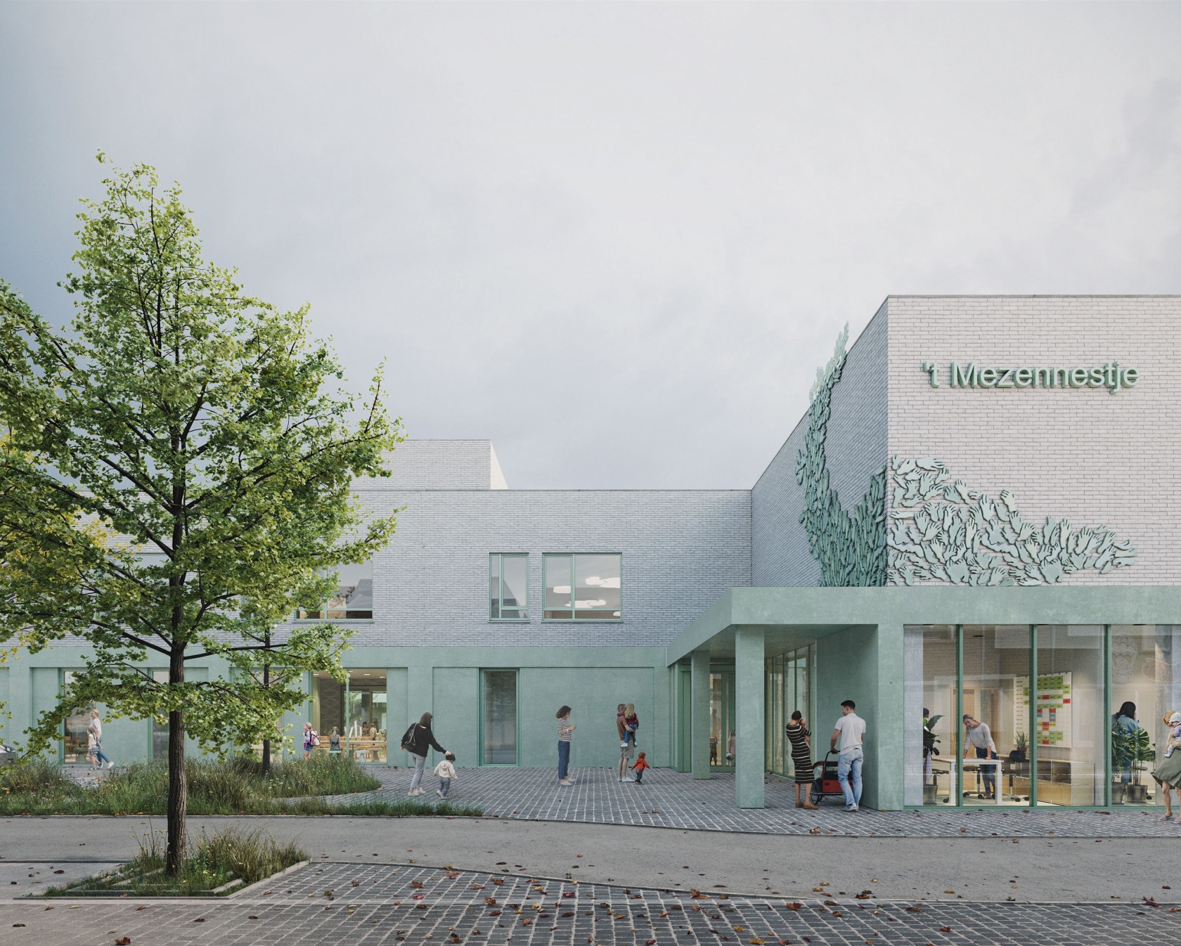 Ook het kinderdagverblijf ’t Mezennestje kreeg een ontwerp dat de grens tussen binnen en buiten zo veel mogelijk opheft. Al bij het binnenkomen word je getrakteerd op een breed zicht over de groene speelzone. Grote openingen, een drempelloze opzet en een eenvoudige, duidelijke structuur zorgen ervoor dat zelfs de kleinste gebruikers intuïtief hun weg vinden en zich onmiddellijk thuis voelen.