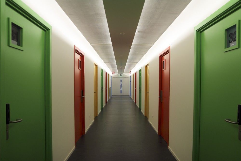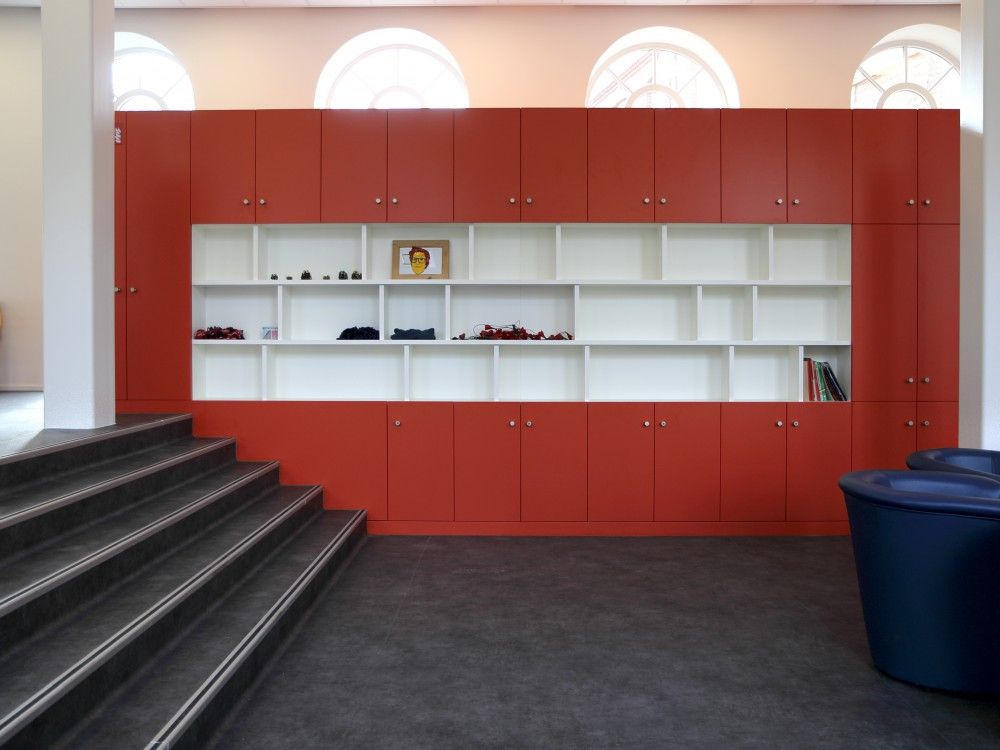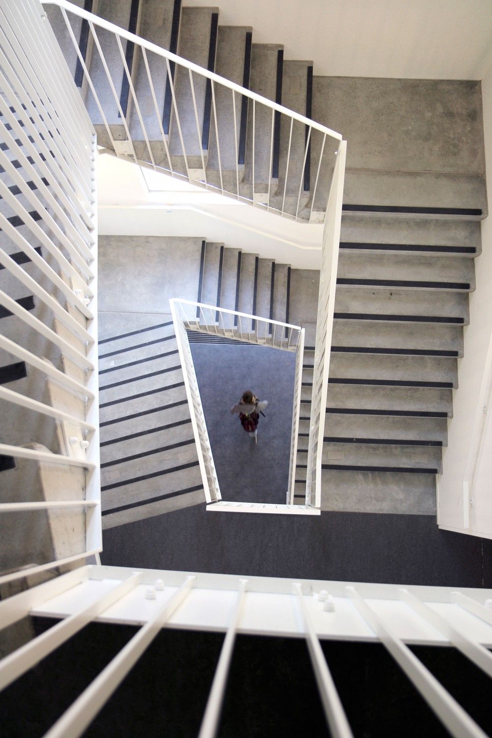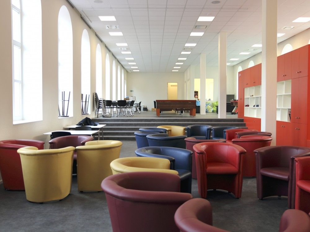 De huidige vloerniveaus werden aangehouden om aan te sluiten op de school, waarmee een lift en trappenhuis gedeeld wordt. Trapjes en een helling overbruggen op het gelijkvloers het hoogteverschil met de bestaande vloerpas en verdelen de ontspanningsruimte in diverse plekken.