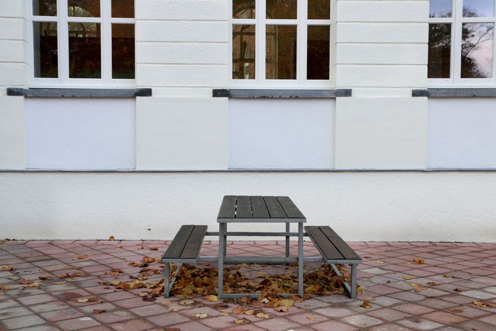 De eetzaal van de refter kreeg rondom een vliesgevel met transparante glasvlakken en opake sandwichpanelen met houten bekleding. Een opvallende inclinatie maakt deel uit van he dak, wat het solitair karakter van het gebouw versterkt.